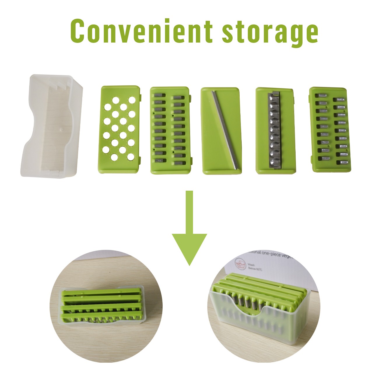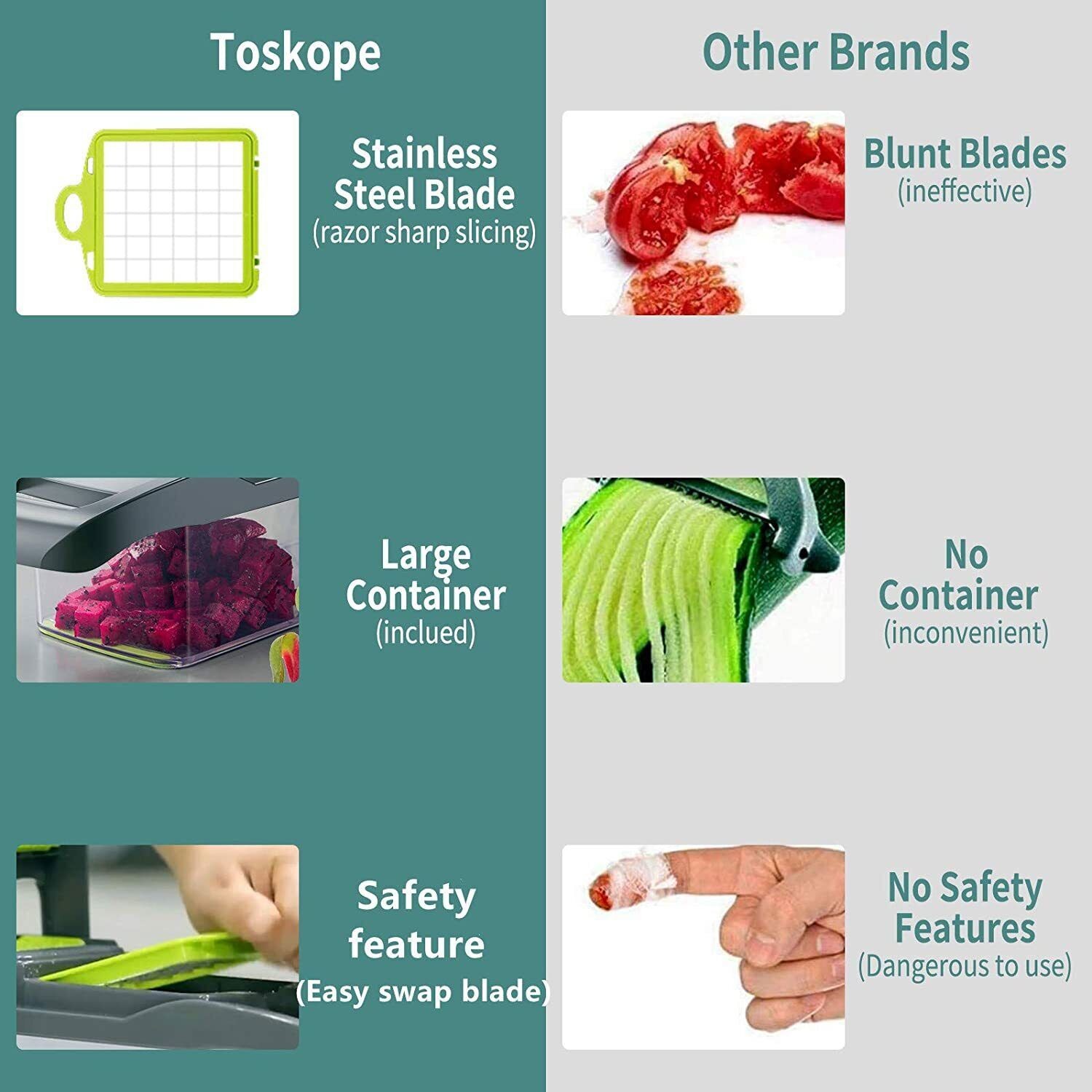 vegetable cutterVerwenden Sie den Handschutz und zerkleinern Sie Ihre Zutaten gründlich. Keine Schnitte und Druckstellen mehr beim Zerkleinern von Möhren, Kartoffeln und anderem Obst und Gemüse. Alles wird direkt im Behälter aufgefangen, was das Kochen erleichtert. |