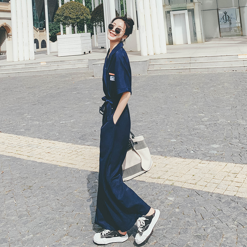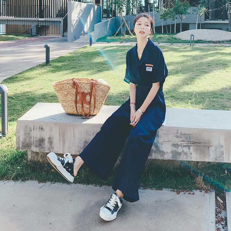 Niche Design Tooling Loose Drape V-neck Straight-leg Jumpsuit