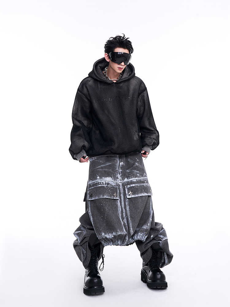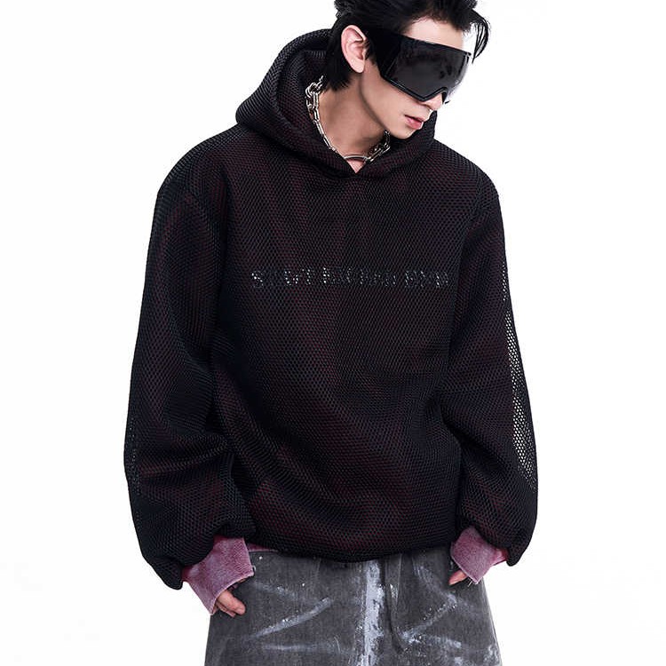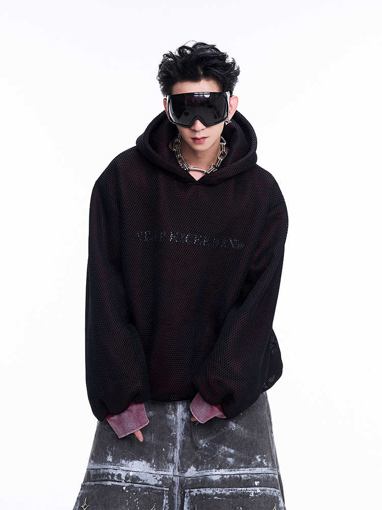 Niche Hollow Out Knitmesh Hooded Fleece Lined Sweater