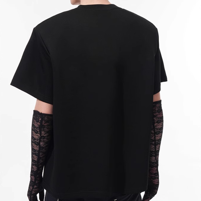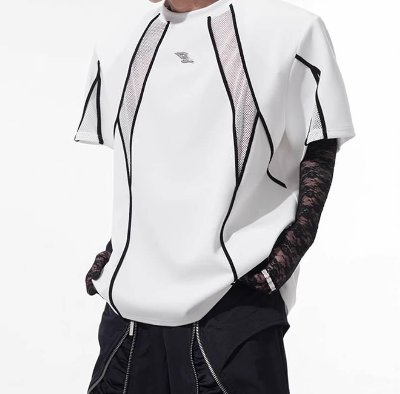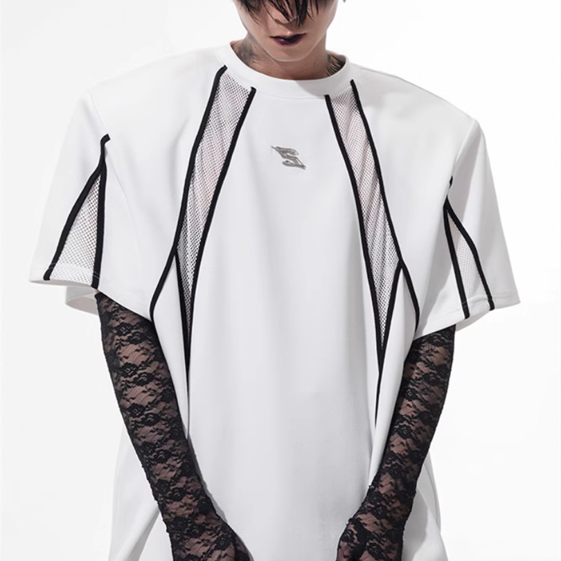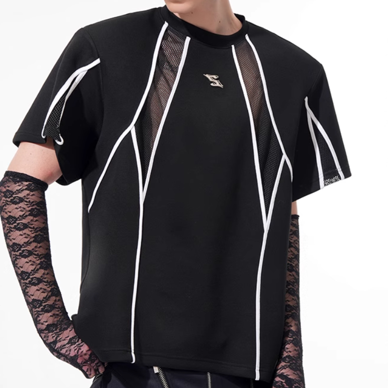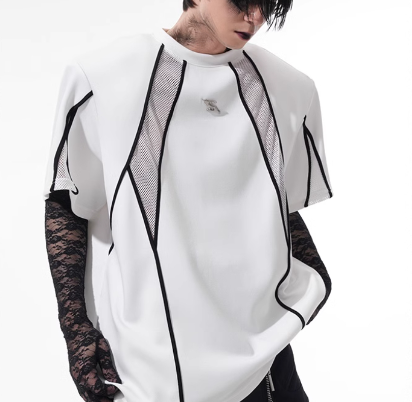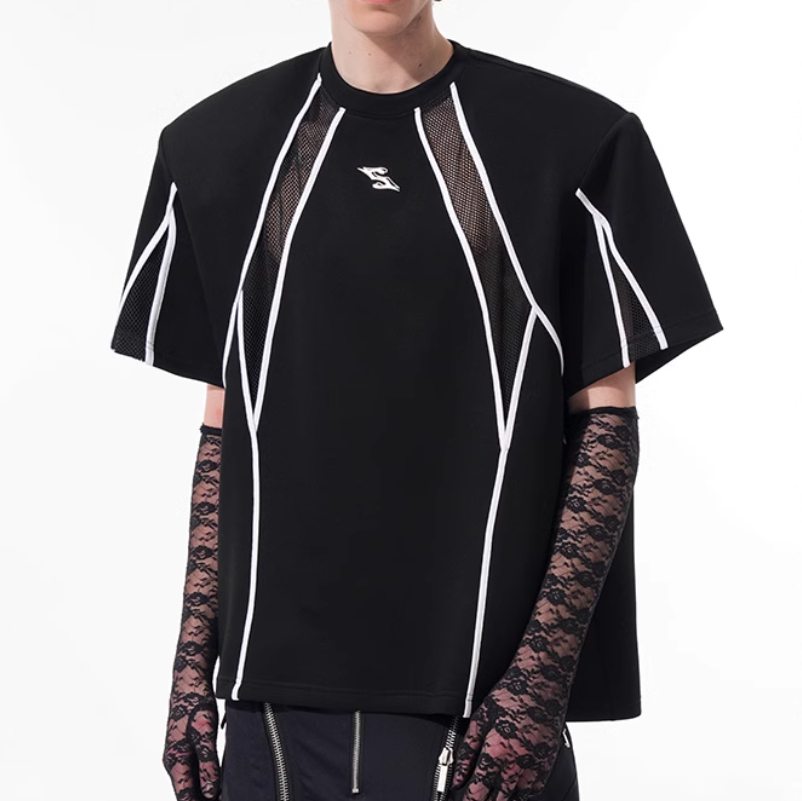 Niche Mesh Hollow Stitching Padded Shoulder Black T