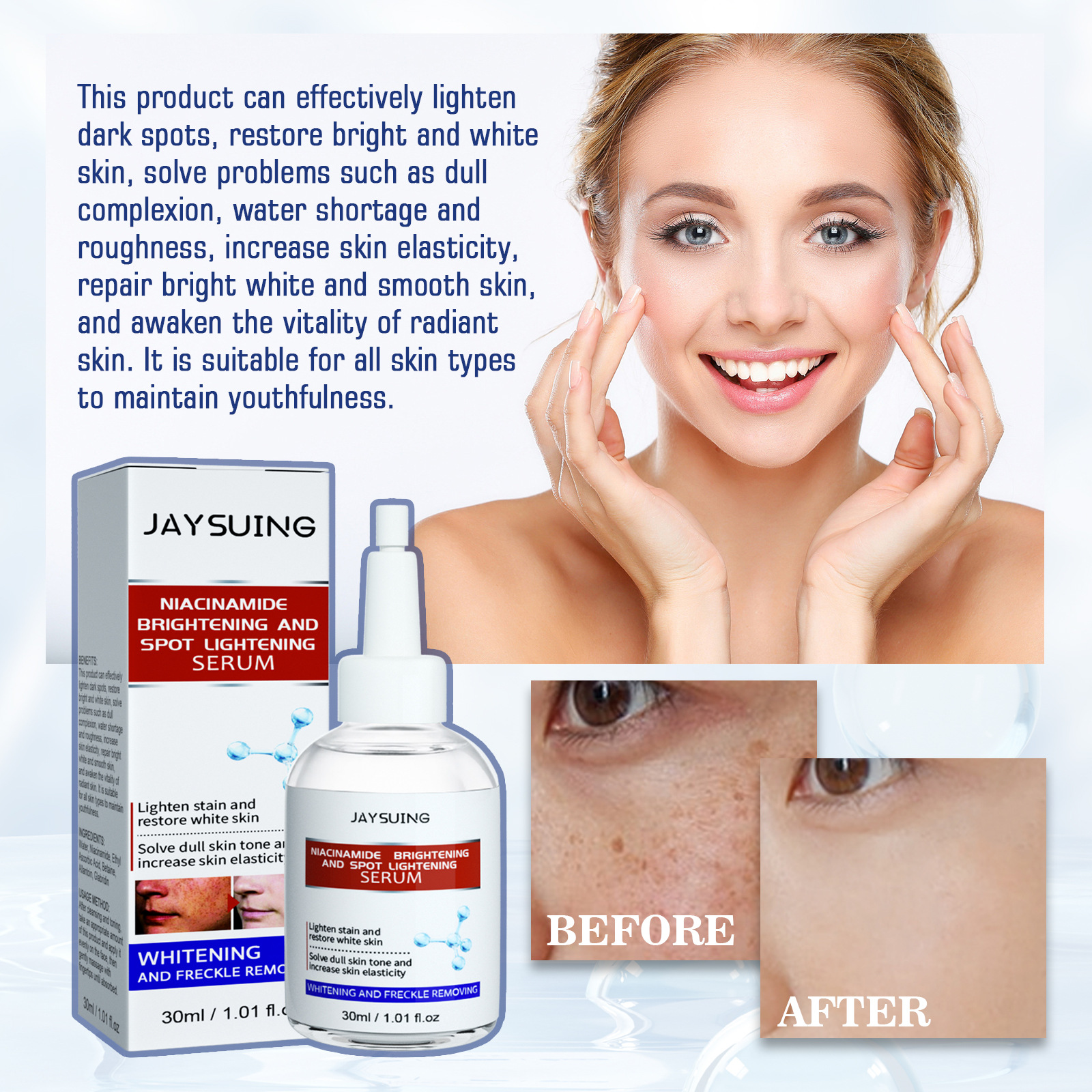 Ingredients: Water, nicotinamide, ethyl ascorbic acid, betaine, allantoin, guanggan