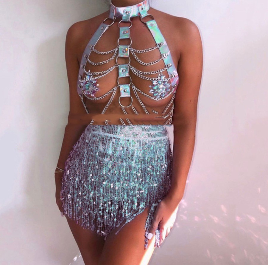 Color: silver body chain+skirt suit pink body chain+skirt suit