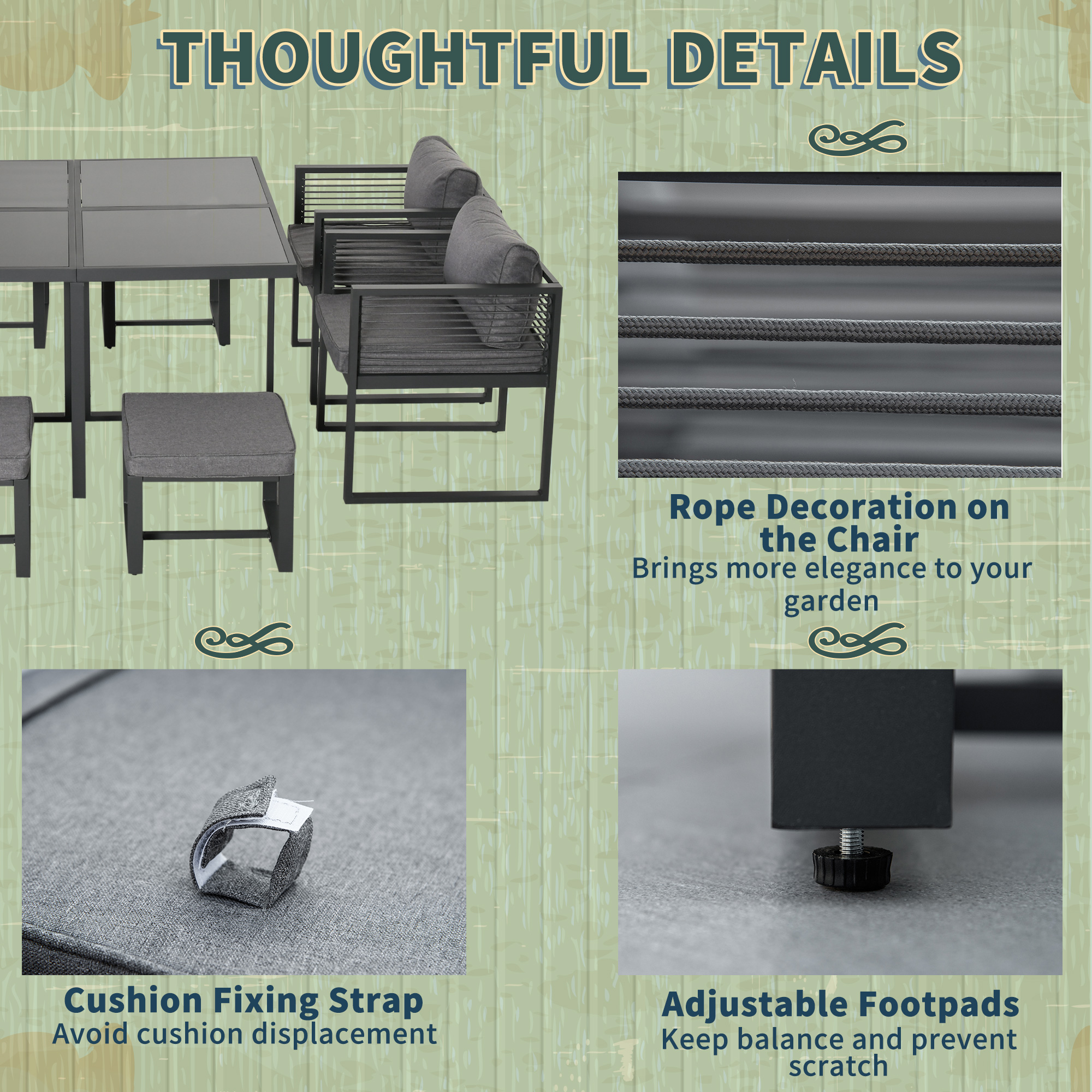• Nine-piece set seats eight: 1x table, 4x armchairs and 4x footstools
