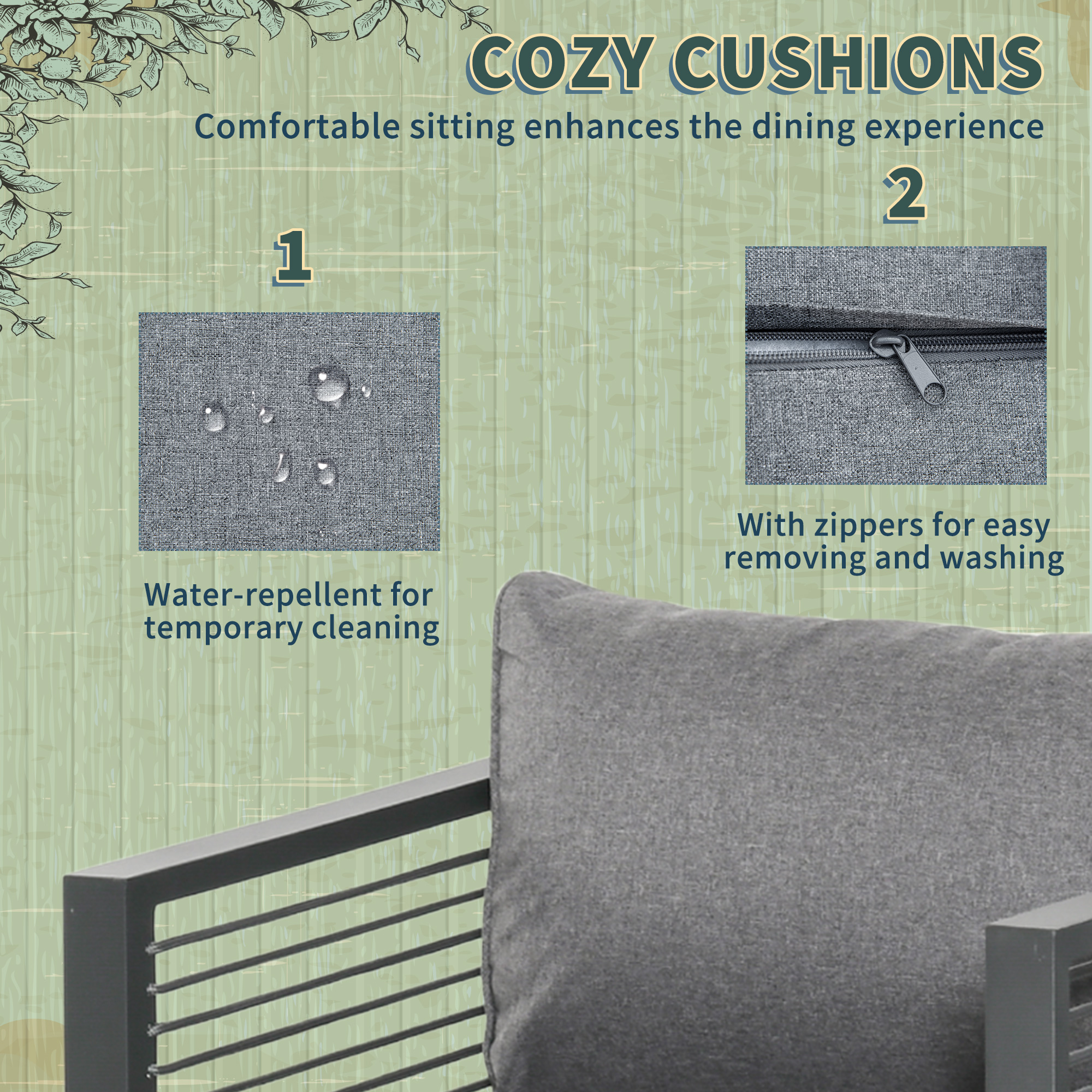 • Padded cushions for comfort, with removable and washable covers