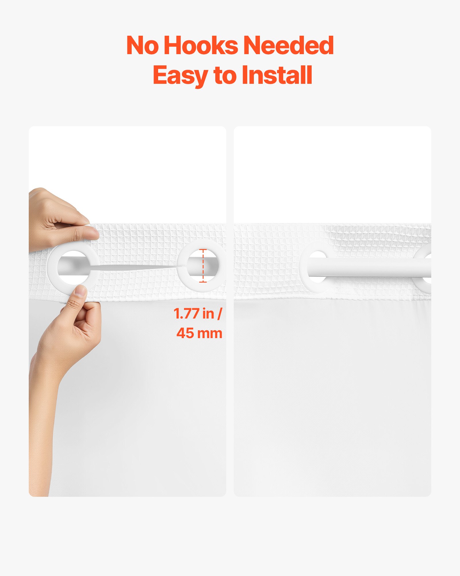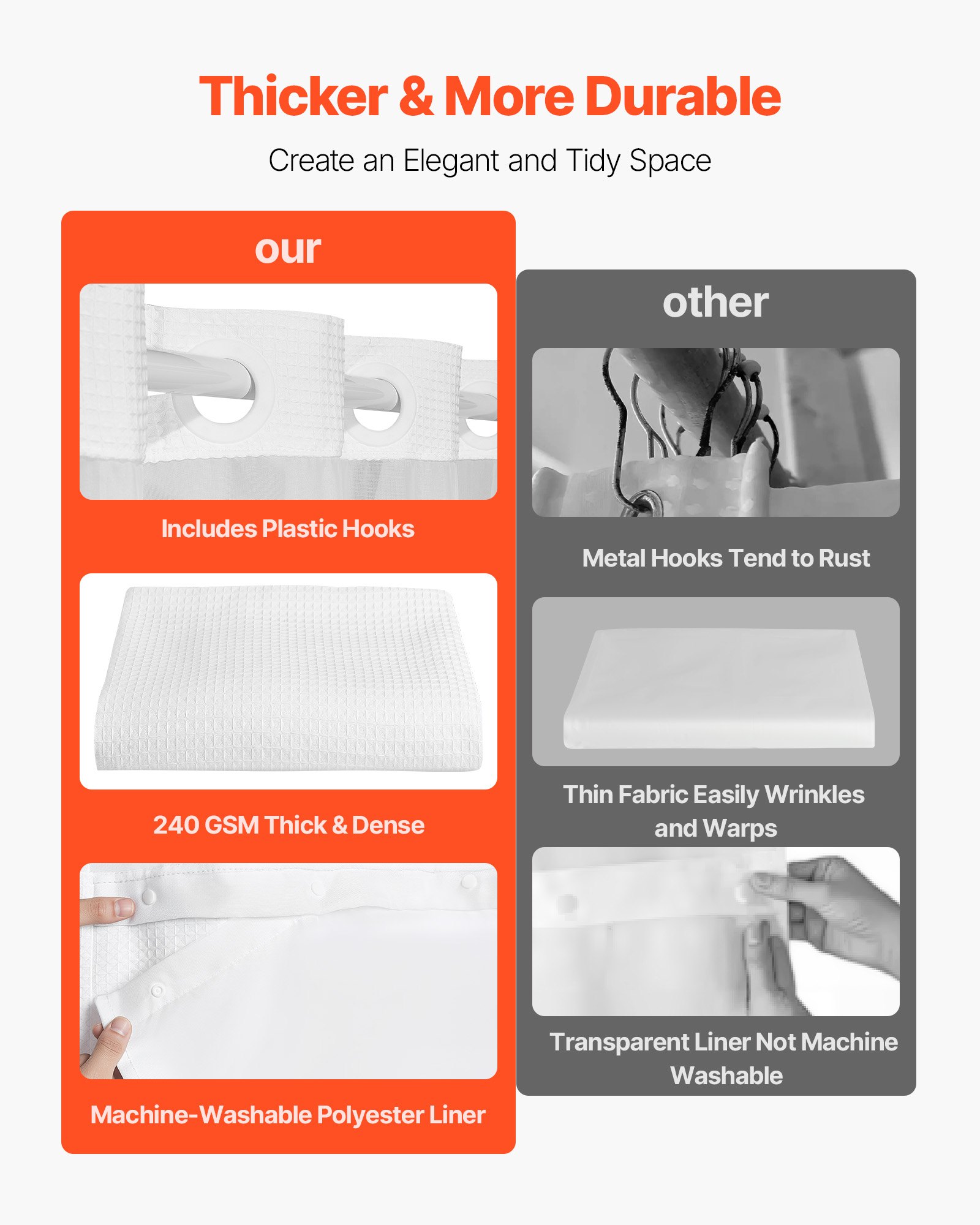 Thick and Durable: Designed without metal hooks, this hookless shower curtain avoids rust issues. It's refined waffle weave offers a natural drape and stylish look. It’s machine washable in cold water and holds shape well for long-term use