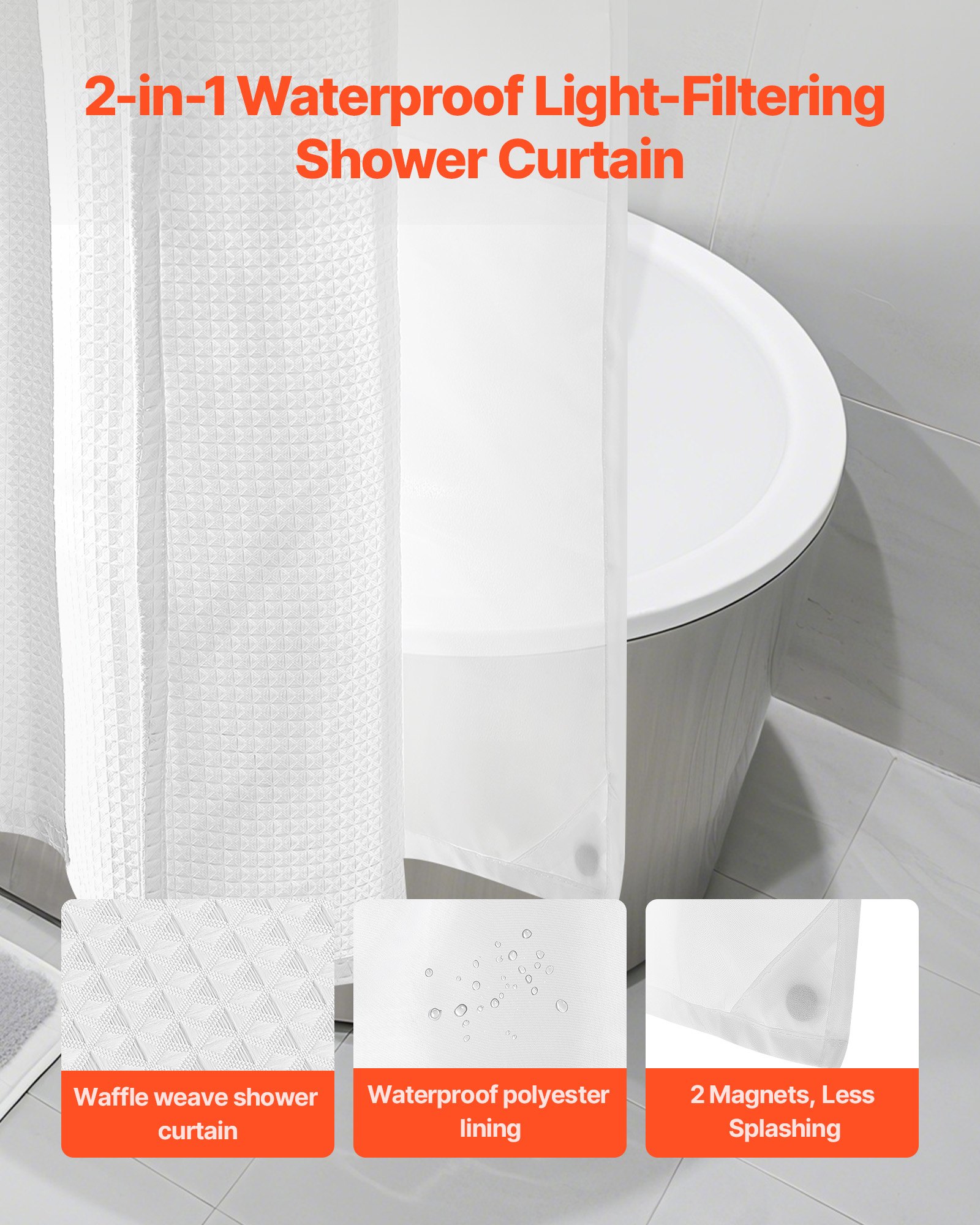 Dual Functionality: This no-hook shower curtain features an innovative design that combines a 240GSM waffle-textured curtain with a waterproof liner. It filters light, adds privacy and water control, and removes the need for separate purchases