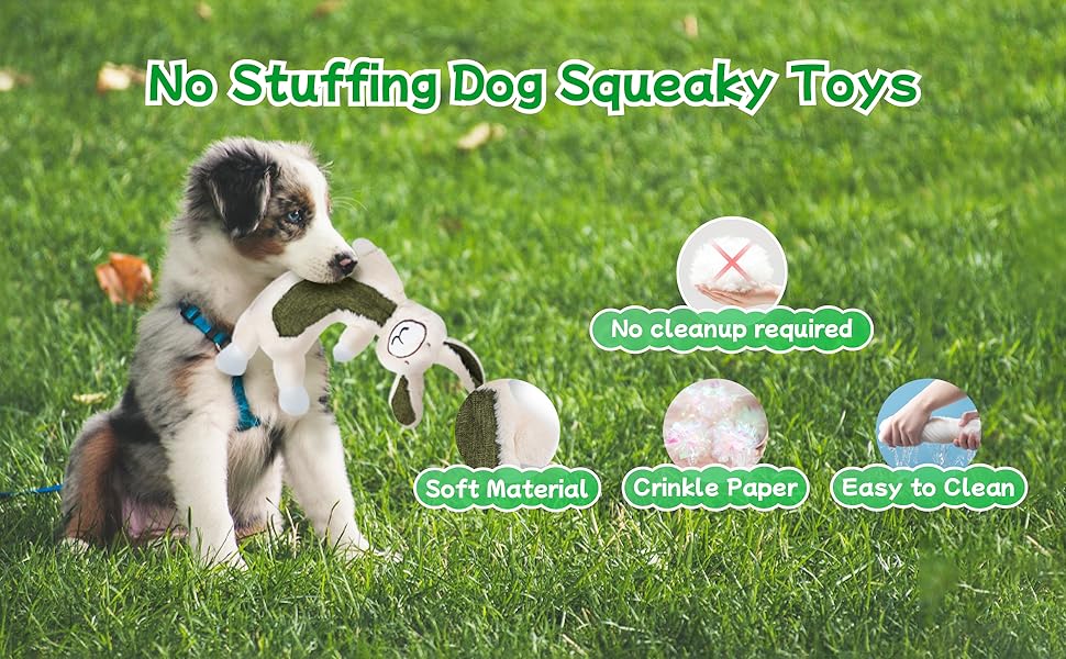 【No Stuffing Crinkle Dog Toys】 We prioritize safety and durability with our plush toys. Constructed from premium materials, they are built to endure vigorous play while remaining gentle on your dog's teeth and gums. By eliminating stuffing, we've minimized potential mess and choking hazards, ensuring your pet can play freely without compromising their safety.
