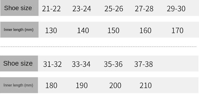 Sizes :21/22 [inner 13cm],23/24 [inner 14cm],25/26 [inner 15cm],27/28 [inner 16cm],29/30 [inner 17cm],31/32 [inner 18cm],33/34 [inner 19cm],35/36 [inner 20cm],37/38 【 Inner length 21cm】