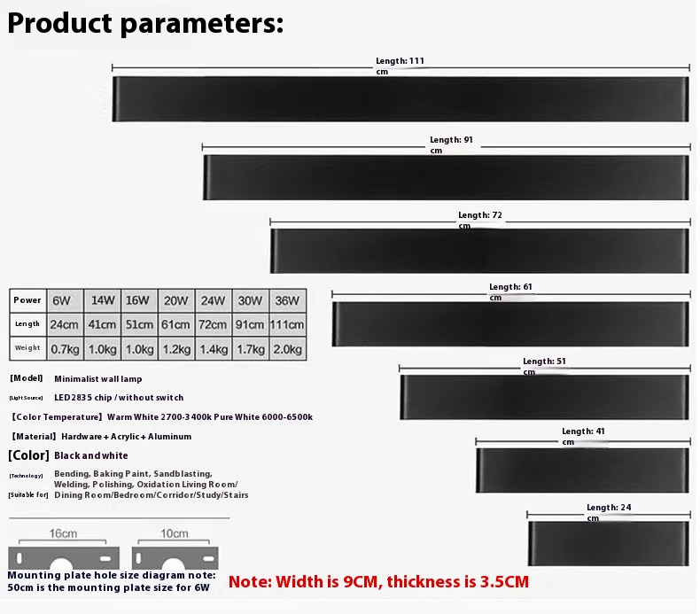 Light color: 6W Black length 24CM,6W White length 24CM,10W Black length 31CM,10W White length 31CM,14W Black length 41CM,14W White length 41CM,20W Black length 61CM,20W White length 61CM,30W Black length 91CM,30W White length 91CM