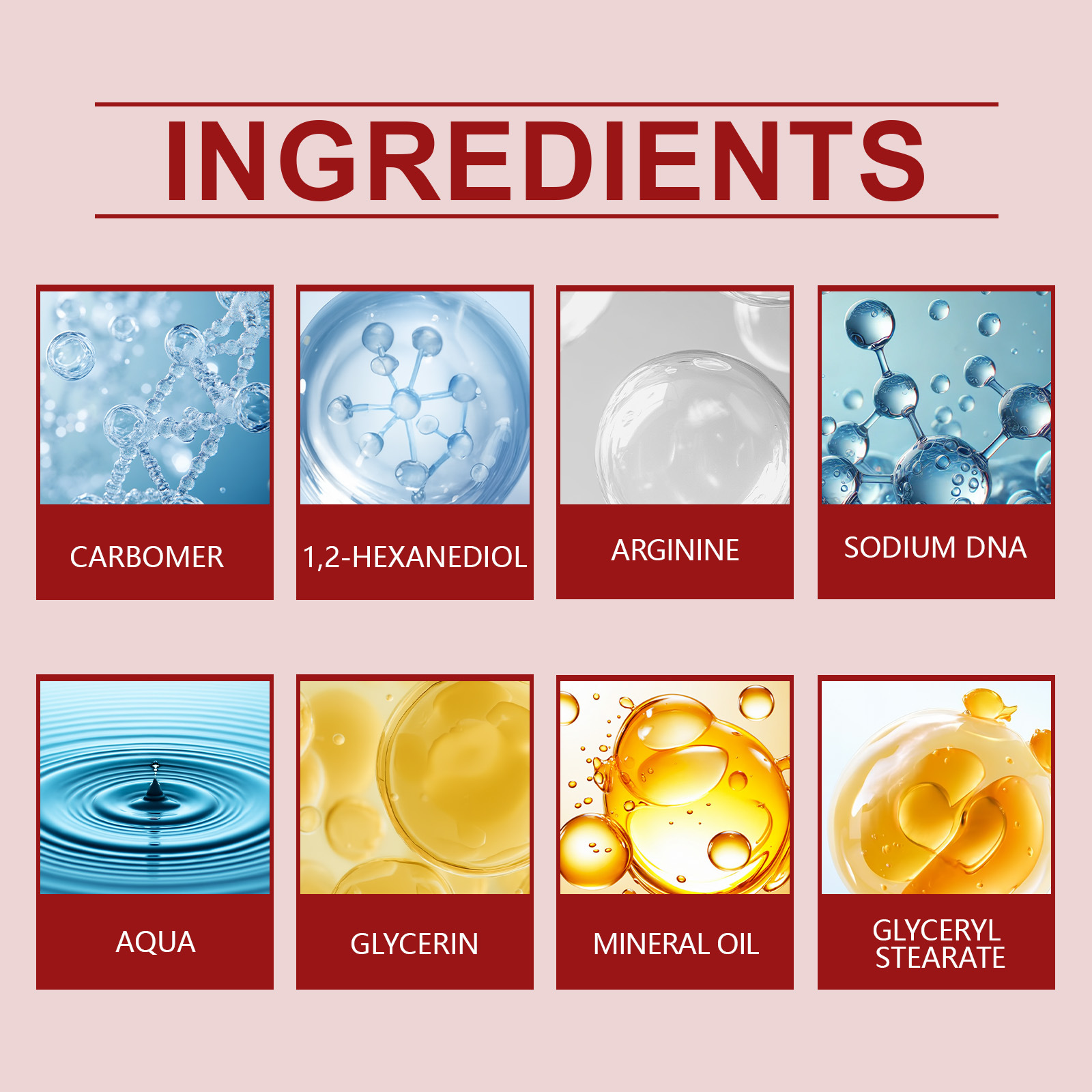 Ingredients: water, mineral oil, glycerol, glycerol stearate, 1,2- hexanediol, carbomer, arginine, DNA sodium.