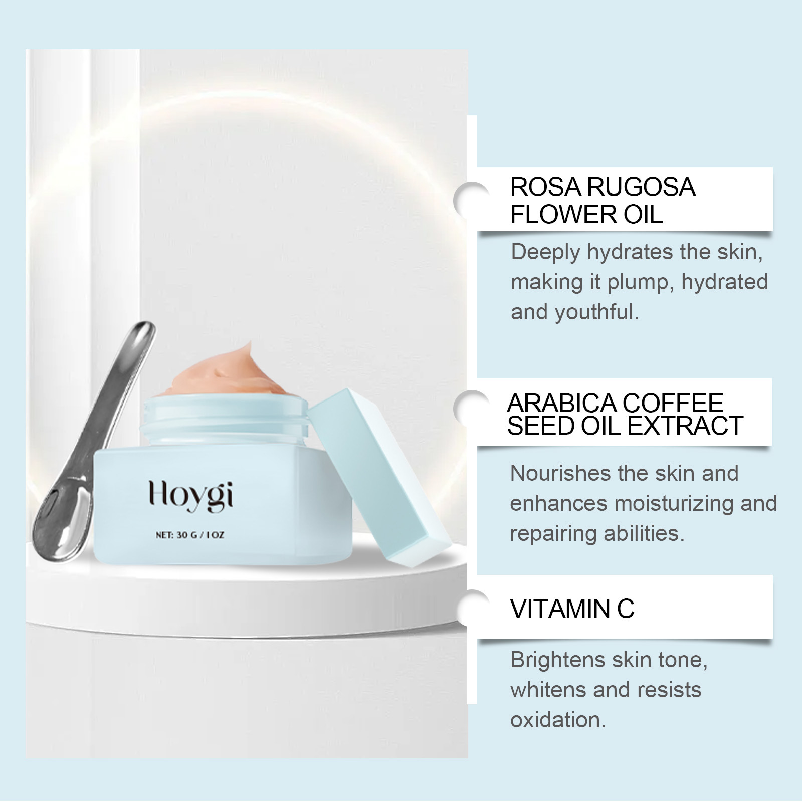 Ingredients: Water, glycerin, mineral oil, Glyceryl stearate, carbomer, ethylhexyl glycerol, triethanolamine, vitamin C, small sized fruit coffee seed oil extract, rose flower oil