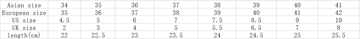 1. Asian sizes are 1 to 2 sizes smaller than European and American people. Choose the larger size if your size between two sizes. Please allow 2-3cm differences due to manual measurement.