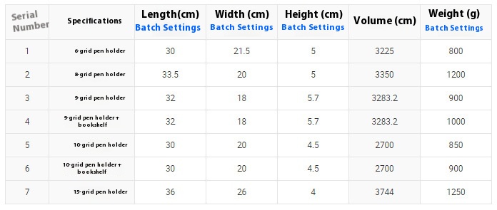 Specifications: 6-grid pen container, 8-grid pen container, 9-grid pen container, 9-grid pen container bookshelf, 10-grid pen container, 10-grid pen container bookshelf, 15-grid pen container