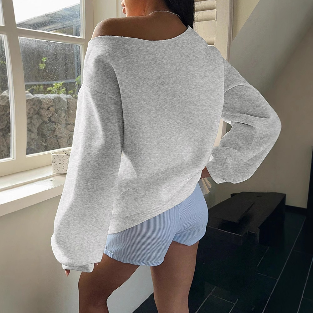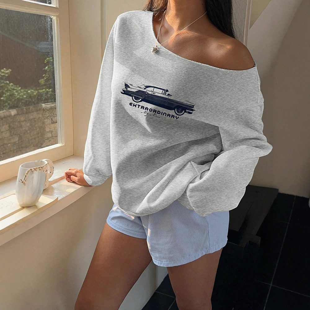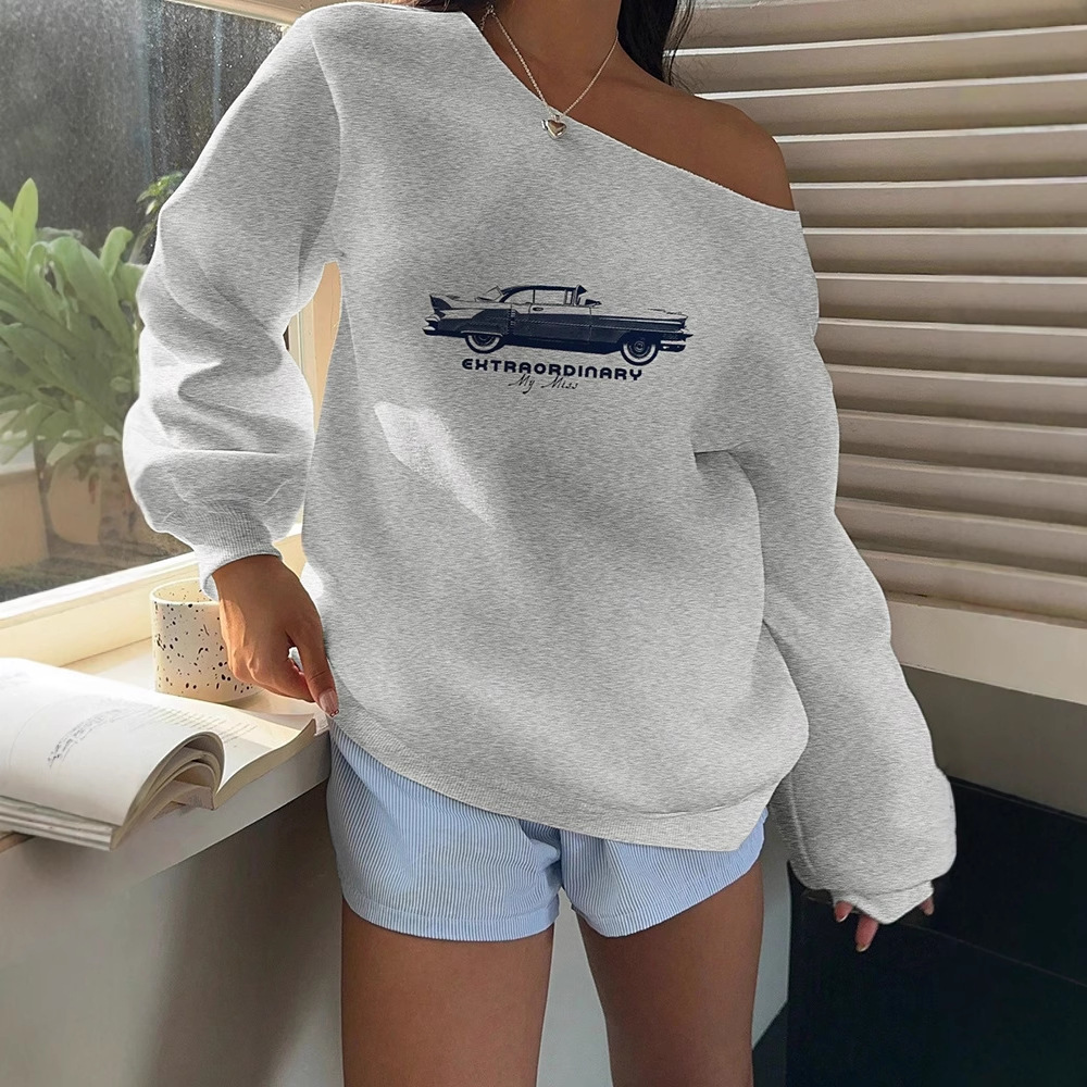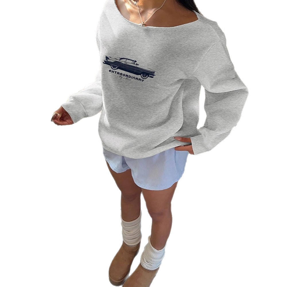Oblique Shoulder Sweatshirt Women's Retro Print Loose And Versatile