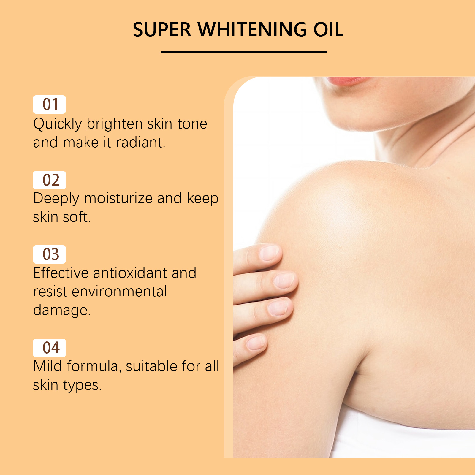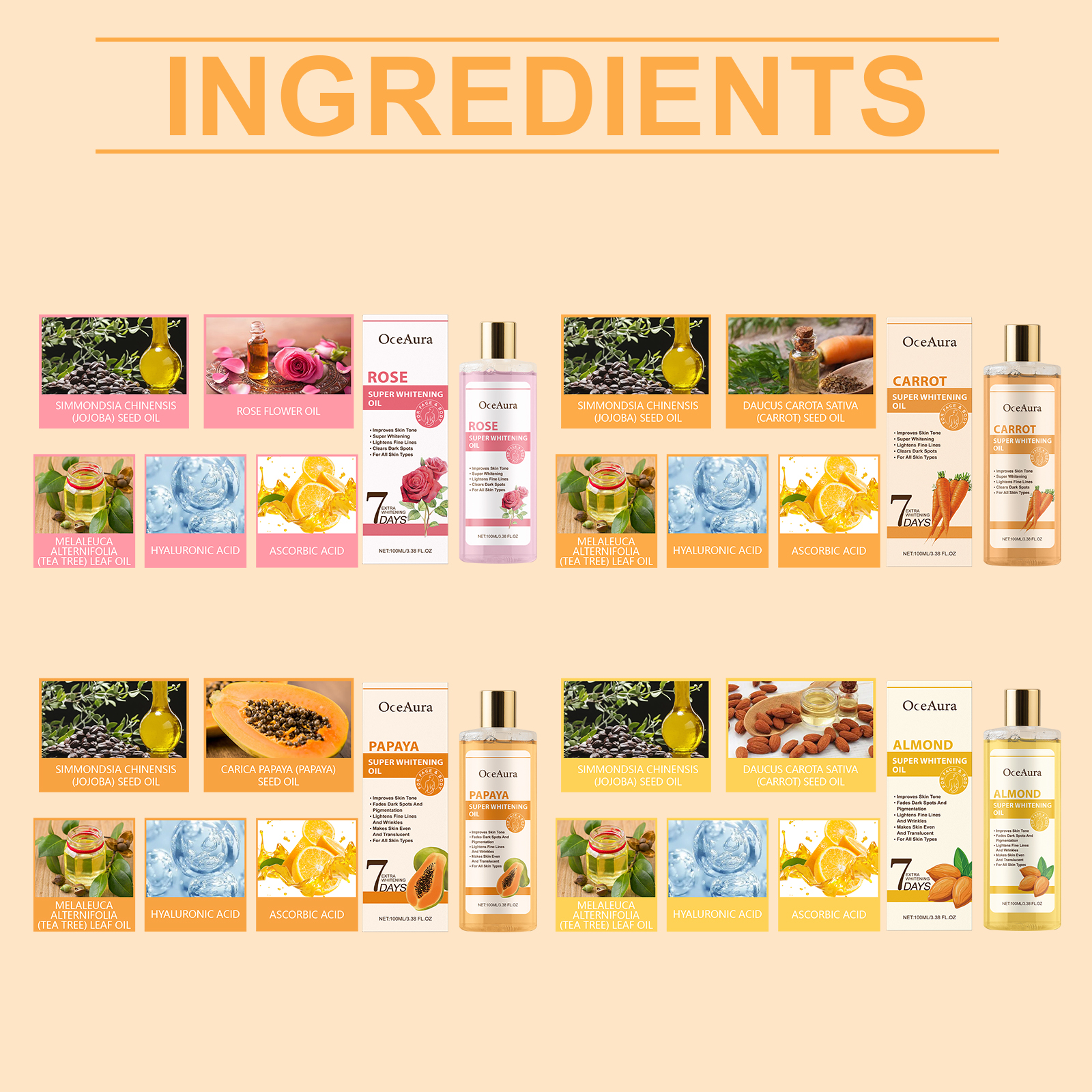 Our 7-day oils include Jojoba seed oil, papaya seed oil, and tea tree oil. It can provide deep moisture to the skin, leaving the skin soft and smooth; Helps balance the outer skin tone, improves skin whitening and luster, and shows healthy skin. The way to use it is simple: 1. Clean your skin and keep it dry. 2. Apply appropriate amount to the whole body. 3. Gently massage until absorbed. Hyaluronic acid provides long-lasting moisture, helps the skin retain moisture and prevents dryness.
