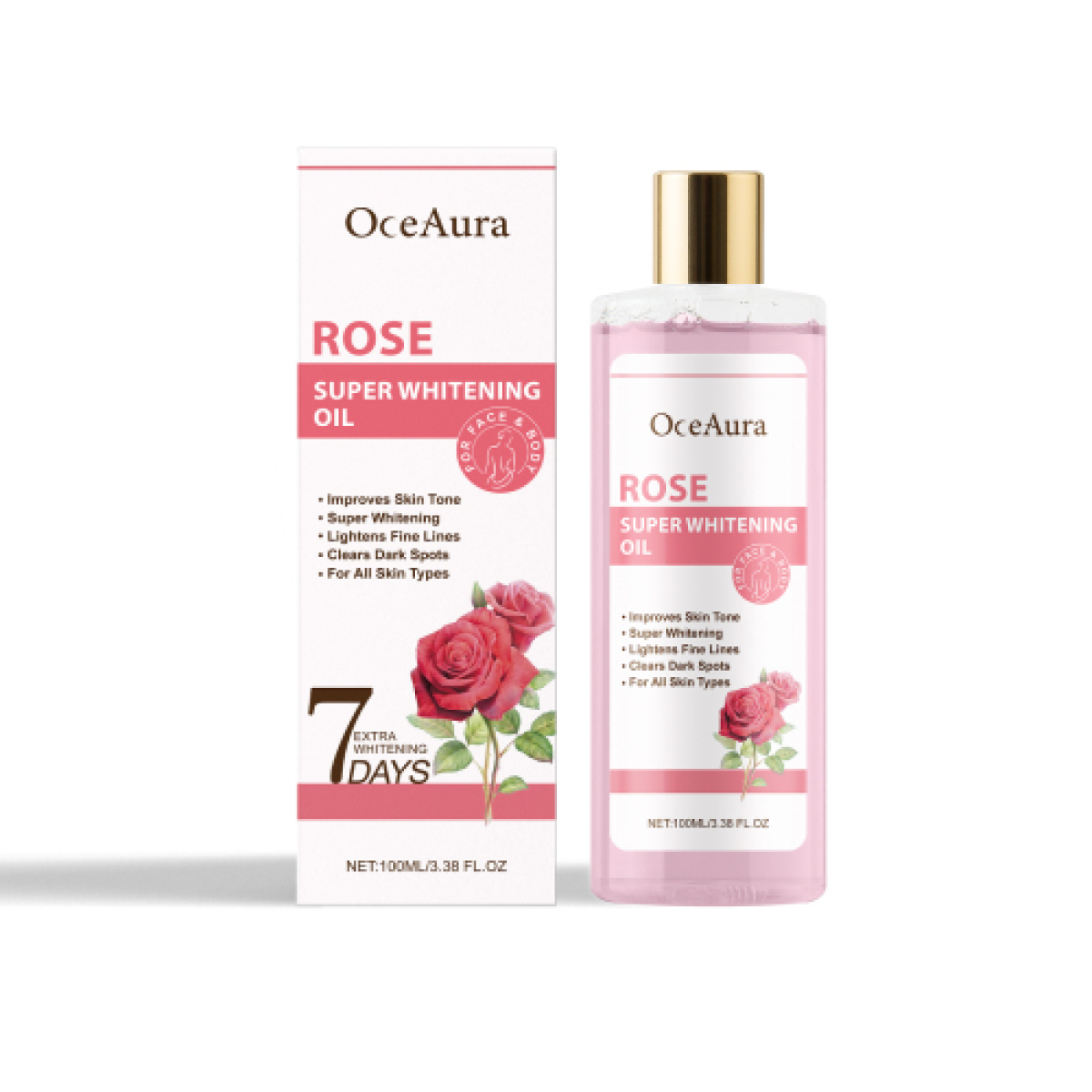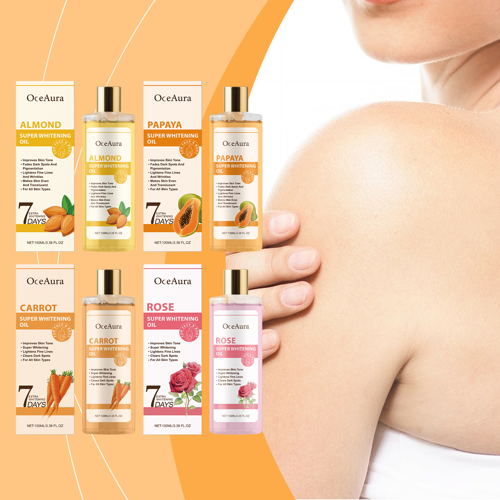 Our 7-day oils include Jojoba seed oil, rose oil, and tea tree oil. It can provide deep moisture to the skin, leaving the skin soft and smooth; Helps balance the outer skin tone, improves skin whitening and luster, and shows healthy skin. The way to use it is simple: 1. Clean your skin and keep it dry. 2. Apply appropriate amount to the whole body. 3. Gently massage until absorbed. Hyaluronic acid provides long-lasting moisture, helps the skin retain moisture and prevents dryness.