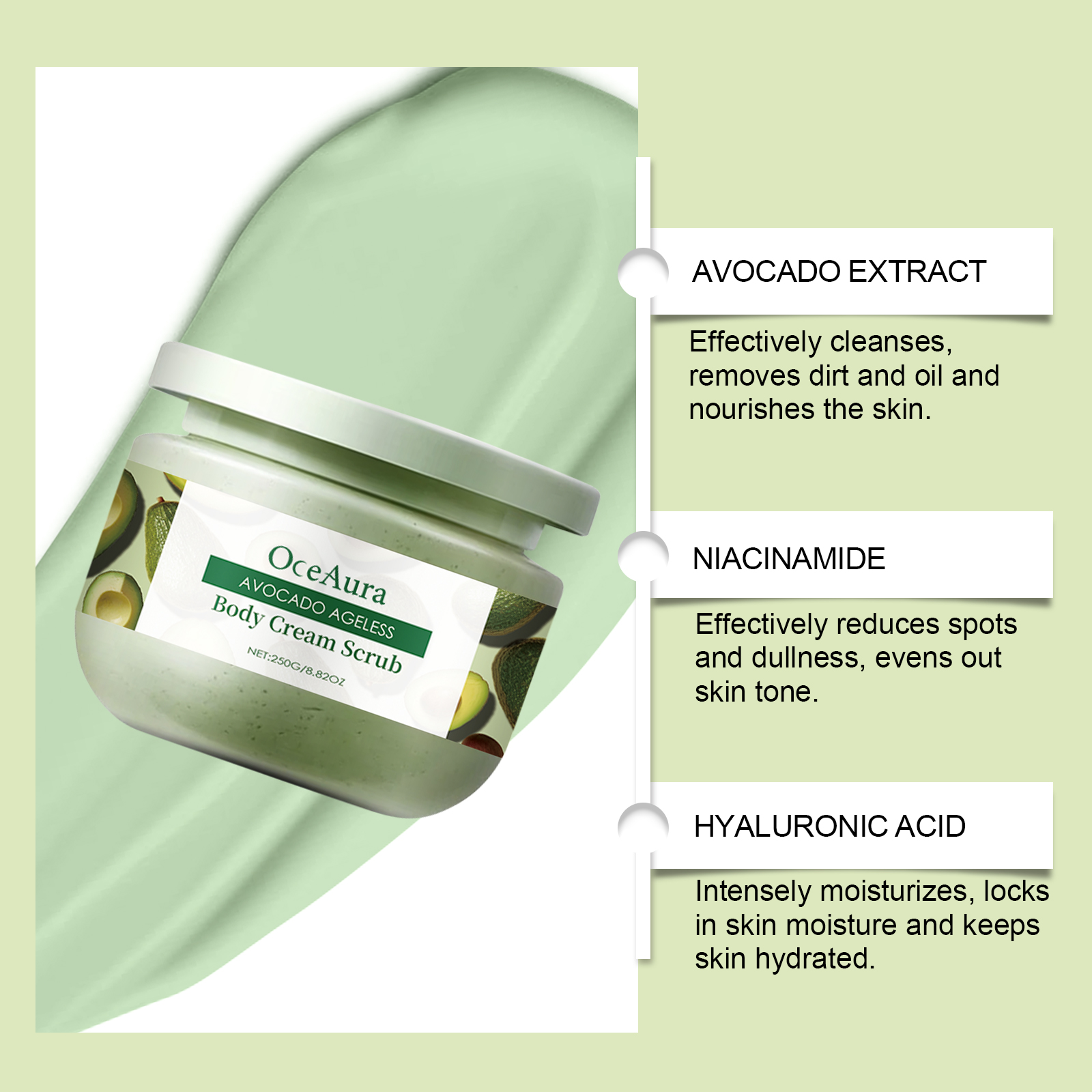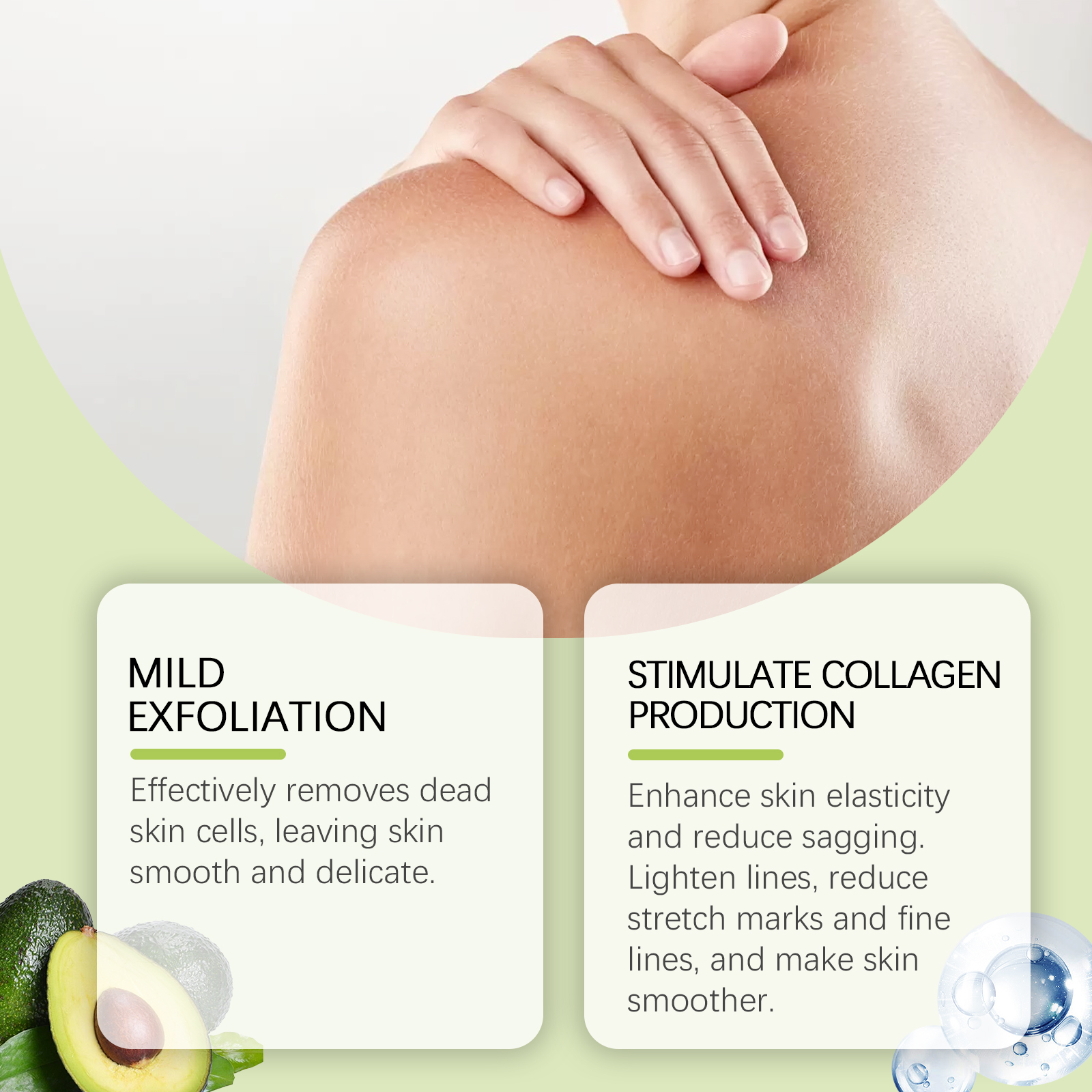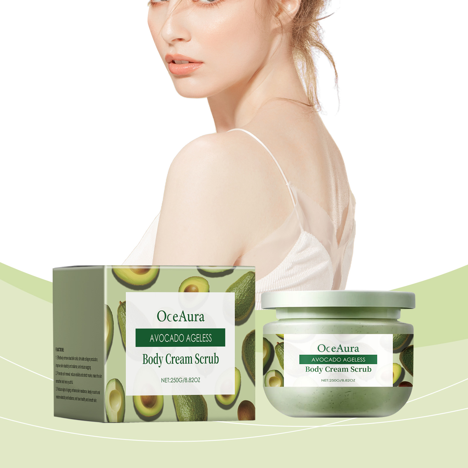 Our avocado body scrub contains glycerin, avocado extract, nicotinamide. It can effectively remove dead skin cells and leave skin smooth and delicate. Enhance skin elasticity and reduce skin sagging. Fade fine lines, reduce stretch marks and fine lines, and make skin smoother. The way to use it is very simple: 1. Wet the skin and then apply an appropriate amount of facial cleanser to the skin. 2. Gently massage the skin in a circular motion with your fingertips or scrub tool; After 3.5-10 minutes, rinse thoroughly with water. Helps rejuvenate the skin and give it a youthful glow. Smooth skin, reduce roughness and dryness, and make skin feel soft.