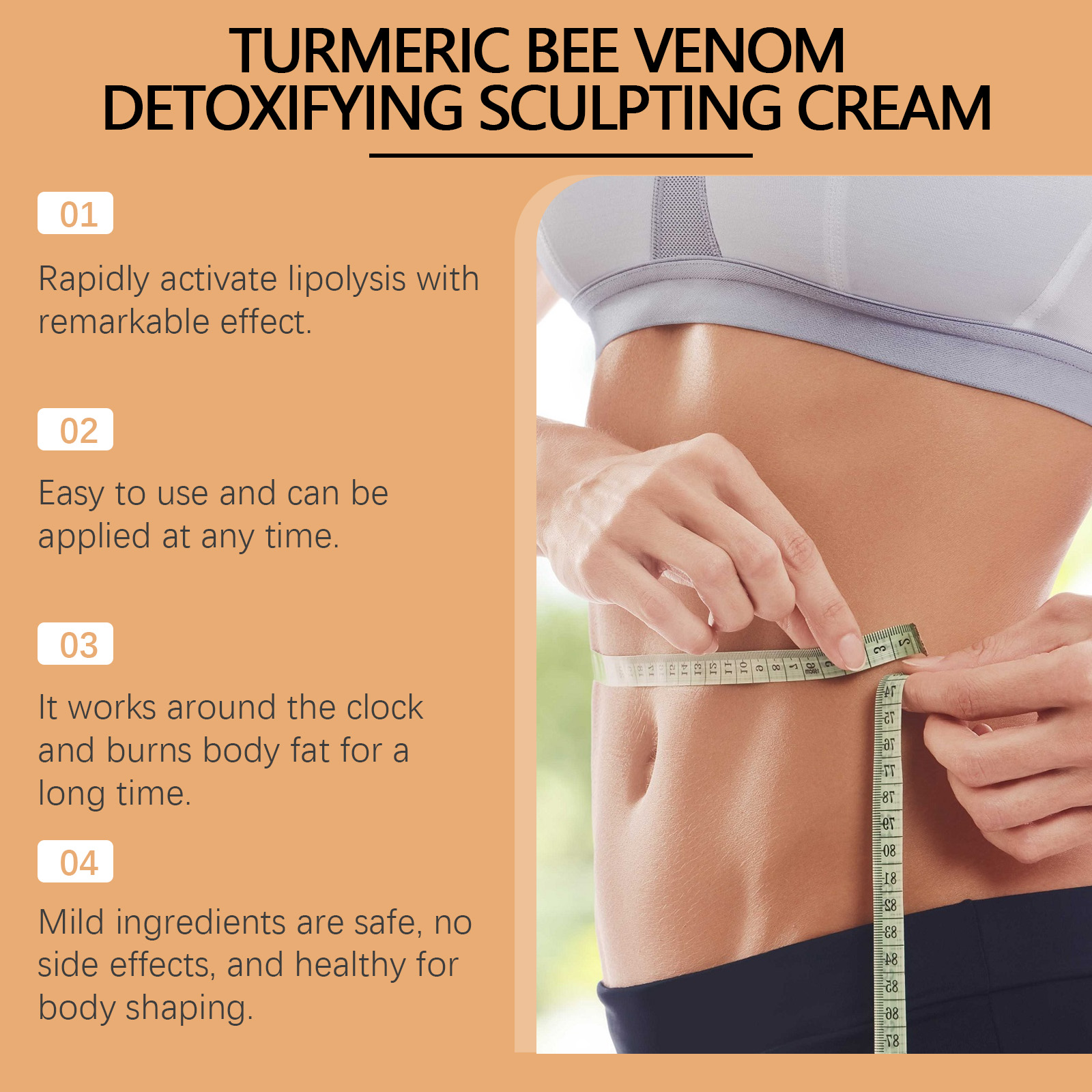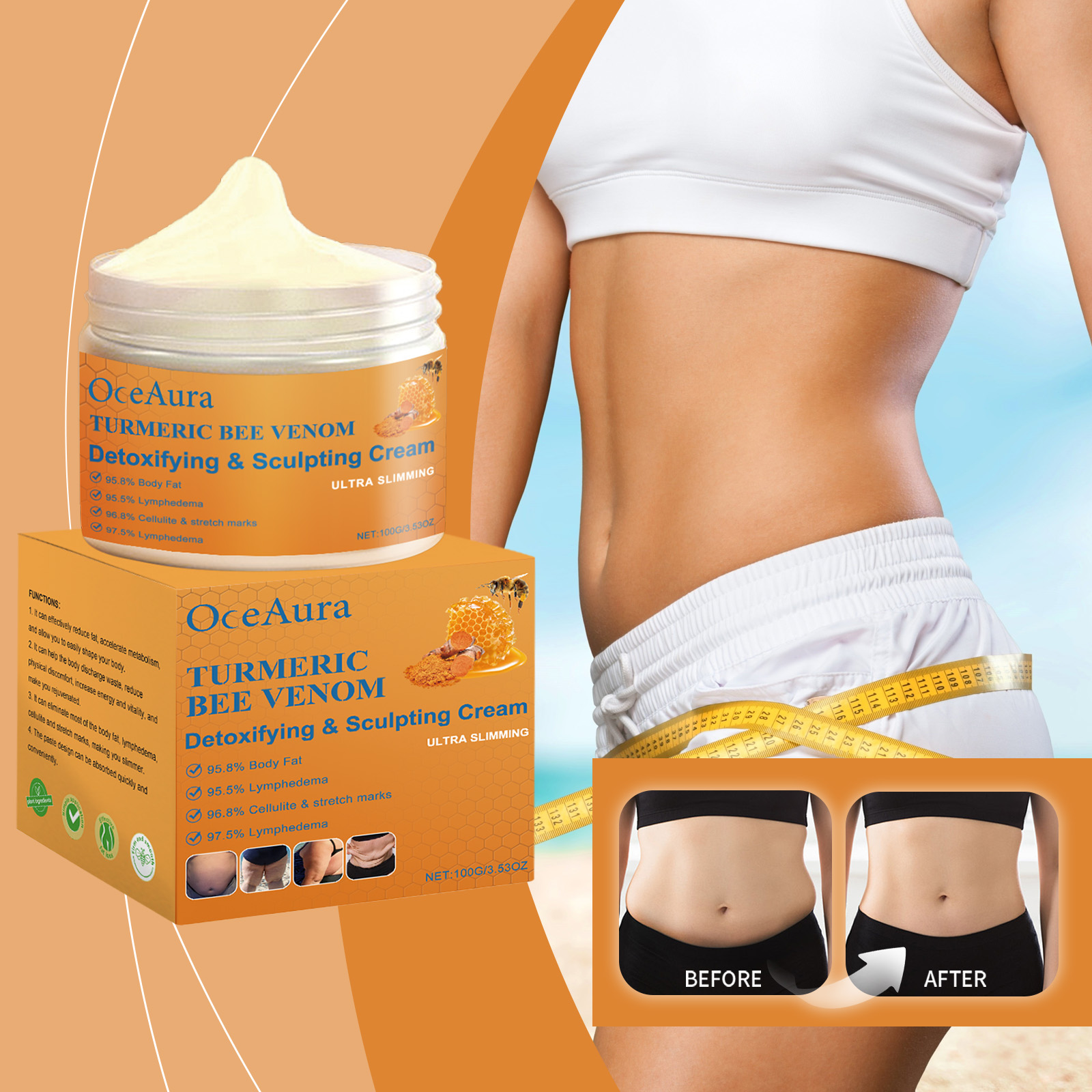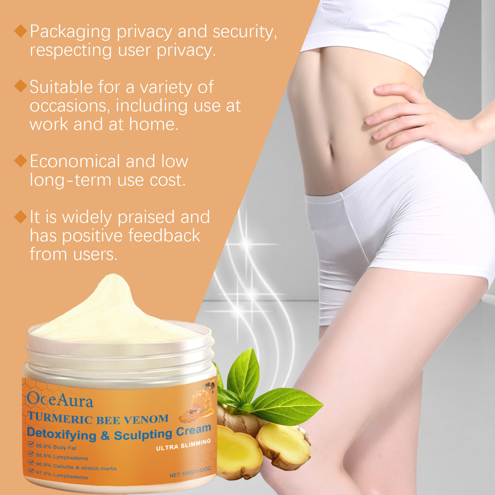 Our Body Massage cream contains turmeric root extract, bee venom and ginger root extract. It can quickly activate fat, break down and effectively shape the body. The application is simple and convenient. Its application method is simple: 1. Thoroughly clean and dry the skin; 2. Apply appropriate amount of this product evenly on hands, legs and other parts of the body. 3. Massage gently to promote better absorption. Raises body temperature and promotes lipolysis. Improve blood circulation and speed up metabolism. Promote blood circulation and relieve fatigue.