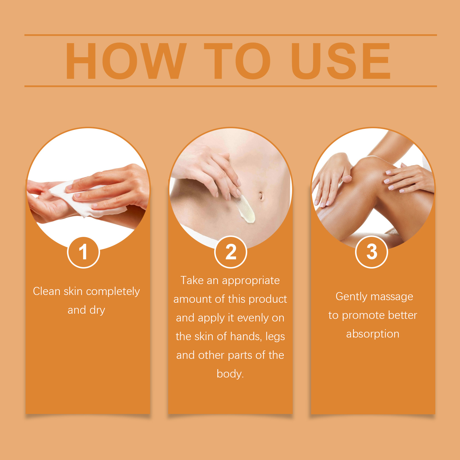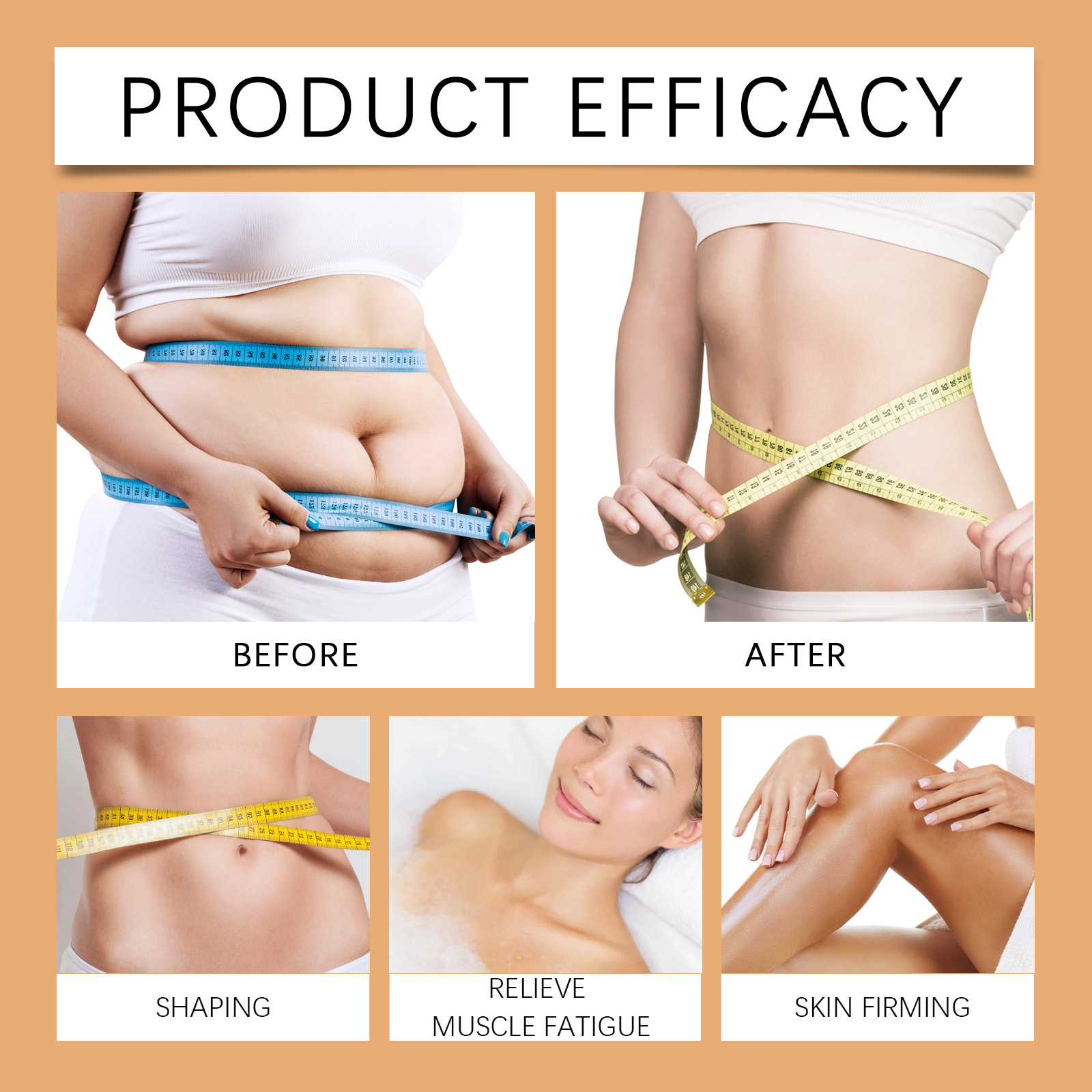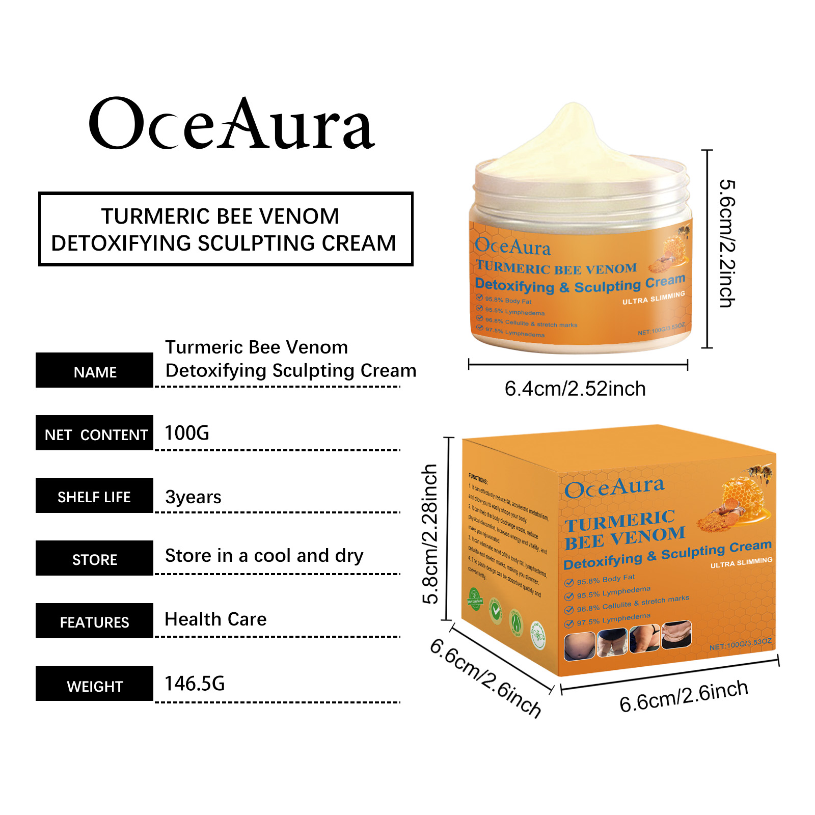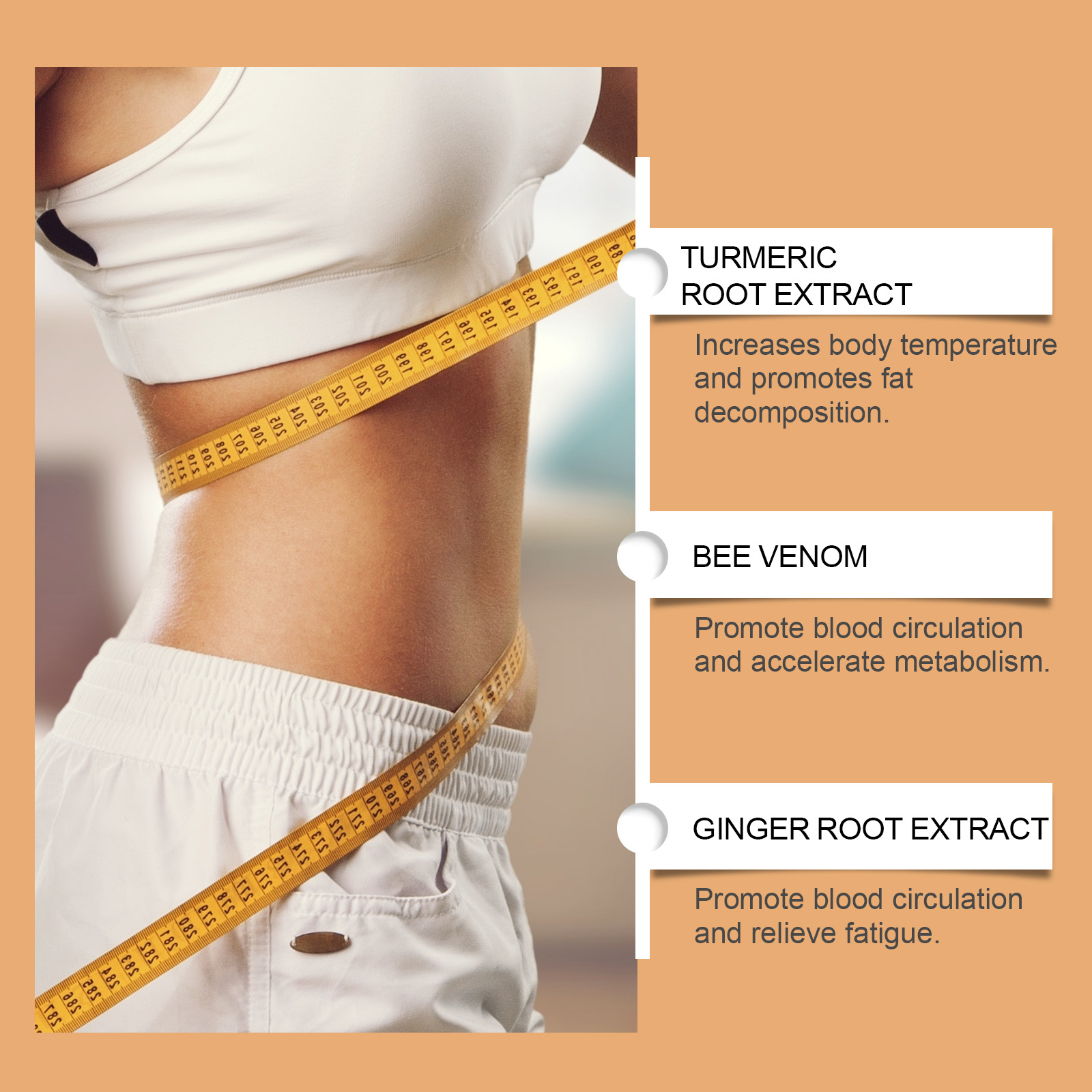 Our Body Massage cream contains turmeric root extract, bee venom and ginger root extract. It can quickly activate fat, break down and effectively shape the body. The application is simple and convenient. Its application method is simple: 1. Thoroughly clean and dry the skin; 2. Apply appropriate amount of this product evenly on hands, legs and other parts of the body. 3. Massage gently to promote better absorption. Raises body temperature and promotes lipolysis. Improve blood circulation and speed up metabolism. Promote blood circulation and relieve fatigue.