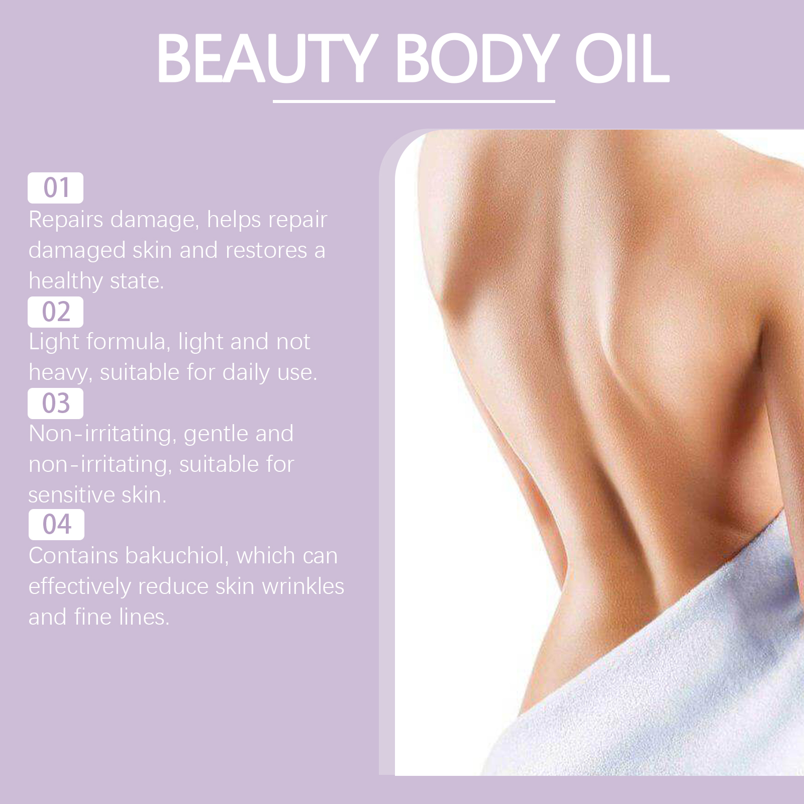Our body moisturizing oils contain shea butter, tocopherol (vitamin E). It can provide deep moisturizing effect, keep skin hydrated and smooth, and improve dryness. Its application method is very simple: thoroughly clean and dry your skin, apply appropriate amount of this product evenly on the hands and legs and other body skin, gently massage until completely absorbed. It also reduces fine lines and wrinkles, leaving skin looking younger and smoother.