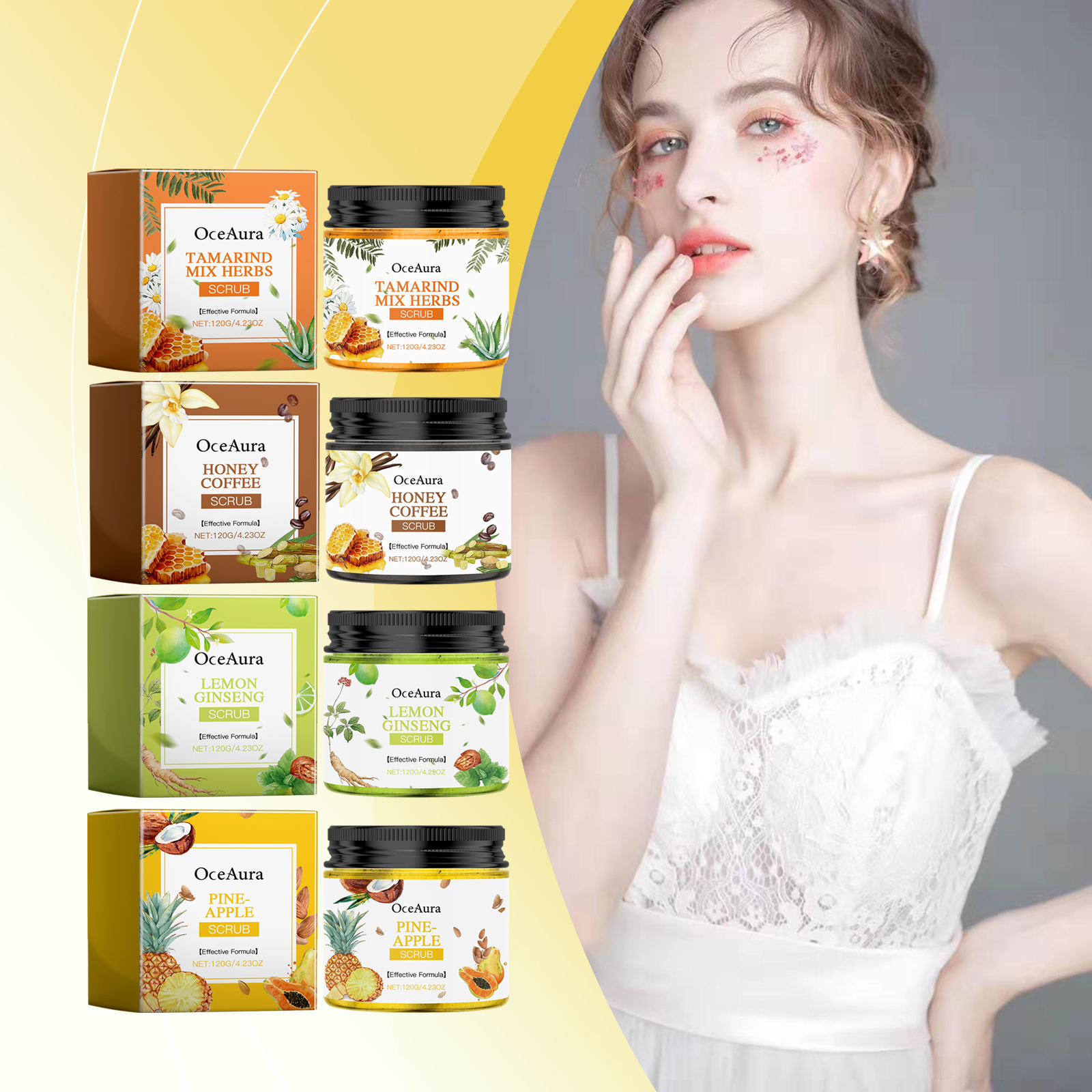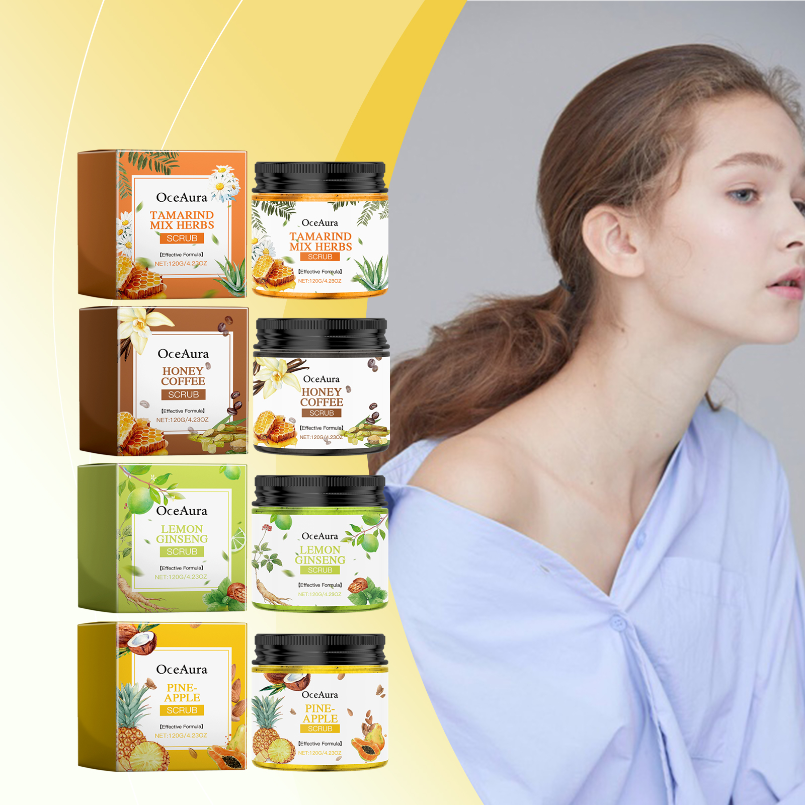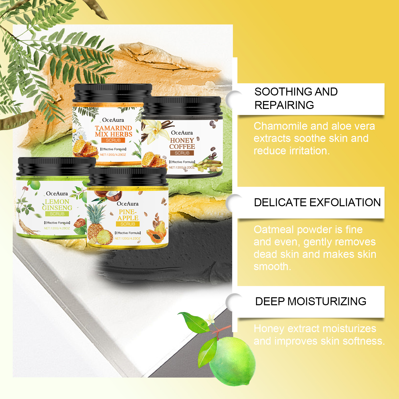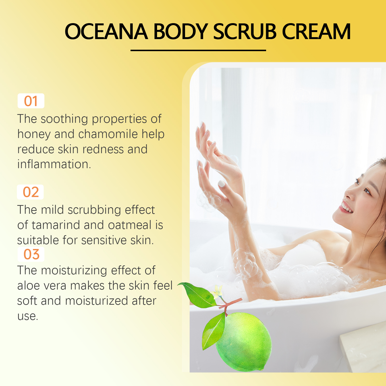 Our body scrub (Tamarind Herbal) contains tamarind extract, oat flour, honey extract. It can help remove dead skin cells and make the skin look healthier and younger. The way to use it is simple: 1. First clean the skin with warm water to open the pores. 2. Apply an appropriate amount of scrub to the palm and apply to the wet skin. 3. Massage gently with your fingertips in circular motions and let the scrub sit on your skin for 1-2 minutes. 4. Finally, rinse the scrub thoroughly with warm water to avoid residual scrub particles. Suitable for all skin types, especially those that need to be exfoliated. Each use can significantly improve the skin.