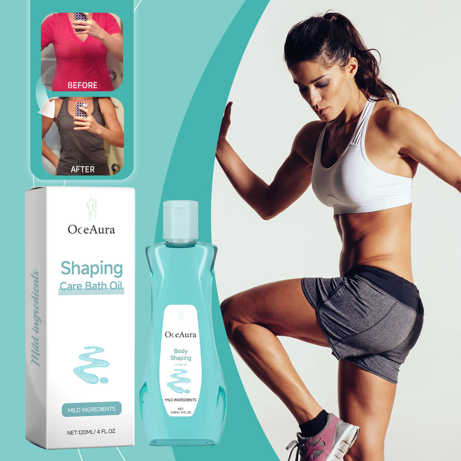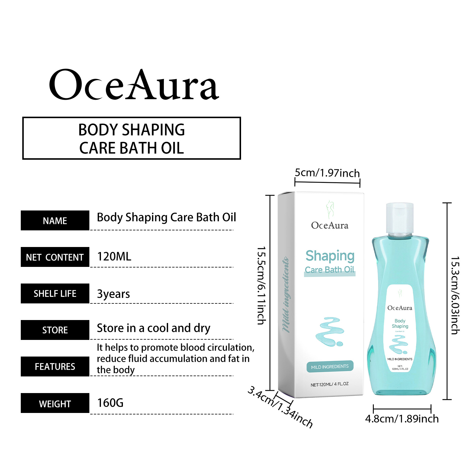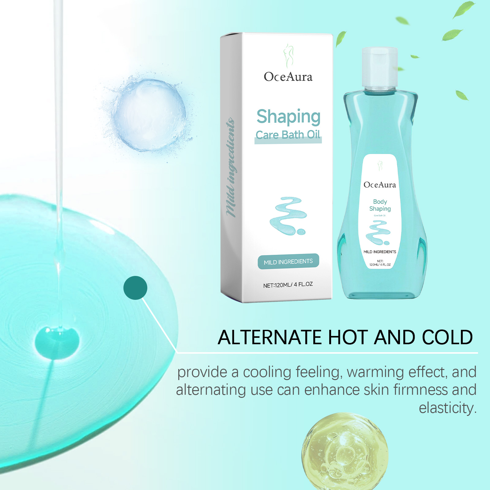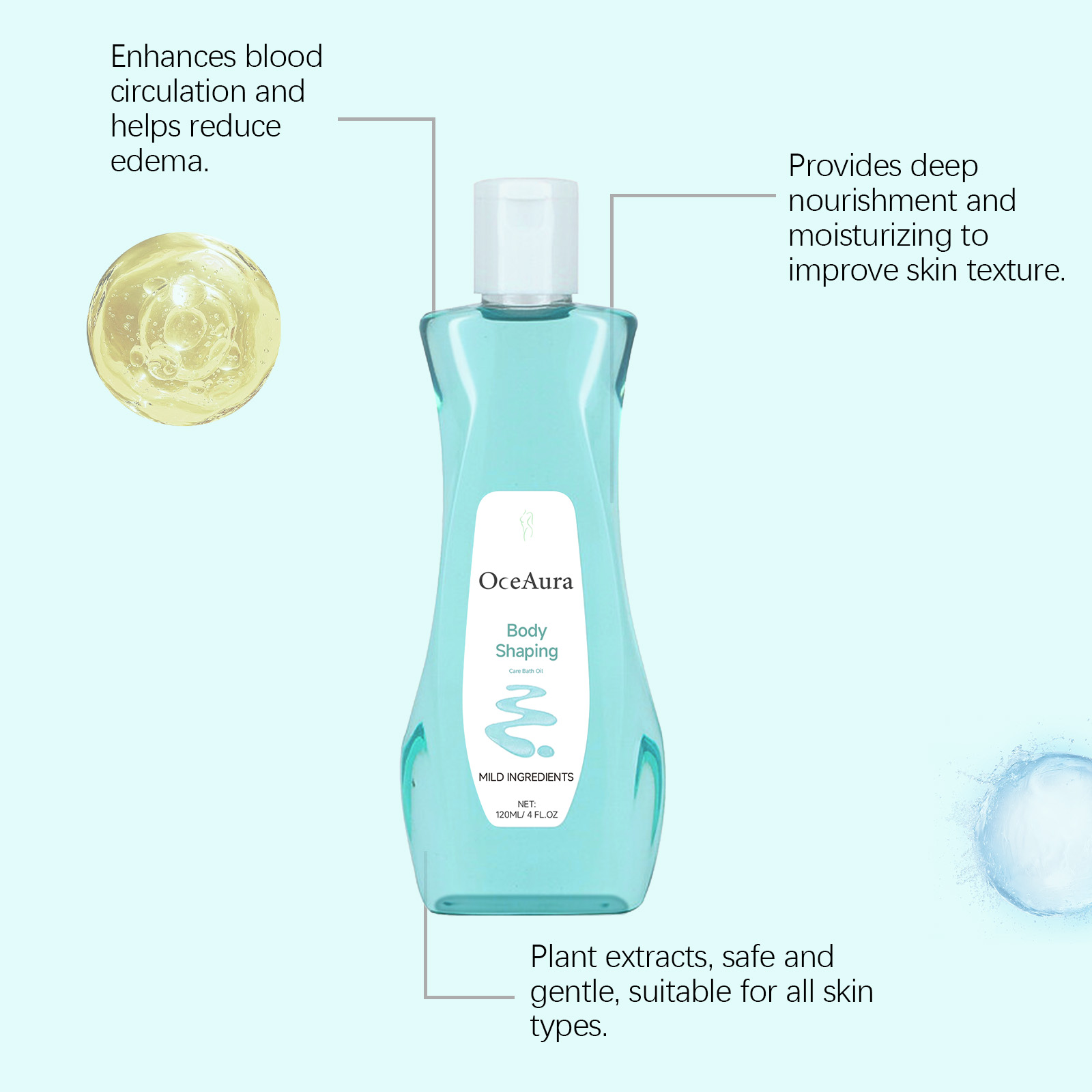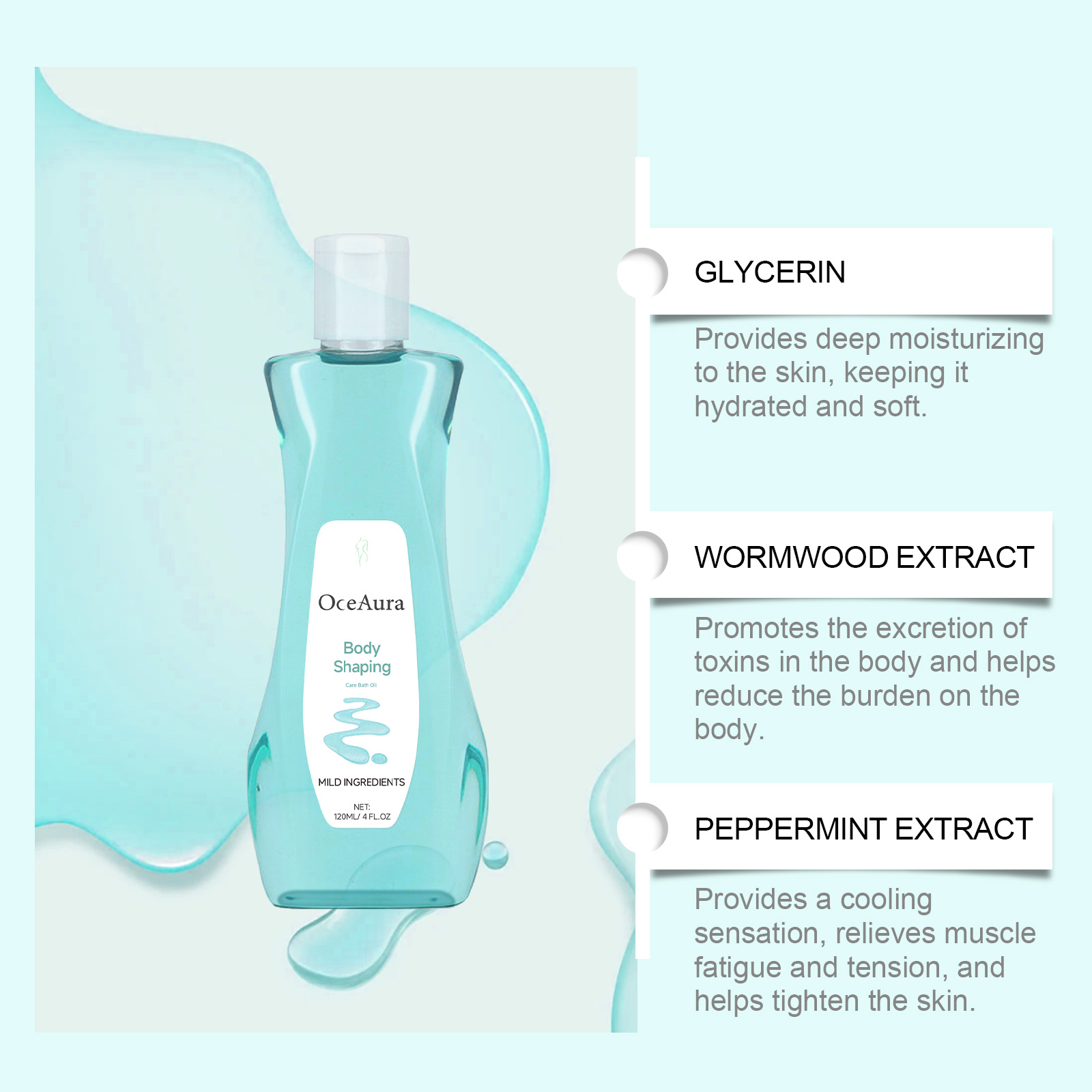 Our body shower oil contains glycerin, wormwood extract, peppermint extract. It can promote the elimination of toxins and support the body's weight loss process. Its use method is very simple: 1. Take appropriate amount of this product evenly spread on the skin; 2. Gently massage the skin of the whole body and let the product stay on the skin for a few minutes to absorb the essence; 3. Rinse with warm water. Promote blood circulation, promote body metabolism, help reduce local fat and edema.