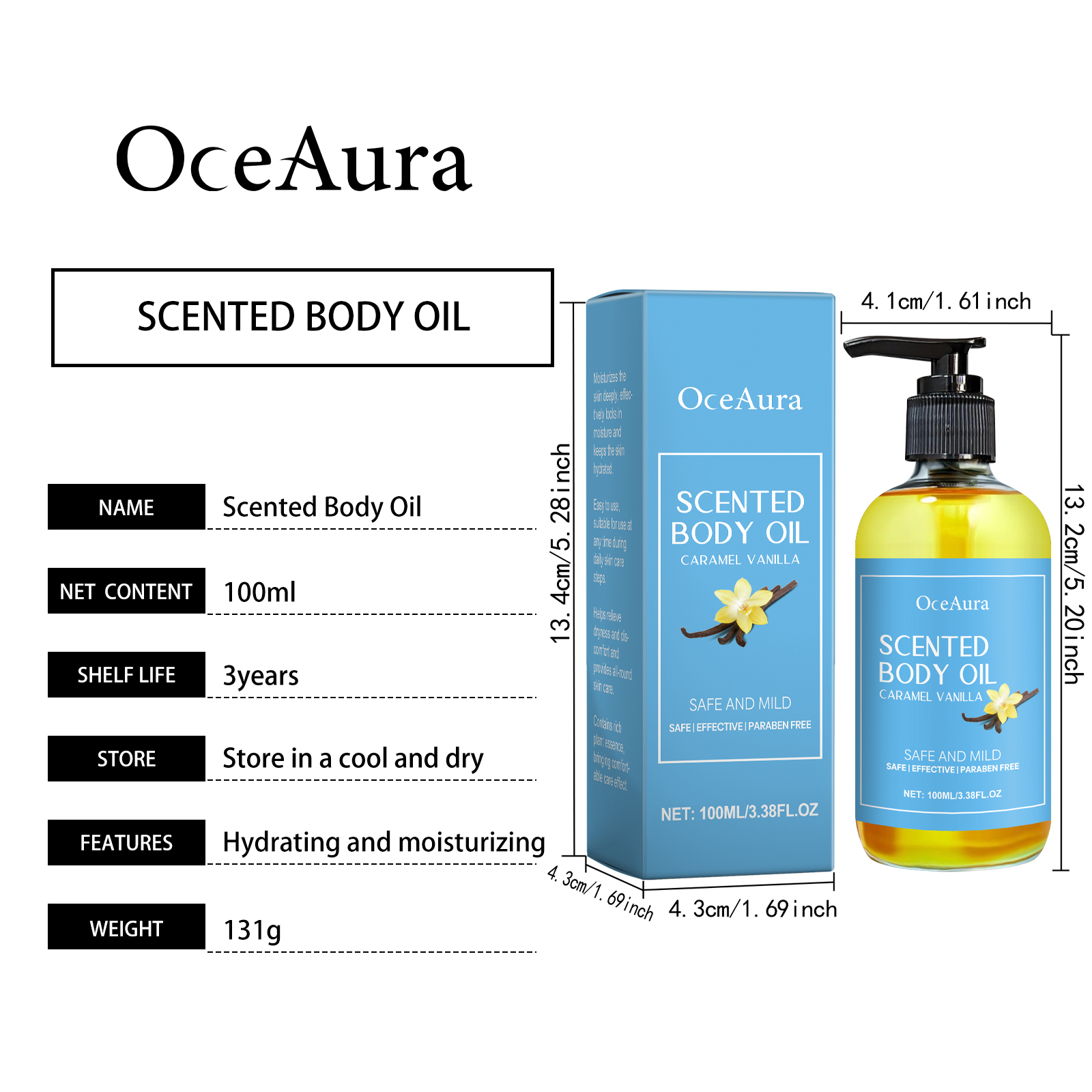 Our caramel Vanilla Body Oil contains caramel, vanilla extract and shea butter. It can provide deep nutrients, effectively moisturize dry skin and restore softness. Its application method is simple: 1. Clean the skin and keep it dry. 2. Apply the product evenly to the body skin. 3. Gently massage until absorbed. Vanilla extract brings a light aroma, lasting fragrance, physical and mental pleasure. Suitable for different skin types, sensitive skin can also be used safely, without any irritation.
