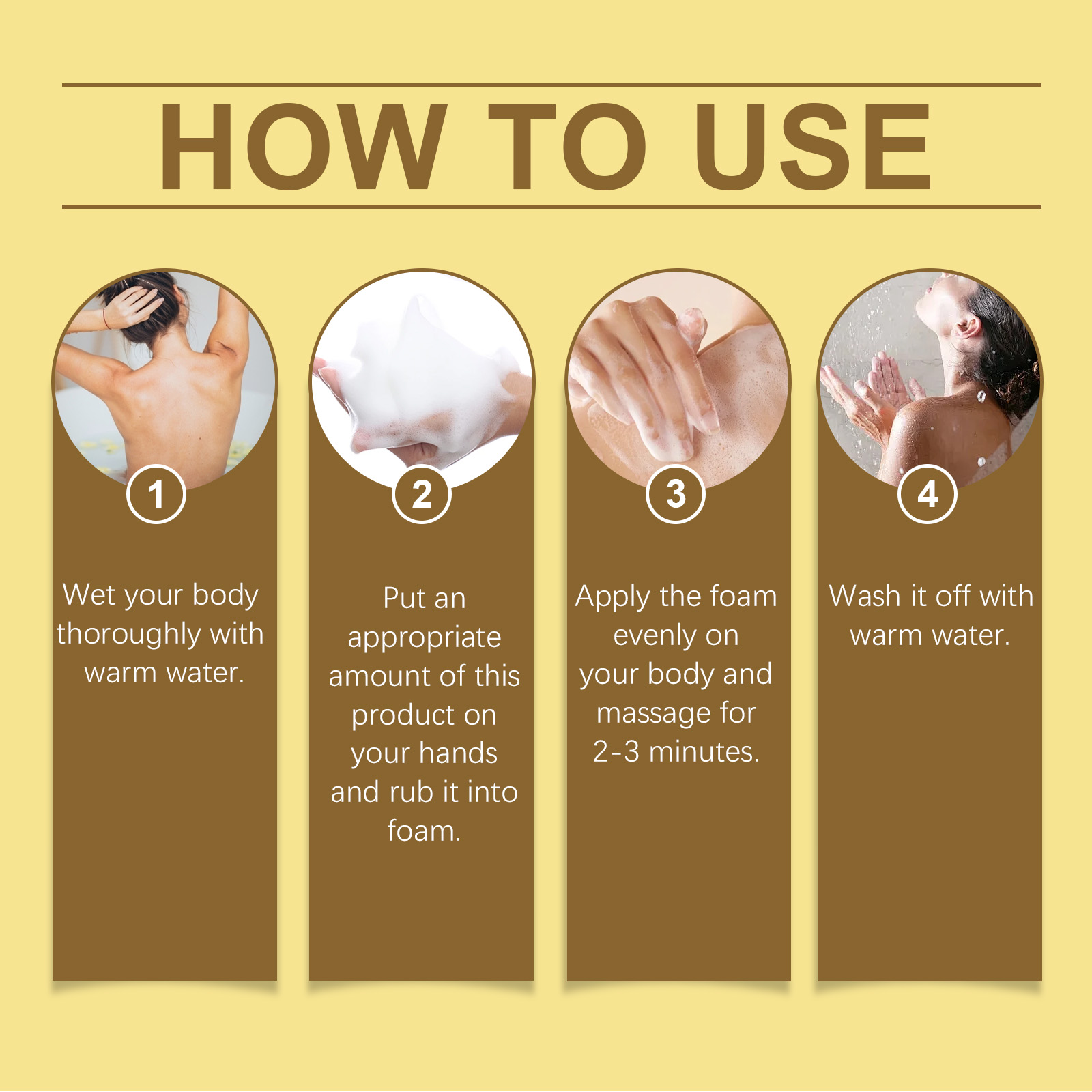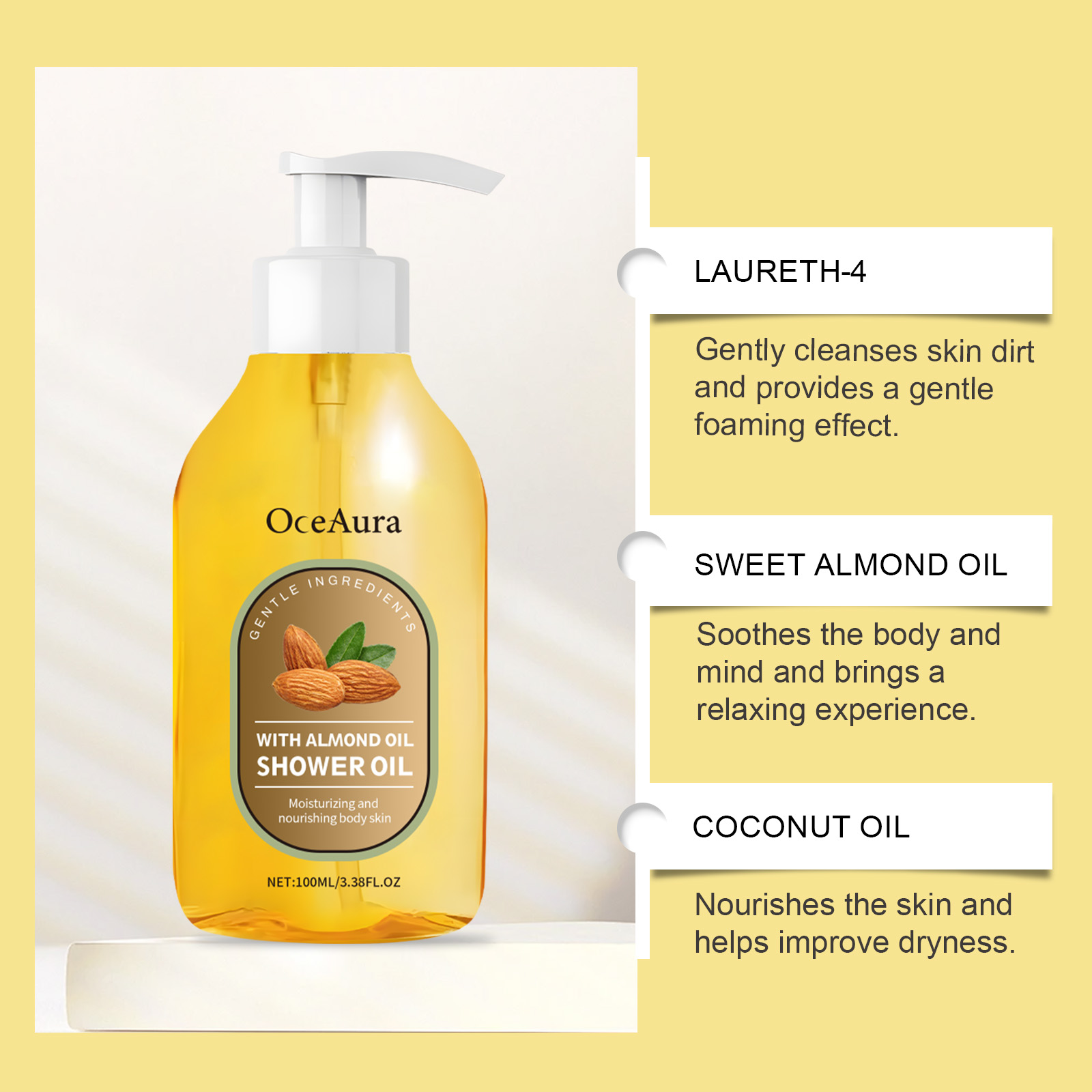 Our coconut oil bath oil contains mineral oil, ethyl hexyl palmitate. It provides long-lasting moisture, keeps skin soft and helps strengthen skin barriers to hold in moisture. Its use is simple: thoroughly wet your body with warm water. Apply appropriate amount to your hands and lather. Apply the foam evenly to your body and massage for 2-3 minutes. Wash it off with warm water. It can also improve skin smoothness and prevent dry skin.