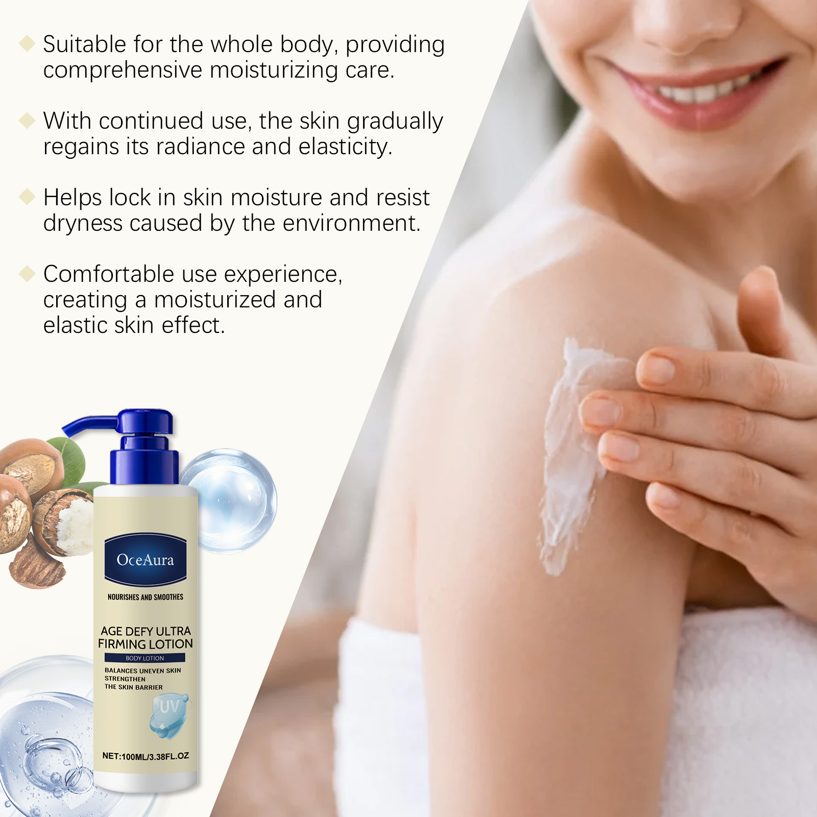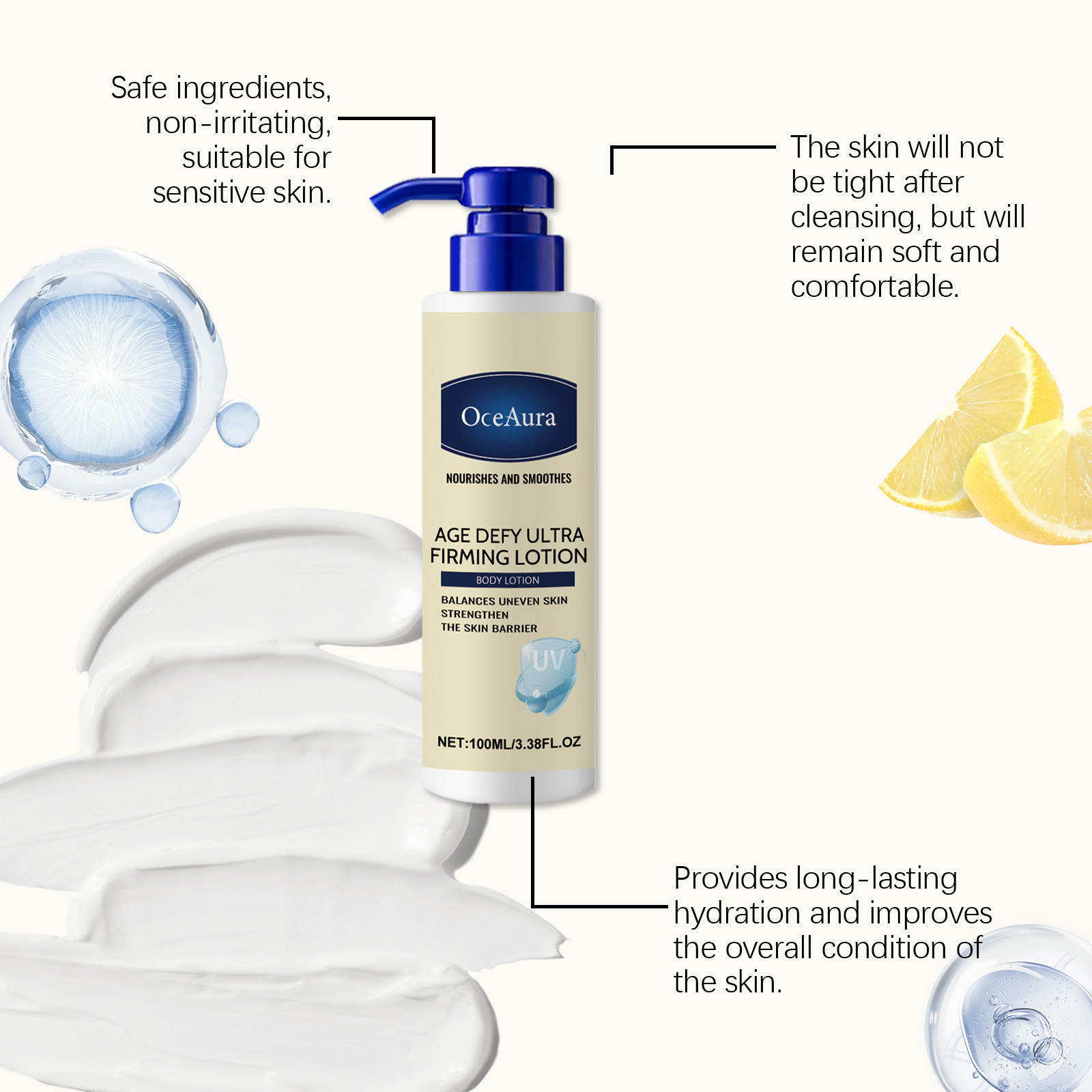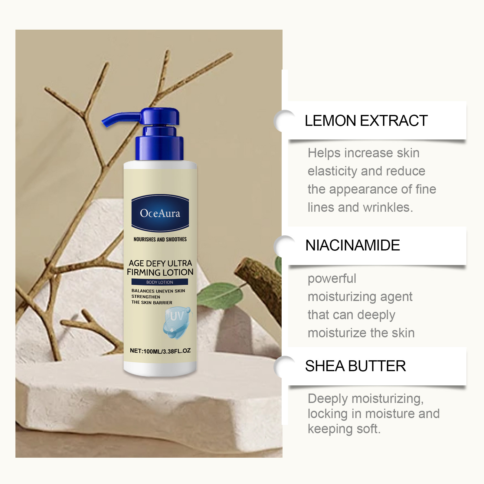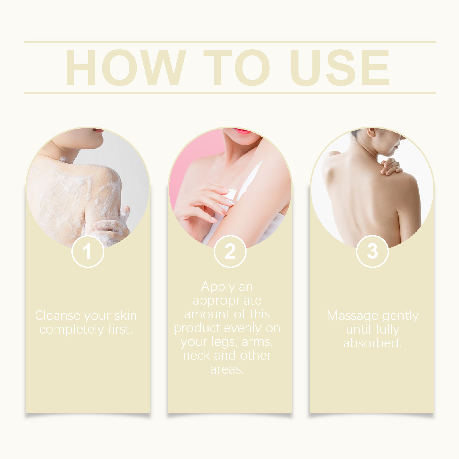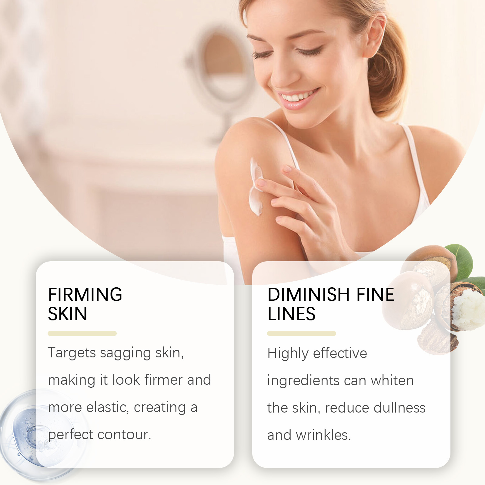 Our firming body lotion contains niacinamide and hyaluronic acid. It targets loose skin, making it look firmer and more elastic, creating the perfect silhouette. High-potency ingredients whiten skin and reduce dullness and wrinkles. Its use method is very simple: first thoroughly clean your skin, take an appropriate amount of this product evenly apply to the legs, arms, neck and other parts. Massage gently until fully absorbed. And can help repair the skin and improve shine and smoothness.