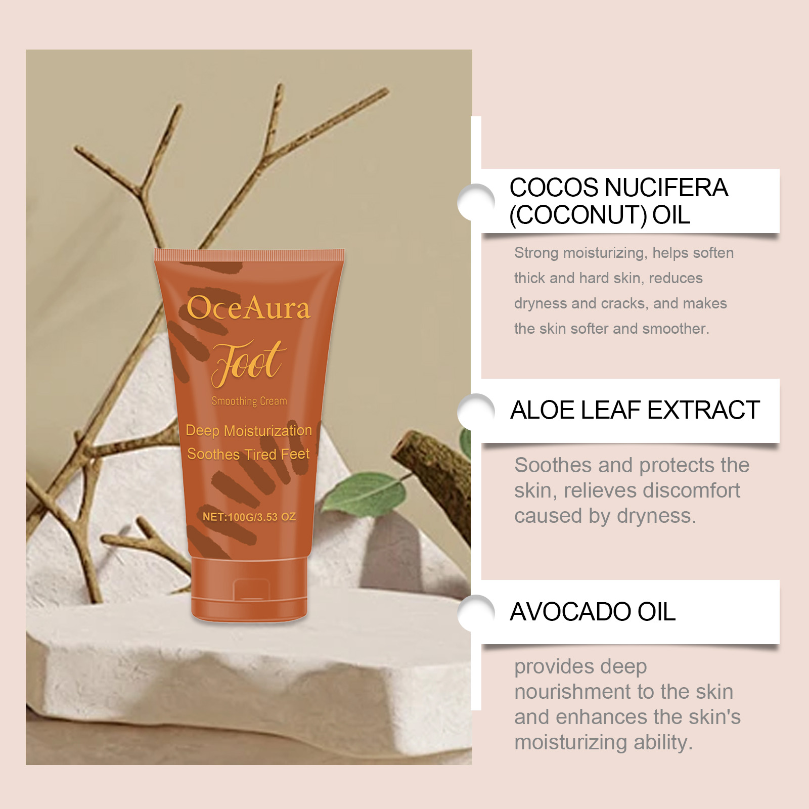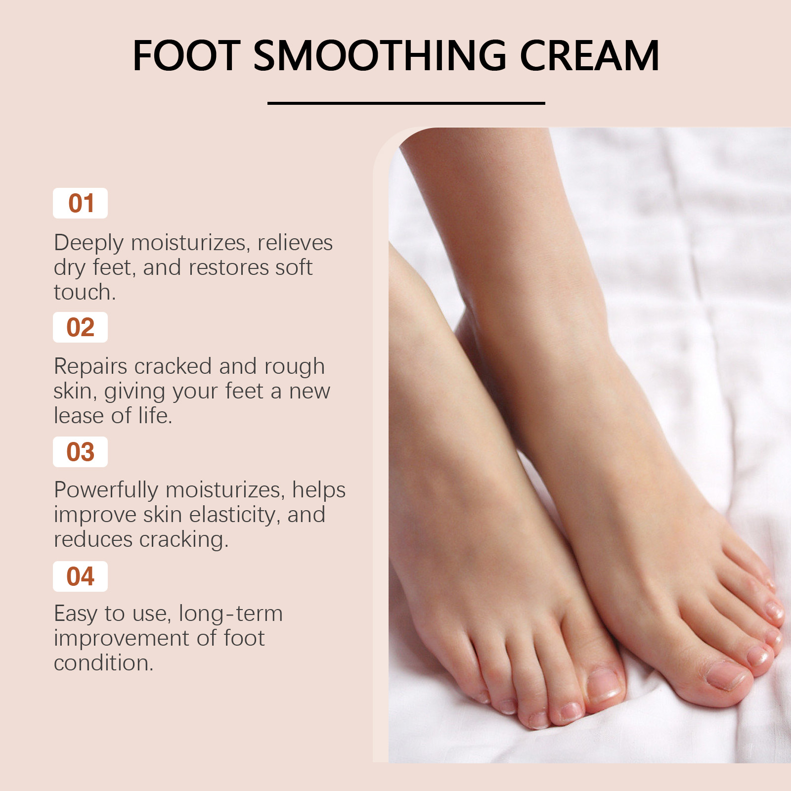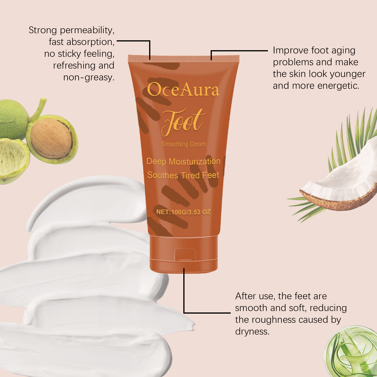 Our foot moisturizing cream contains coconut oil, avocado oil, aloe vera extract. It can effectively repair rough, chapped foot skin and help restore health and smoothness. Its use method is very simple: 1. Clean foot skin and keep dry; 2. Apply appropriate amount to heel evenly. Feet, ankles, elbows, legs and other parts of the body. 3. Gently massage until fully absorbed. Continuous moisturizing improves dryness and keeps feet soft for a long time.