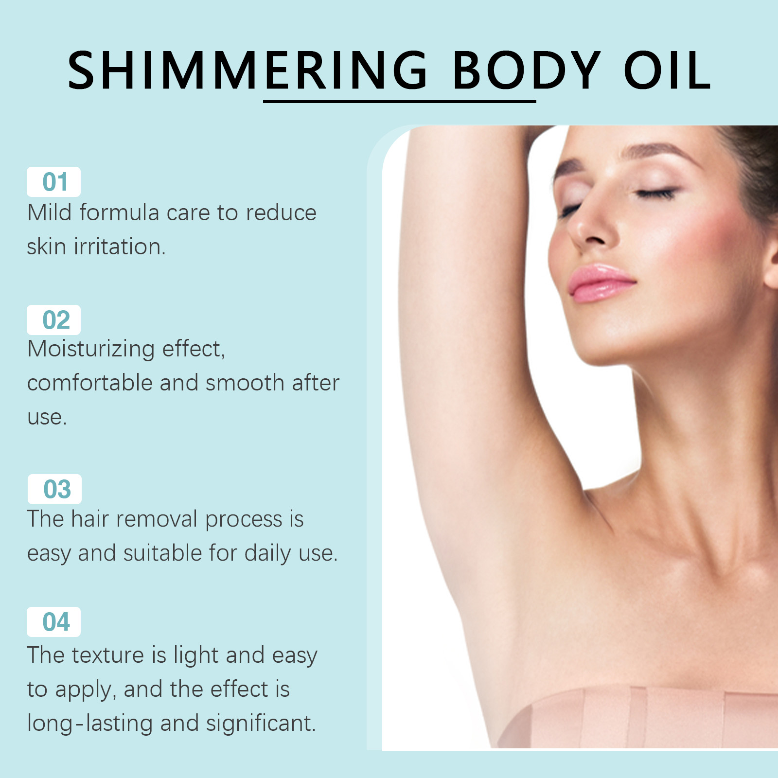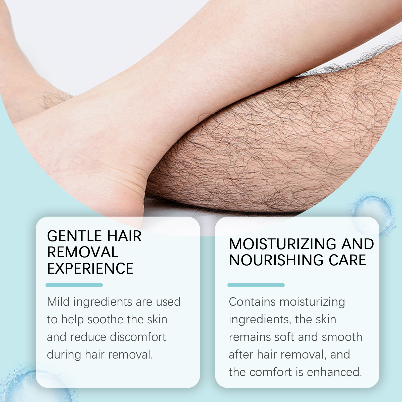Our gentle hair removal cream contains glycerin, calcium thioglycolate and olive oil. After its use, the skin is smooth and fine, no irritation, suitable for daily hair removal care. Suitable for quick hair removal at any time. The way to use it is very simple: after the hair is dry, apply it evenly on the hair with water for 5-10 minutes. Gently scrape off the removal area and completely cover the gel and hair. And the gentle ingredients help soothe the skin and reduce discomfort during hair removal. With moisturizing ingredients, the skin remains soft and smooth after hair removal, and the comfort is enhanced.