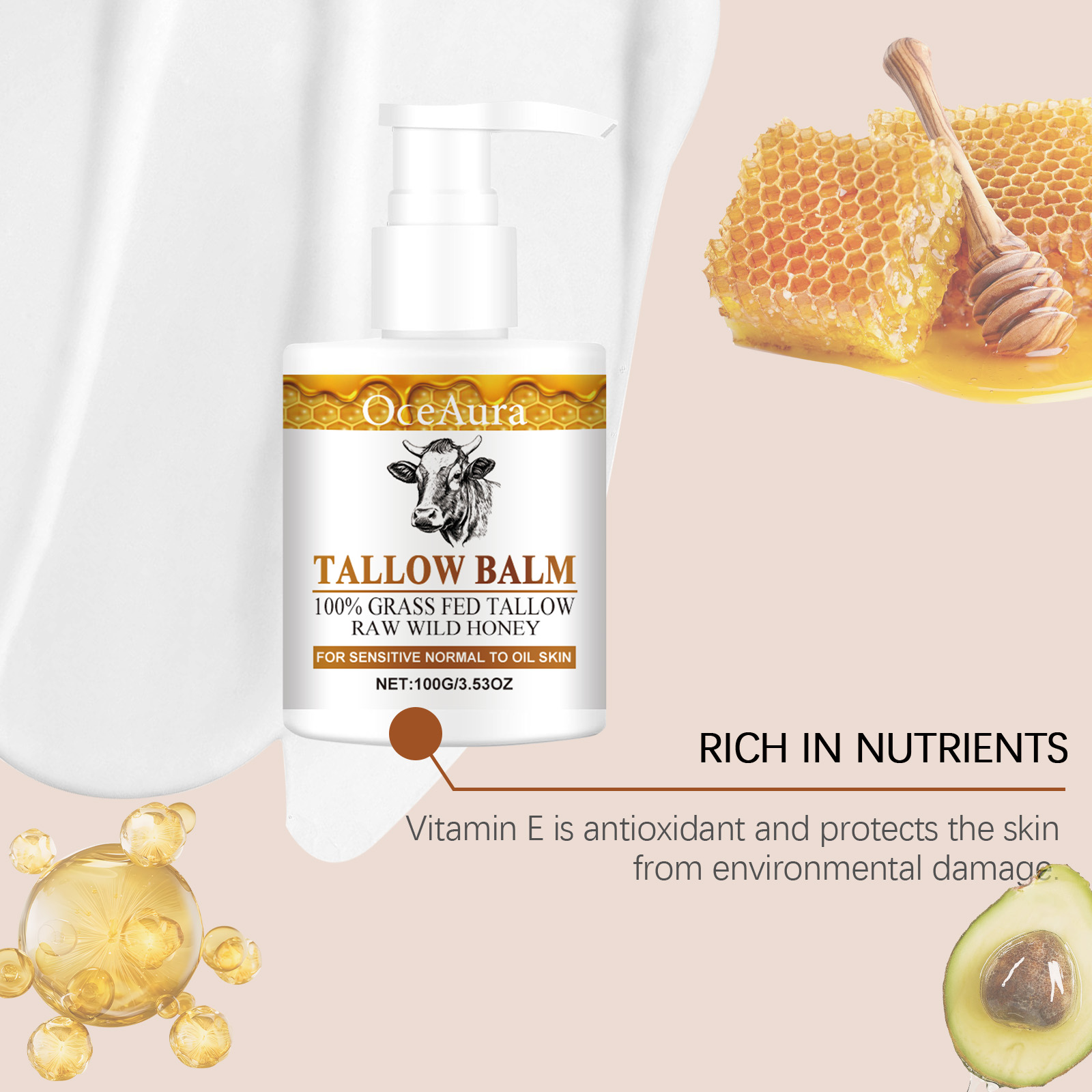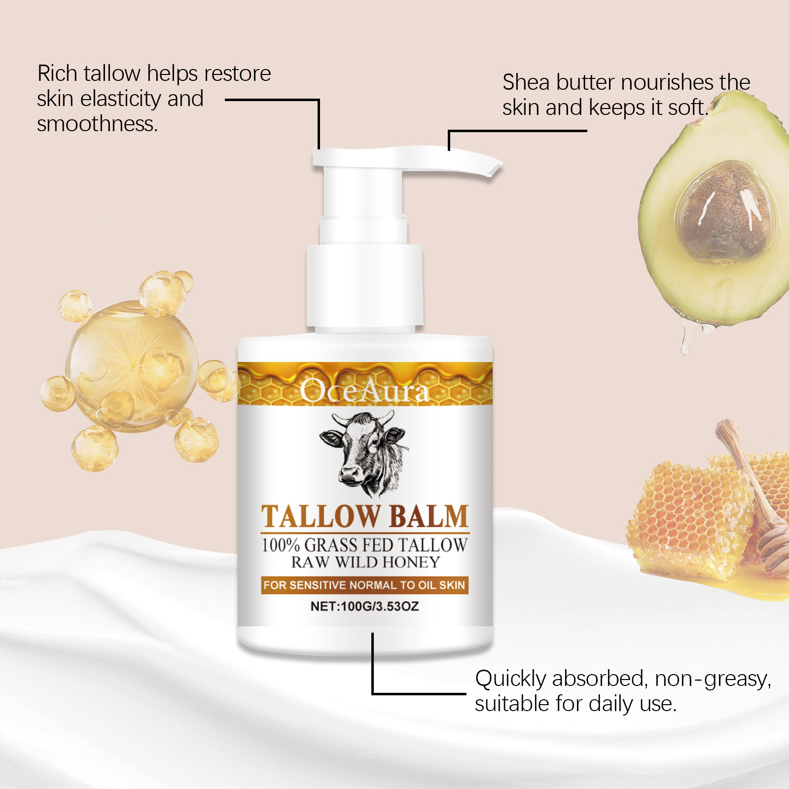Our Honey butter moisturizer contains shea butter, tallow and avocado oil. It can restore skin elasticity and enhance moisturizing effect. Nourishes the skin, provides vitamins and fatty acids, and increases shine. The way to use it is simple: 1. Clean your skin and keep it dry. 2. Apply appropriate amount of moisturizing cream evenly on the face or whole body, such as neck, thighs, arms, etc. 3. Massage gently to promote absorption. Naturally moisturizes, soothes skin and maintains moisture balance; Shea butter and butter provide long-lasting moisture and improve dryness. Avocado oil and honey extract naturally care for the skin.