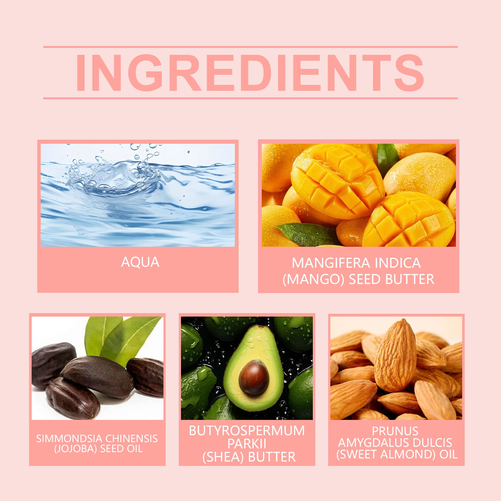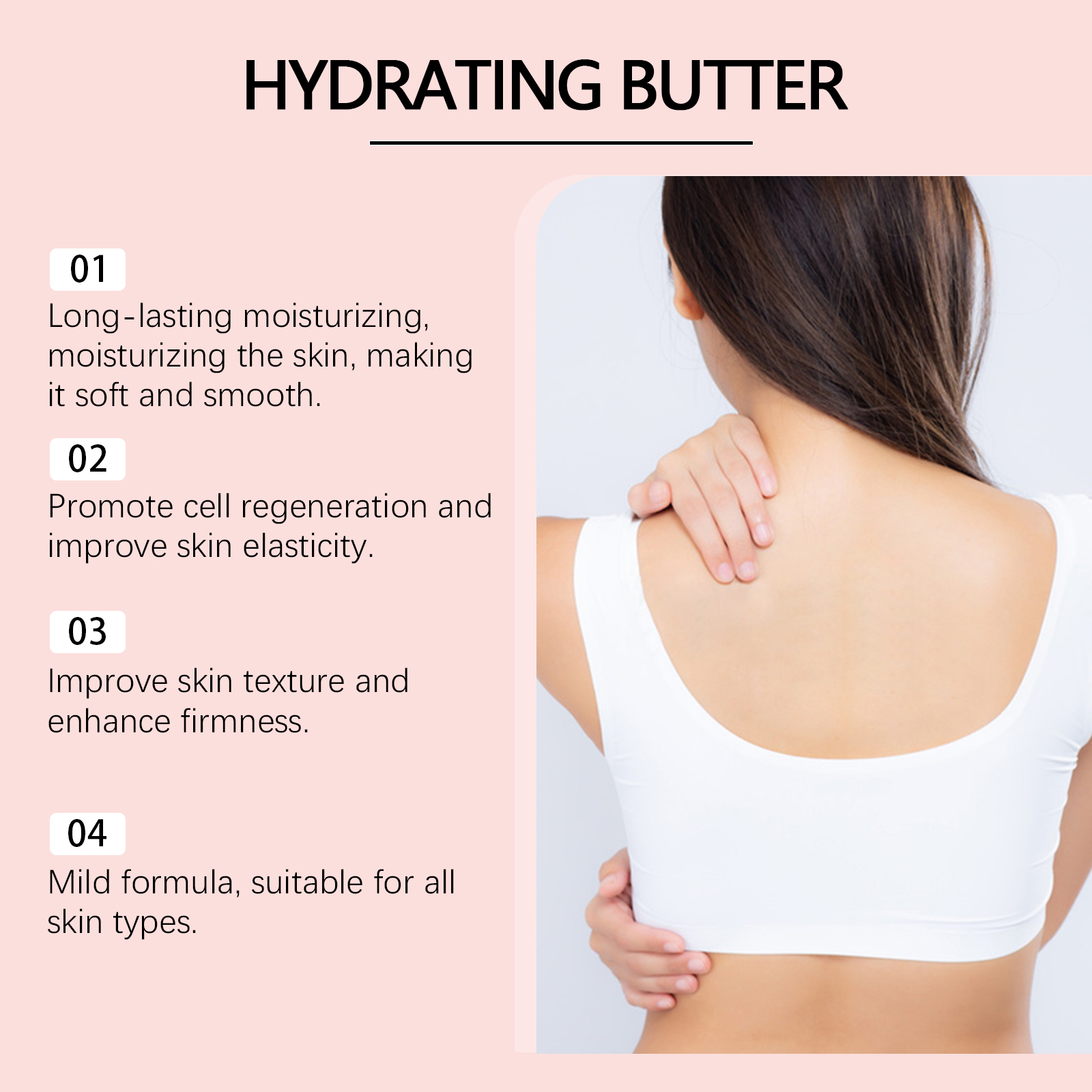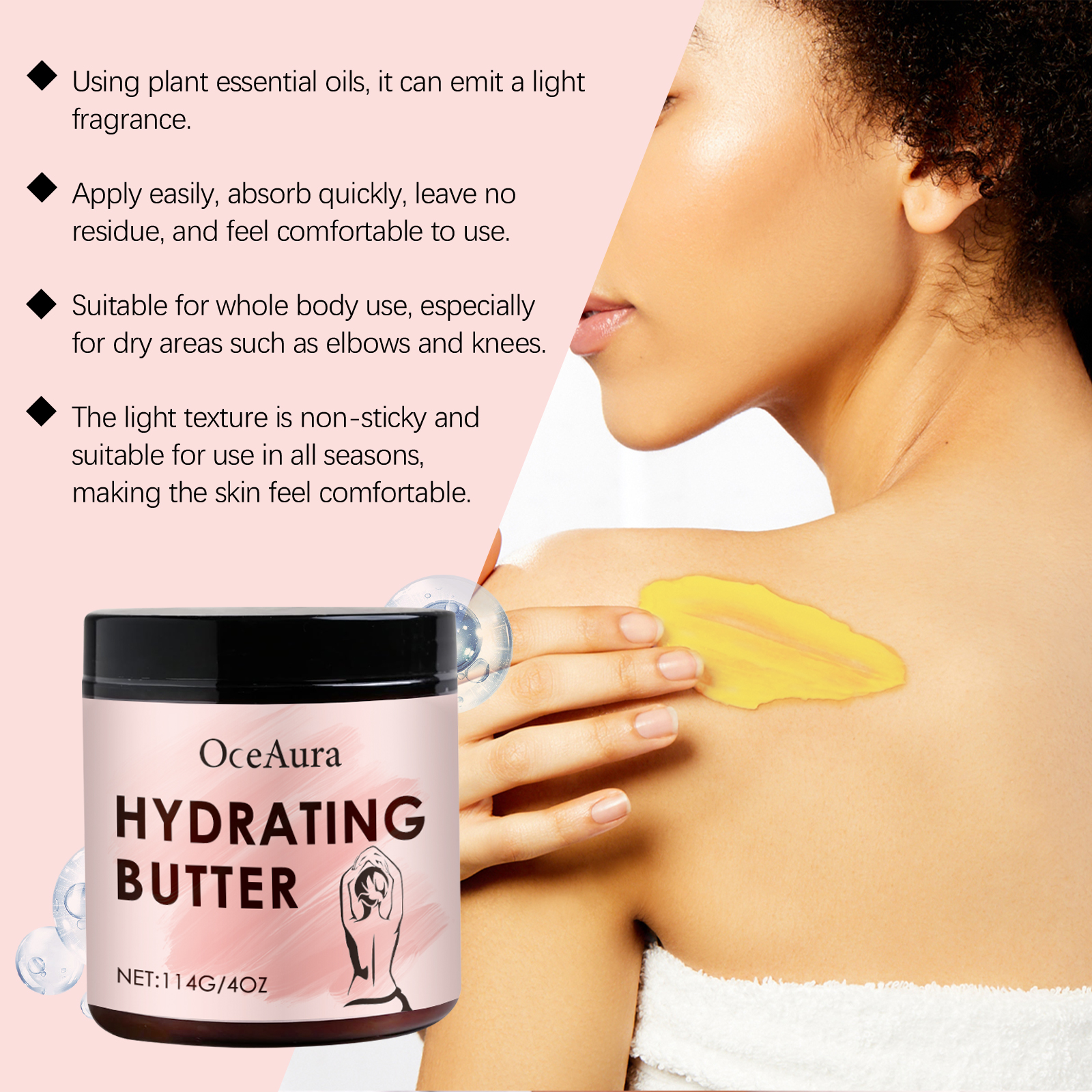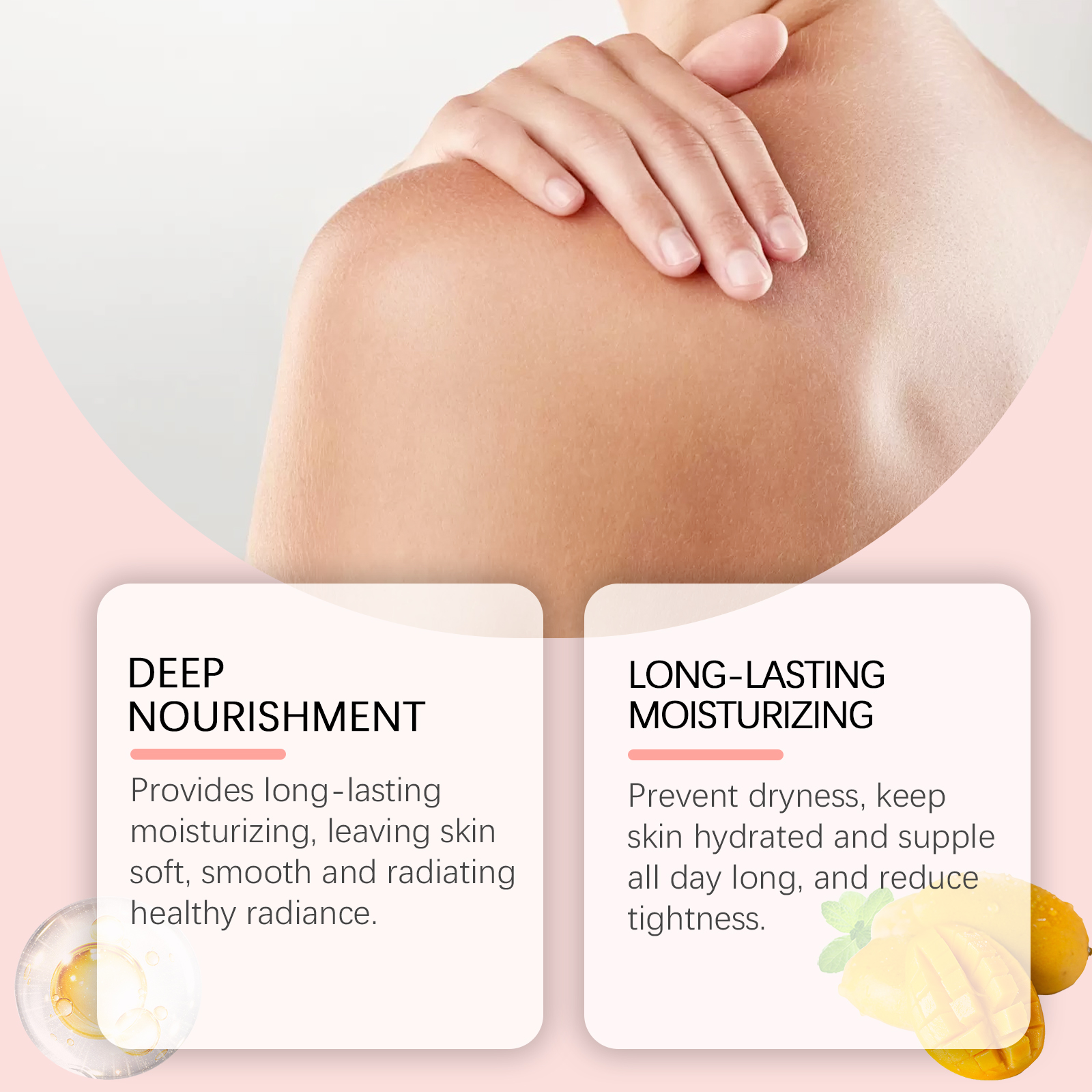 Our moisturizing skin cream contains mango seed oil, Jojoba seed oil, avocado oil. It provides long-lasting moisture, leaving skin soft, smooth and with a healthy glow. Its application method is simple: 1. Thoroughly clean and dry the skin; 2. Apply appropriate amount of the product evenly on hands, legs and other parts of the body; 3. Massage gently to promote absorption. Prevents dryness, keeps skin hydrated and smooth throughout the day, and reduces tension.