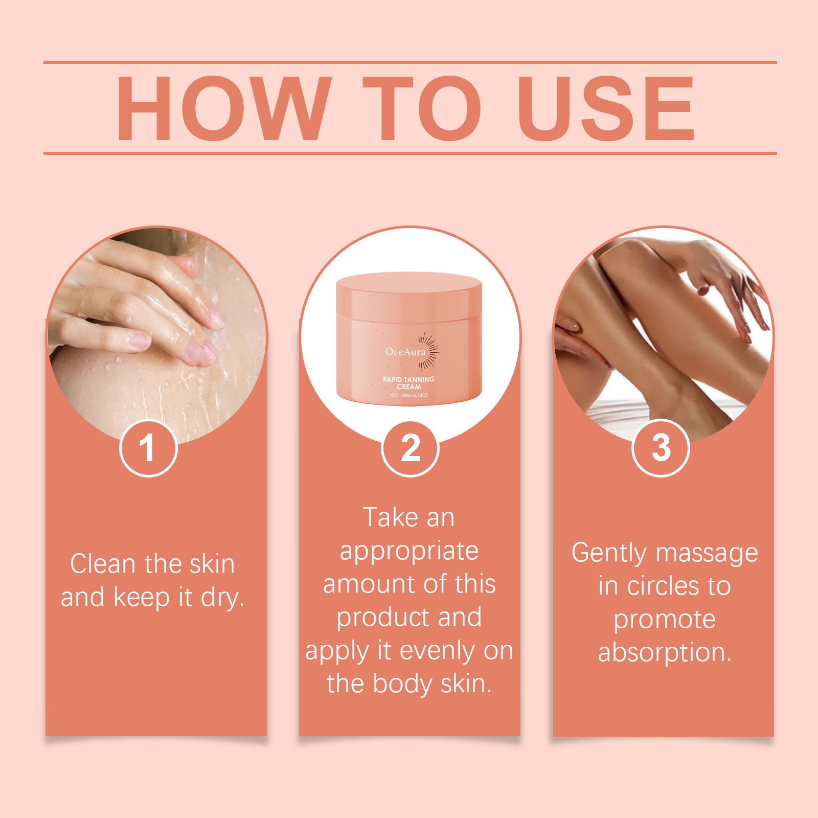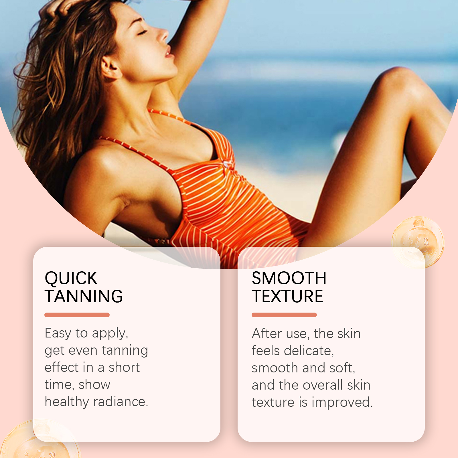 Our moisturizing tanning cream contains triethanolamine, cocoa extract, watermelon fruit extract. It achieves an even tan in a short period of time, revealing a healthy complexion. Its application is simple: cleanse the skin and keep it dry. Apply an appropriate amount evenly to the skin. Massage gently to promote absorption. And after use, the skin feels delicate, smooth and soft, and the overall skin texture is improved.