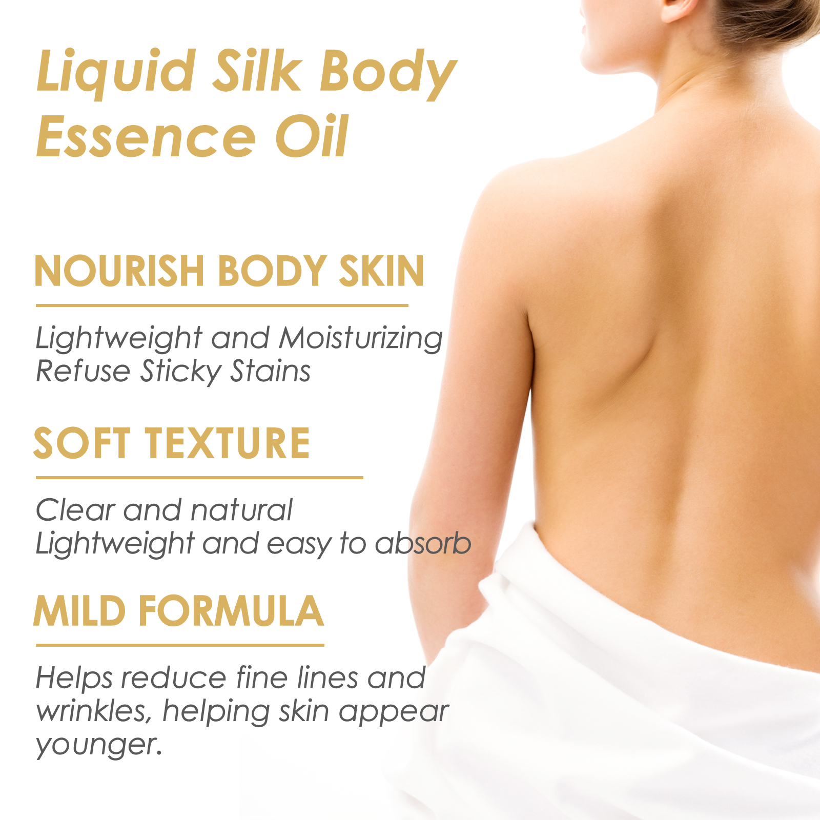 Our Liquid Silk Body Essence Oil contains aloe vera extract, sodium hyaluronate, coffee extract. It moisturizes and fights wrinkles, restores skin shine, helps reduce fine lines and wrinkles, and helps skin look younger. Its application method is very simple: after cleaning the body skin, take appropriate amount of this product, evenly apply to the body skin and gently massage until absorbed. It can effectively moisturize and fight wrinkles, leaving you with young, smooth, full skin.