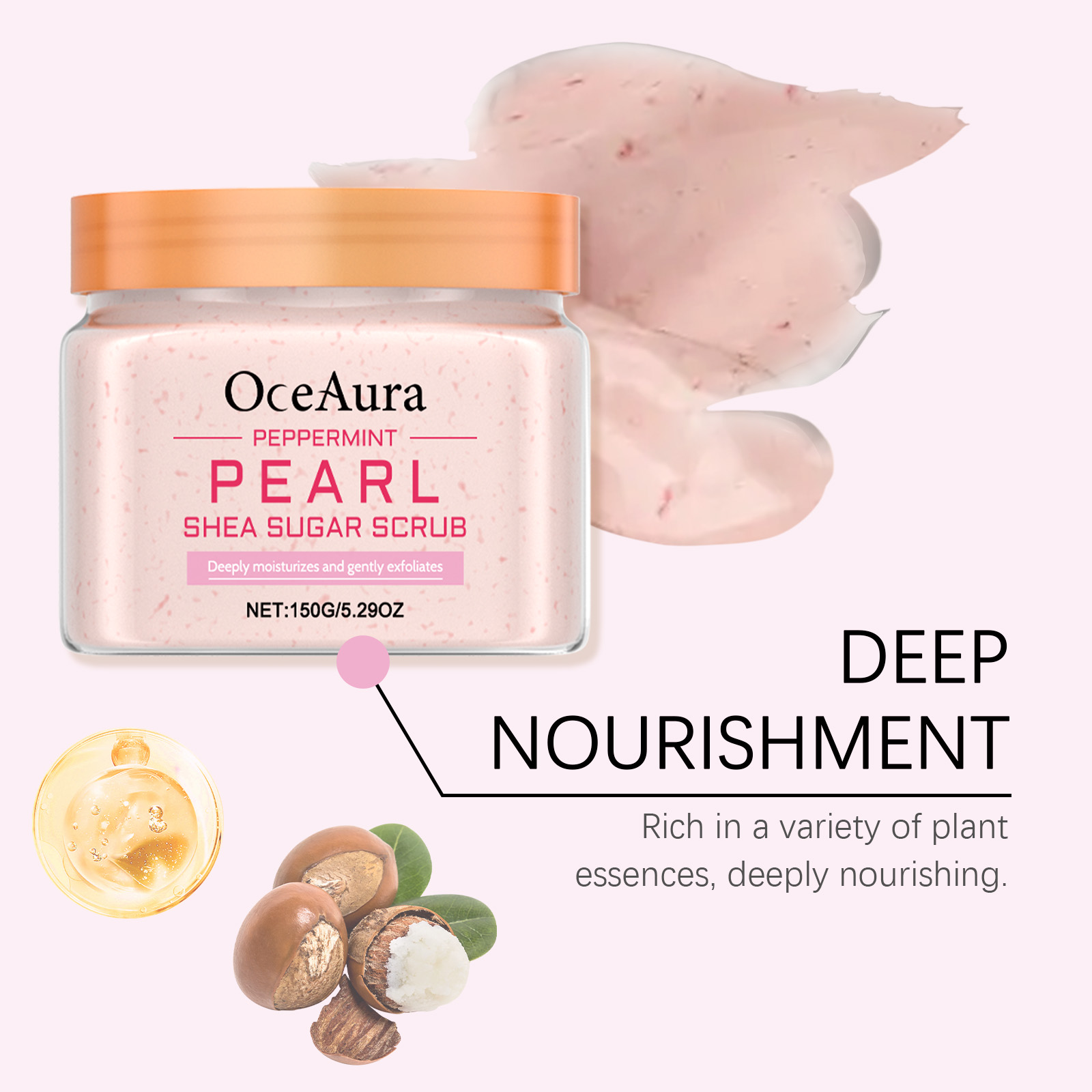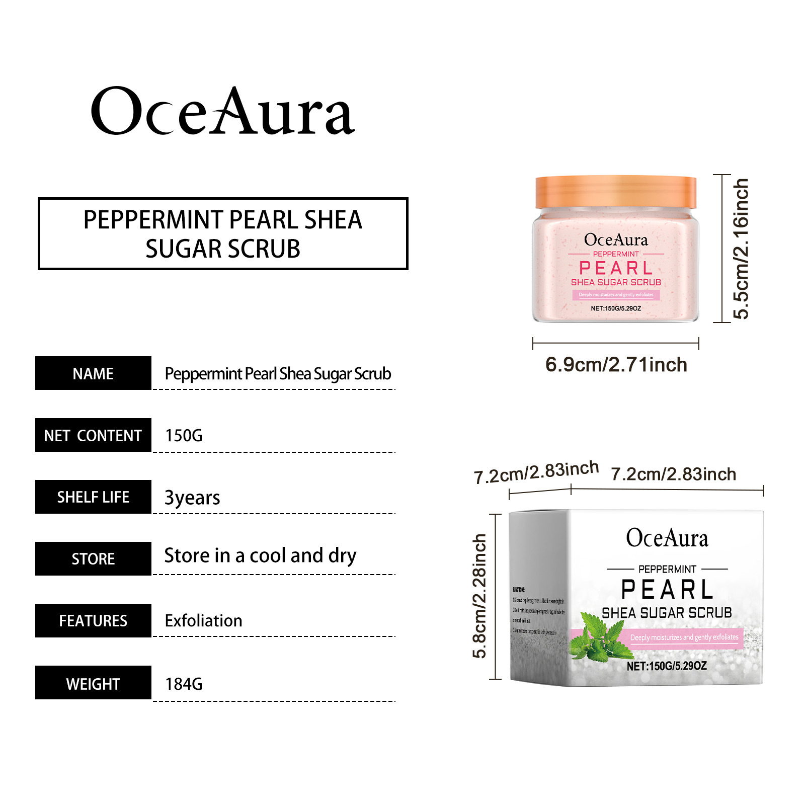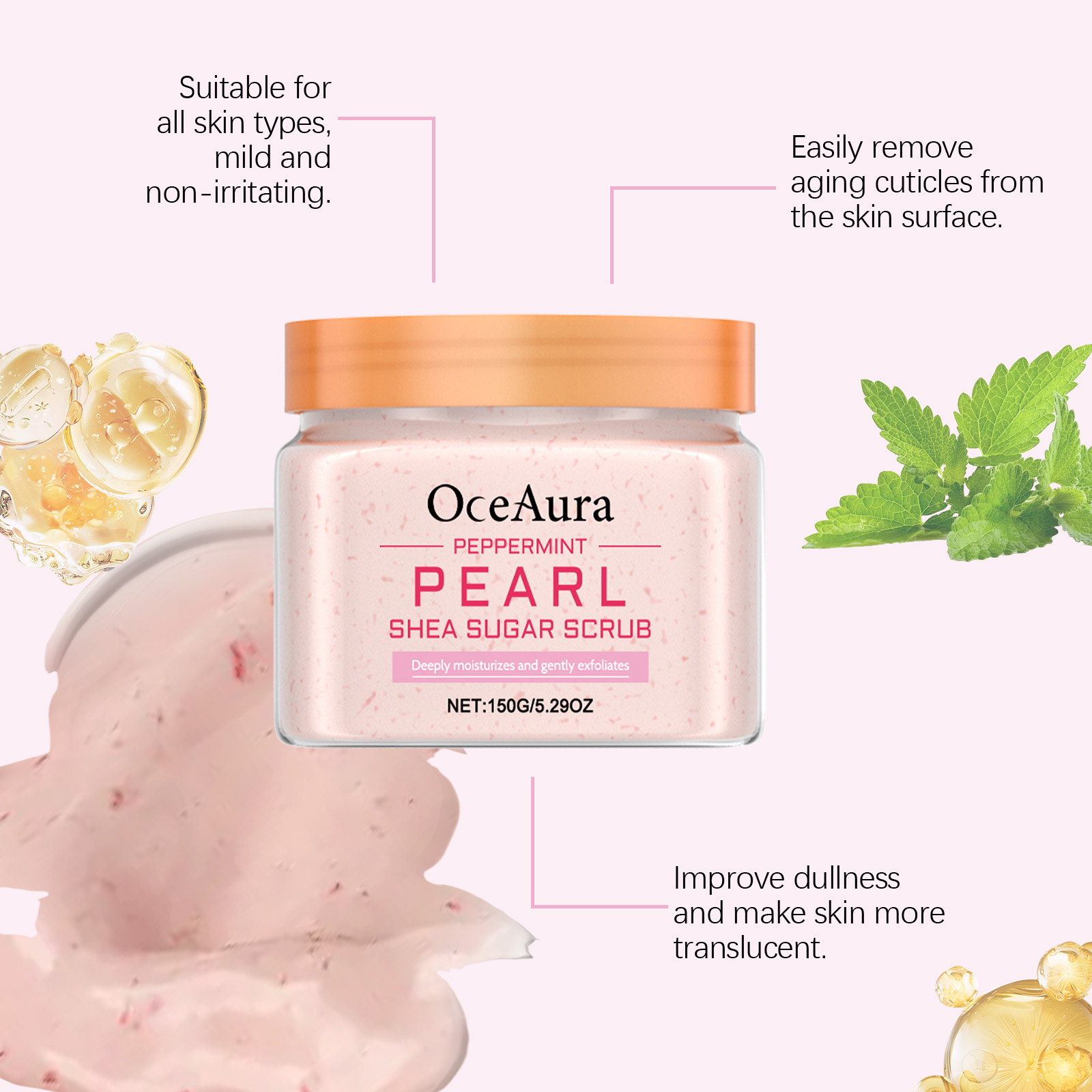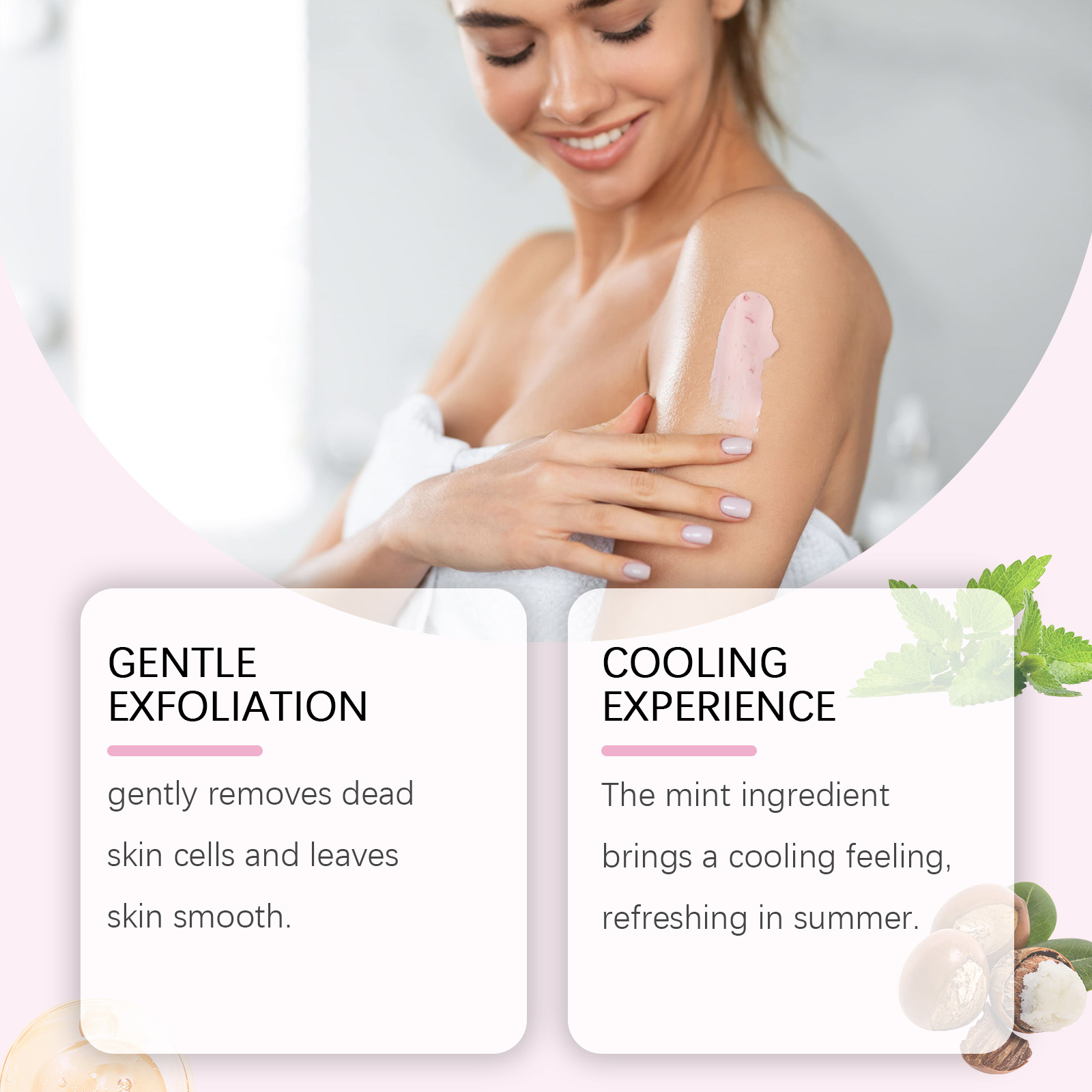 Our peppermint pearl scrub contains shea butter, sweet almond oil and peppermint extract. It gently removes dead skin cells and leaves skin smooth. Peppermint ingredients bring a cool feeling, refreshing in summer. The way to use it is simple: wash moist body skin with warm water. Apply appropriate amount of detergent to wet skin and massage in circular motions. Using the same circular massage motion, rinse the brush with warm water. And after use, the skin becomes brighter and has a natural glow.