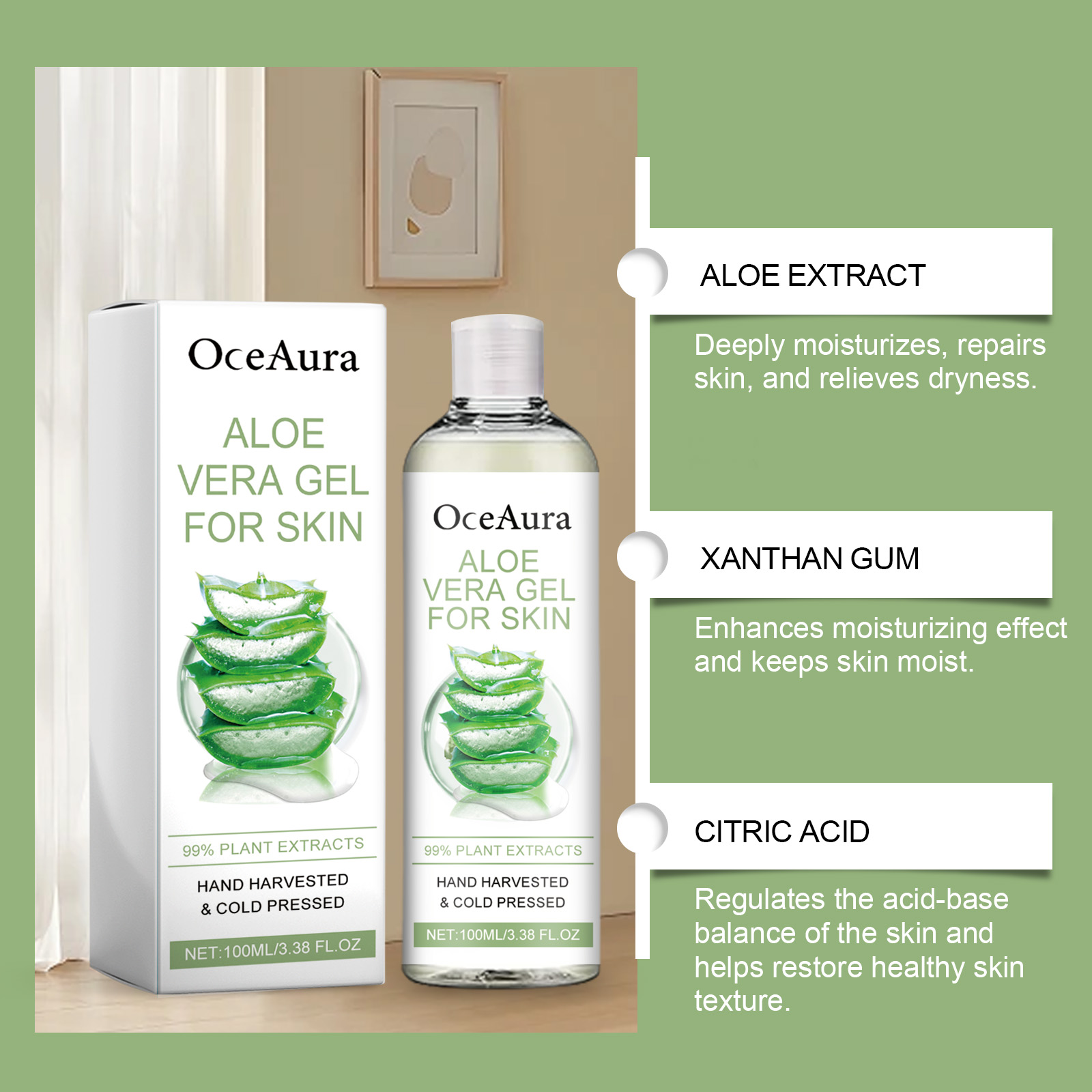Our moisturizing aloe Vera gel contains aloe vera extract, xanthan gum, citric acid. It can be applied to the face and the whole body for a comprehensive moisturizing repair. Aloe Vera extract provides deep moisture and helps repair dry and damaged skin. The way to use it is simple: 1. Clean your skin and keep it dry. 2. Apply proper amount of aloe vera gel to face and body. 3. Gently massage until absorbed. Improves skin elasticity and reduces fine lines and wrinkles. Citric acid balances skin pH and keeps skin healthy.