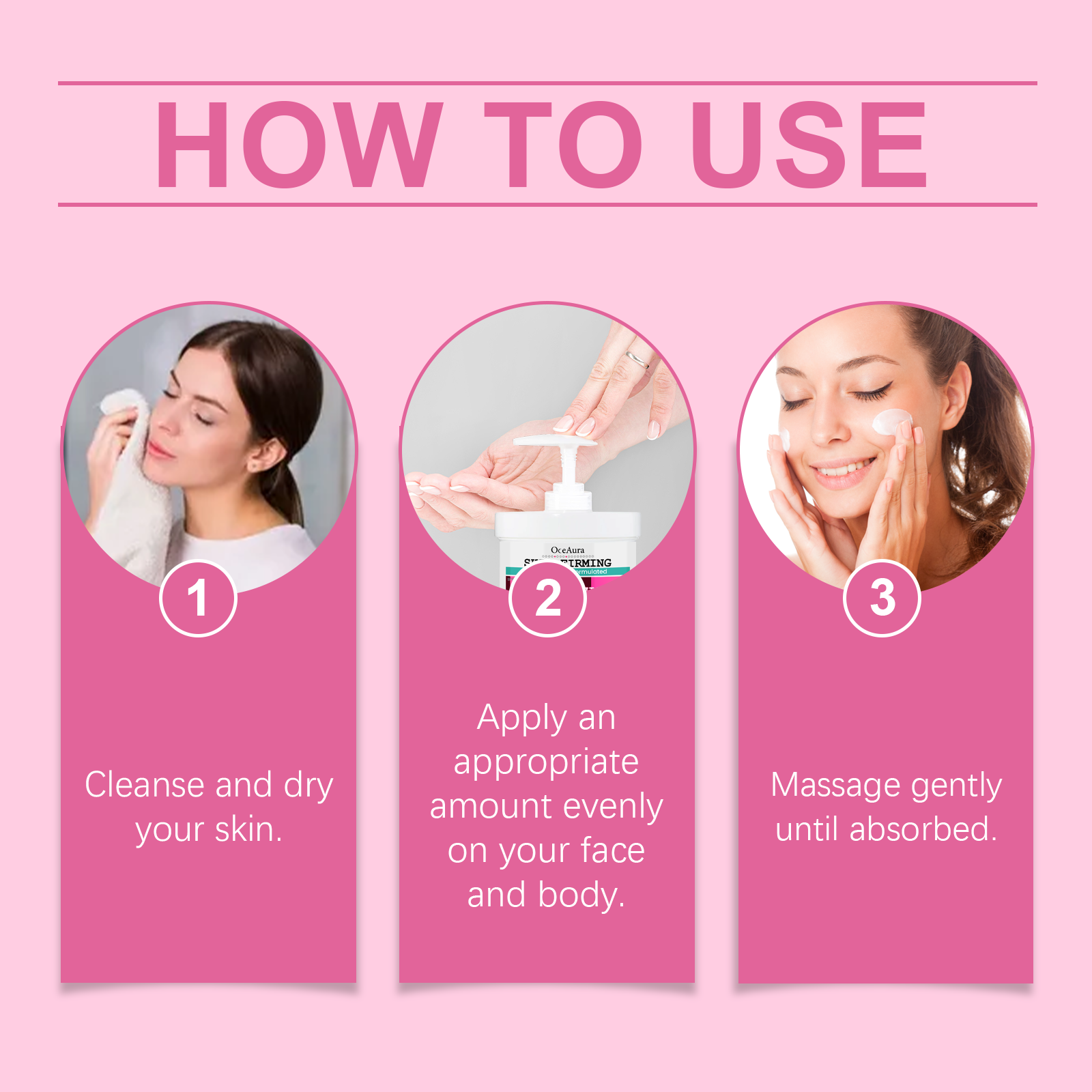 Our moisturizing and firming cream contains glycerin and avocado oil. It helps keep skin firm and youthful. Skin becomes smoother and more delicate after use. The method of application is simple: clean and dry the skin and apply the appropriate amount evenly to the face and body. Gently massage until absorbed. And can deeply moisturize the skin, bring moisturizing touch daily use, improve skin luster, improve skin texture, increase the tactility.