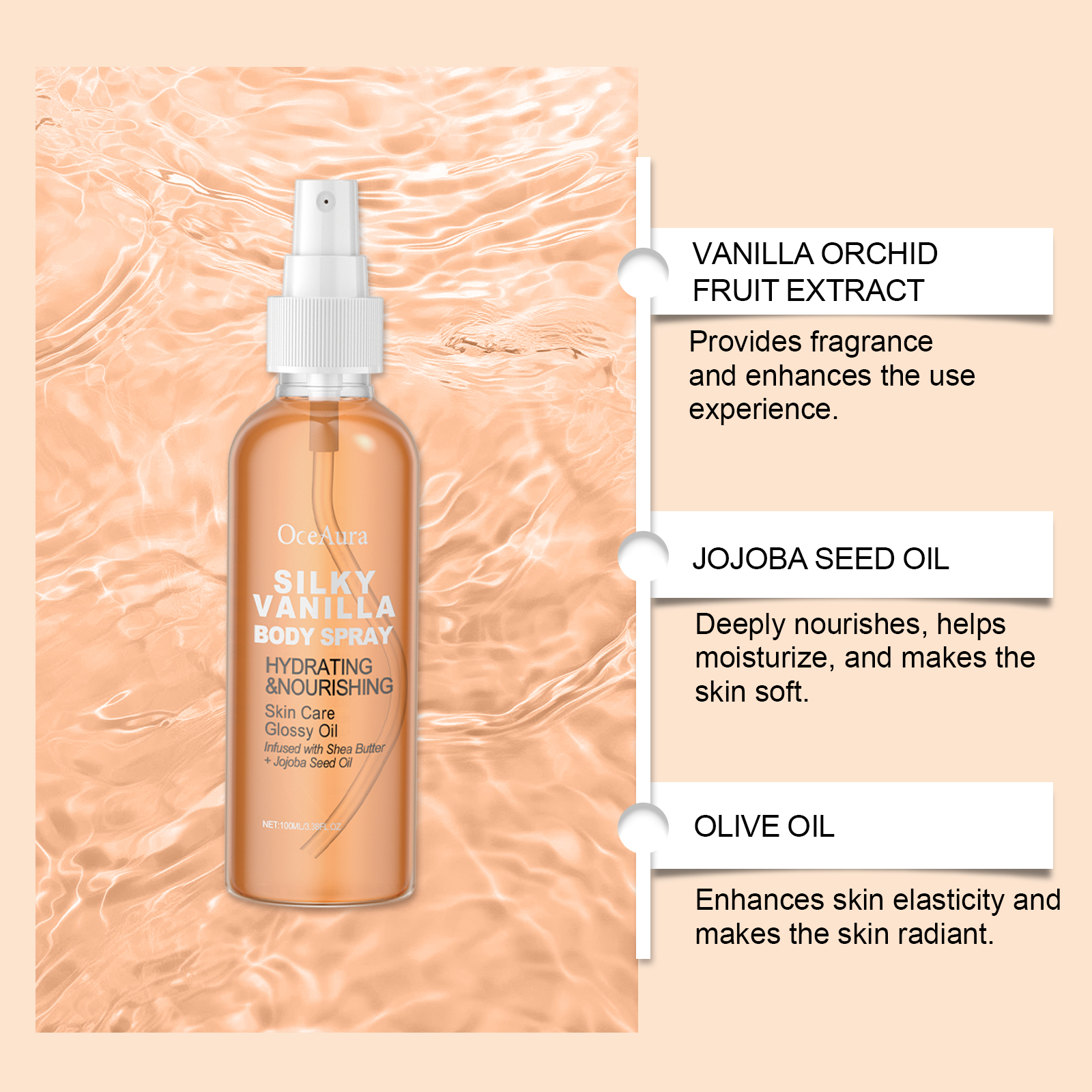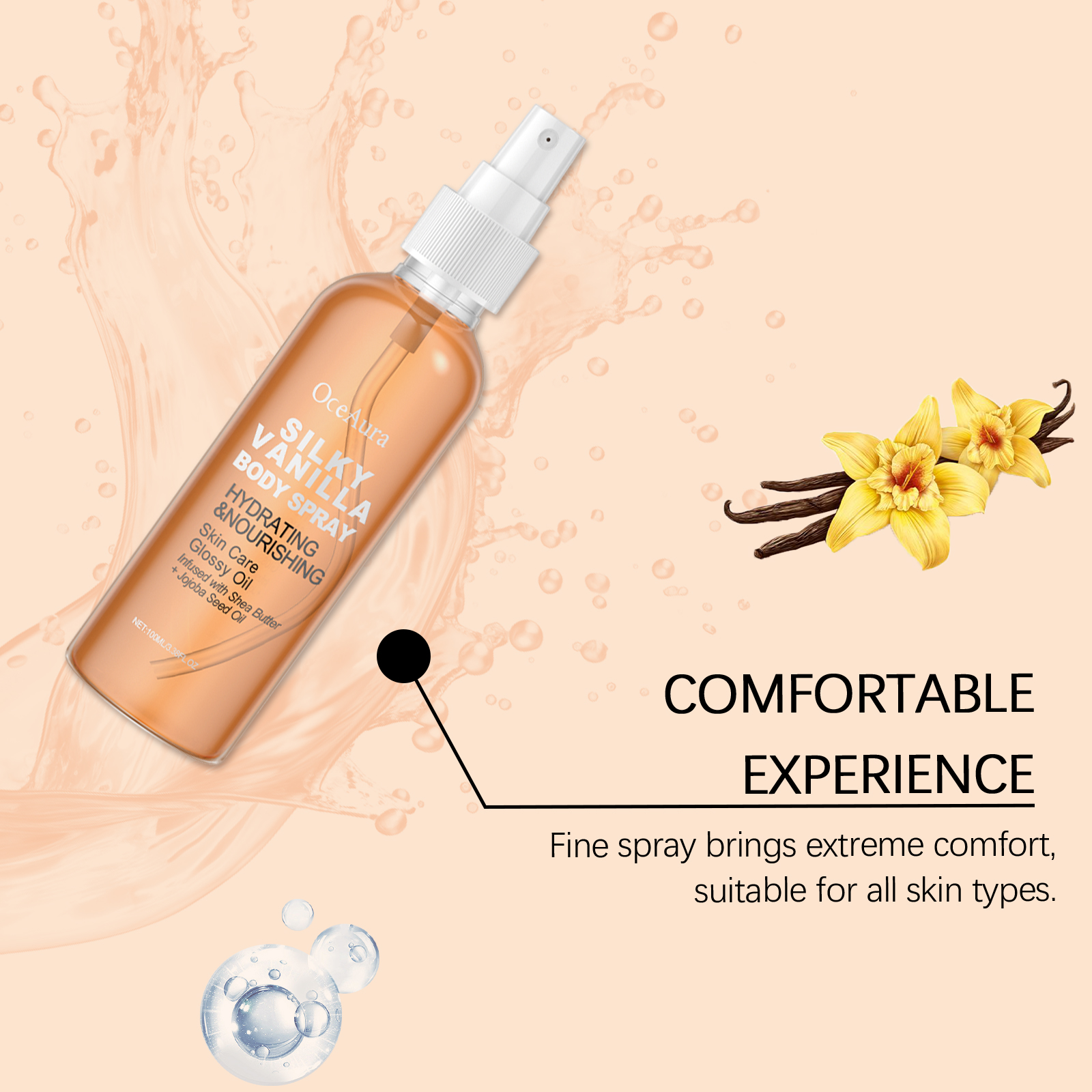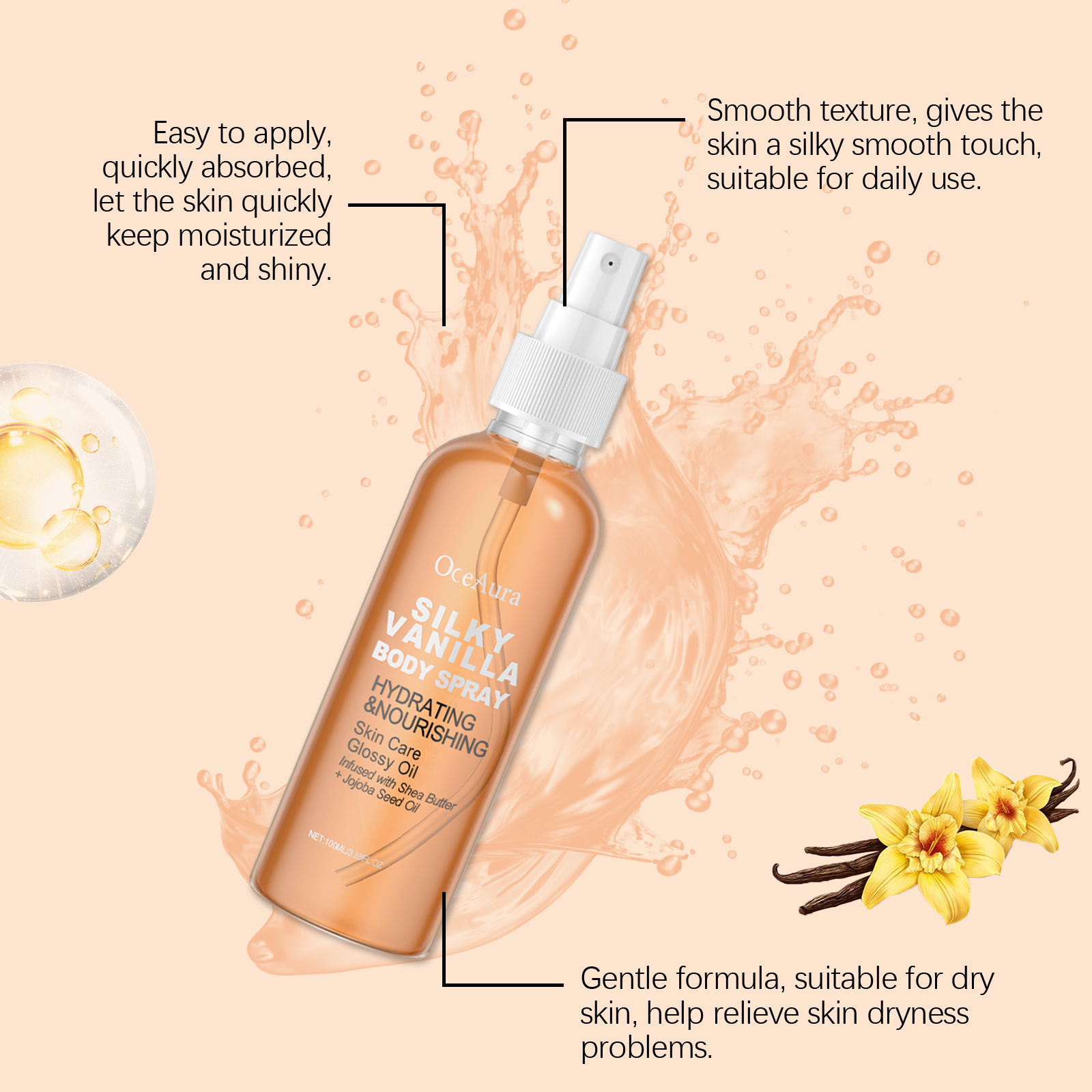 Our Moisturizing body spray contains vanilla fruit extract, Jojoba seed oil and shea butter. It helps the skin retain moisture, keeping it soft and moisturized throughout the day. The way to use it is simple: Clean the skin. Spray the product evenly on the skin and wait for it to be absorbed. The delicate spray easily covers the whole body and keeps the skin smooth and moisturized. Fast absorption, no residue, fresh and not greasy.