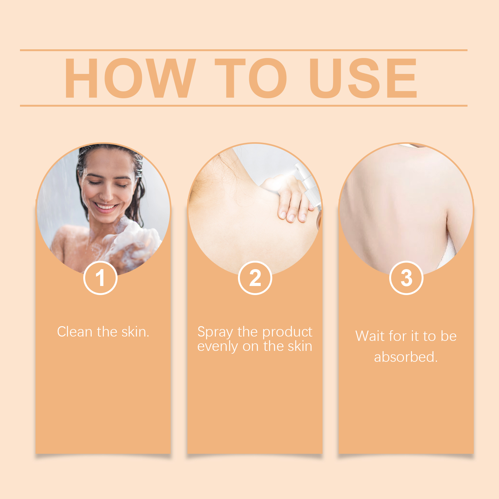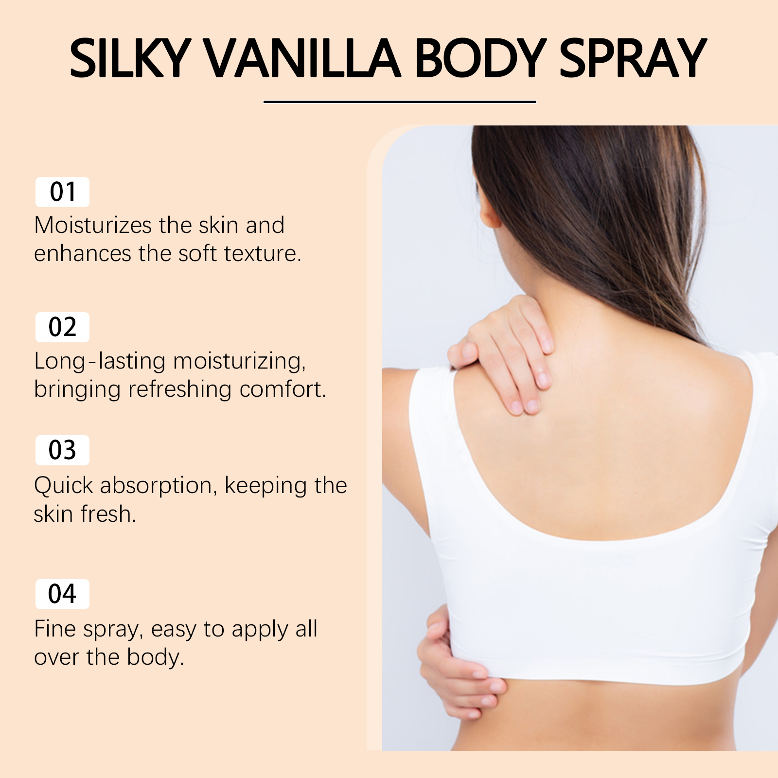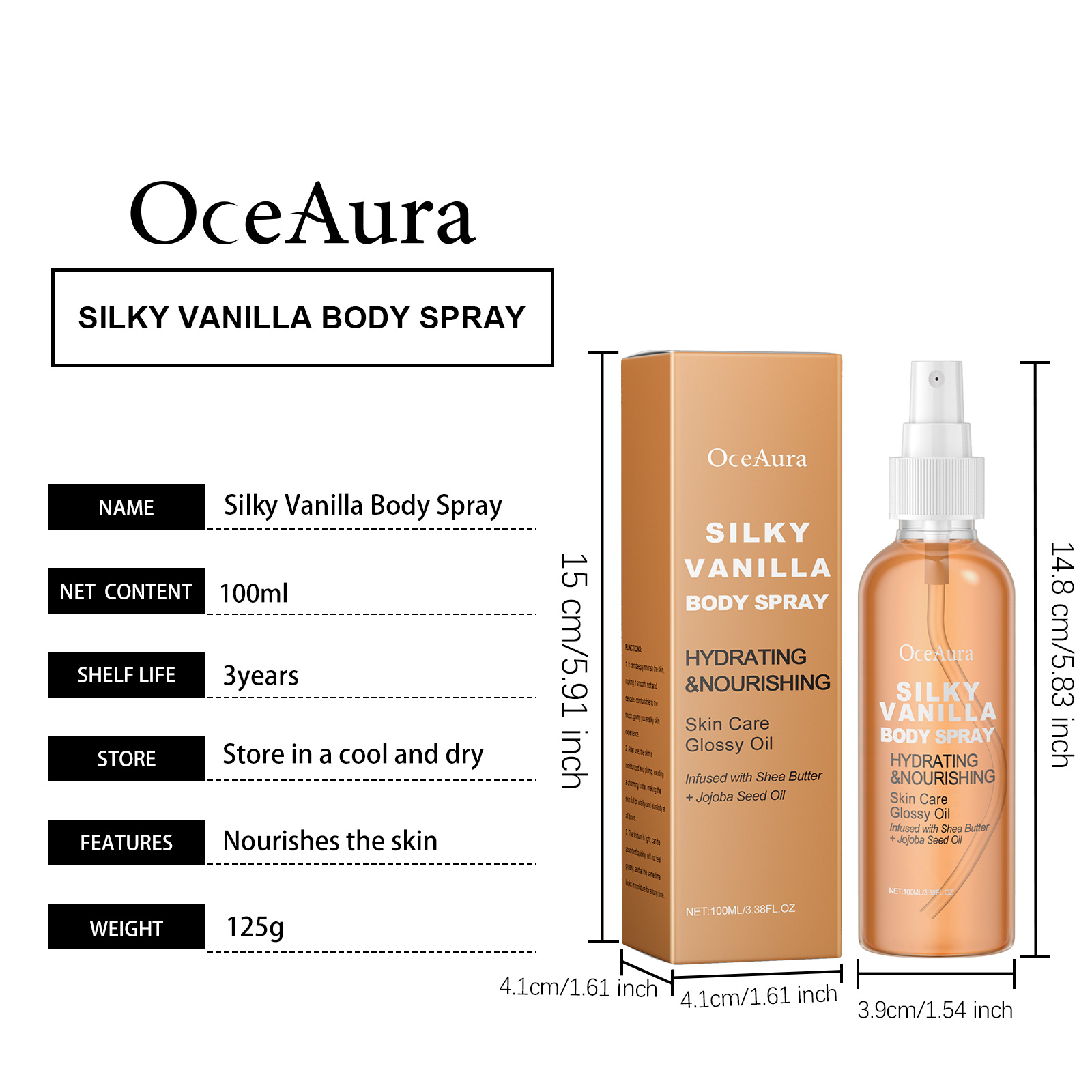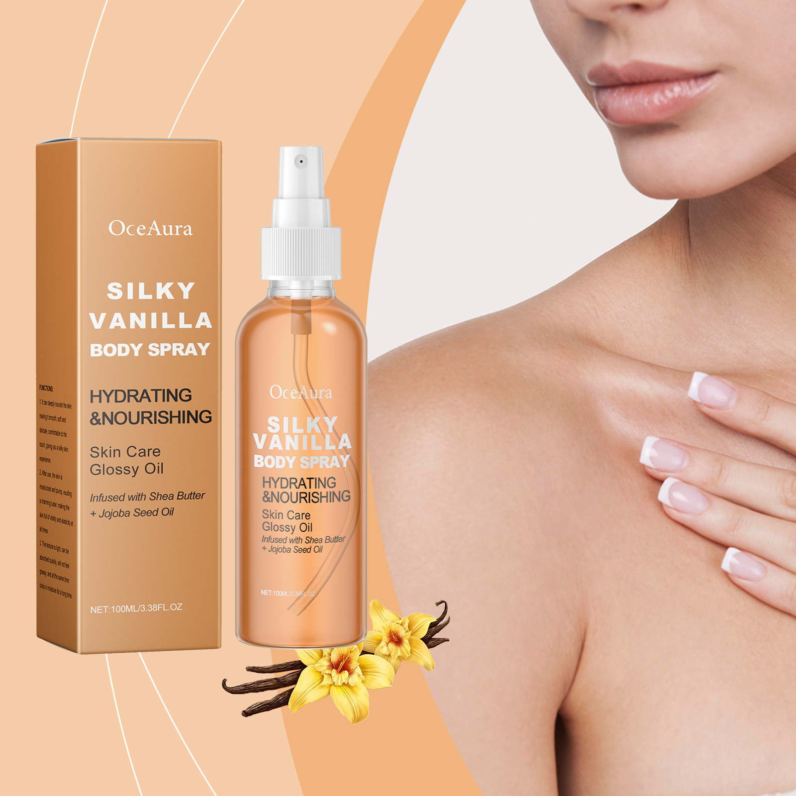Our Moisturizing body spray contains vanilla fruit extract, Jojoba seed oil and shea butter. It helps the skin retain moisture, keeping it soft and moisturized throughout the day. The way to use it is simple: Clean the skin. Spray the product evenly on the skin and wait for it to be absorbed. The delicate spray easily covers the whole body and keeps the skin smooth and moisturized. Fast absorption, no residue, fresh and not greasy.