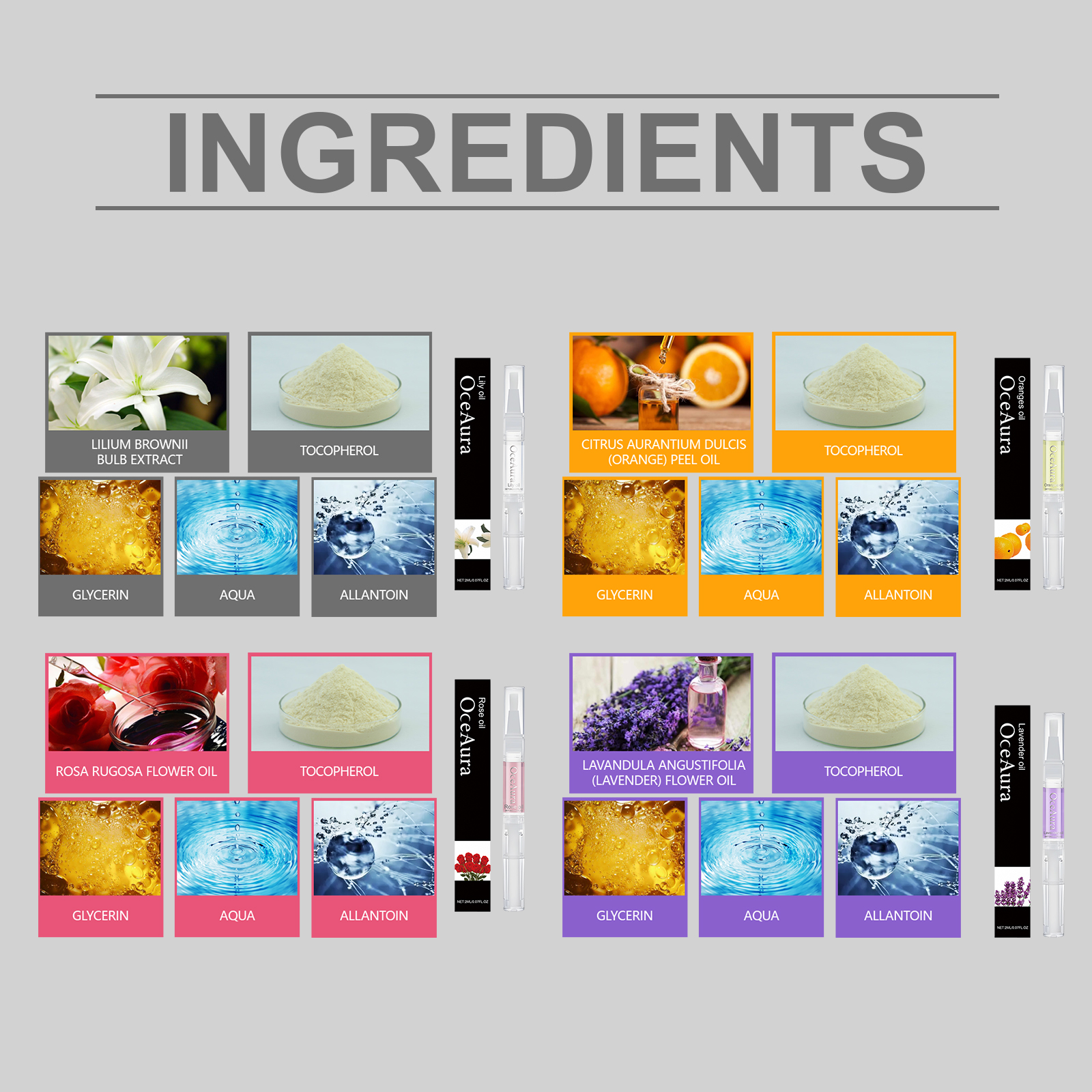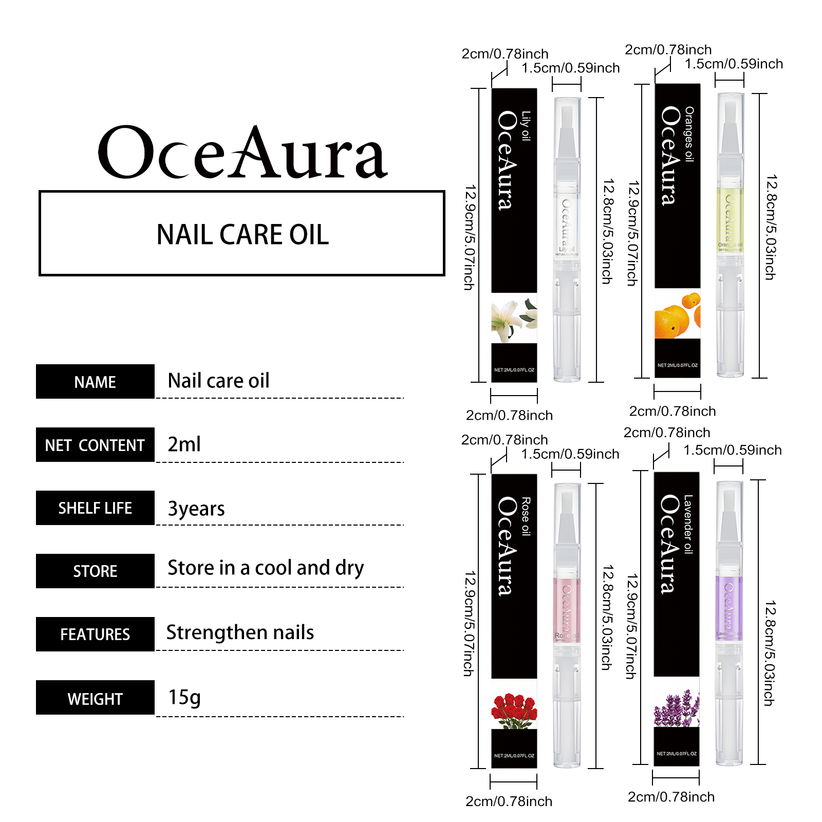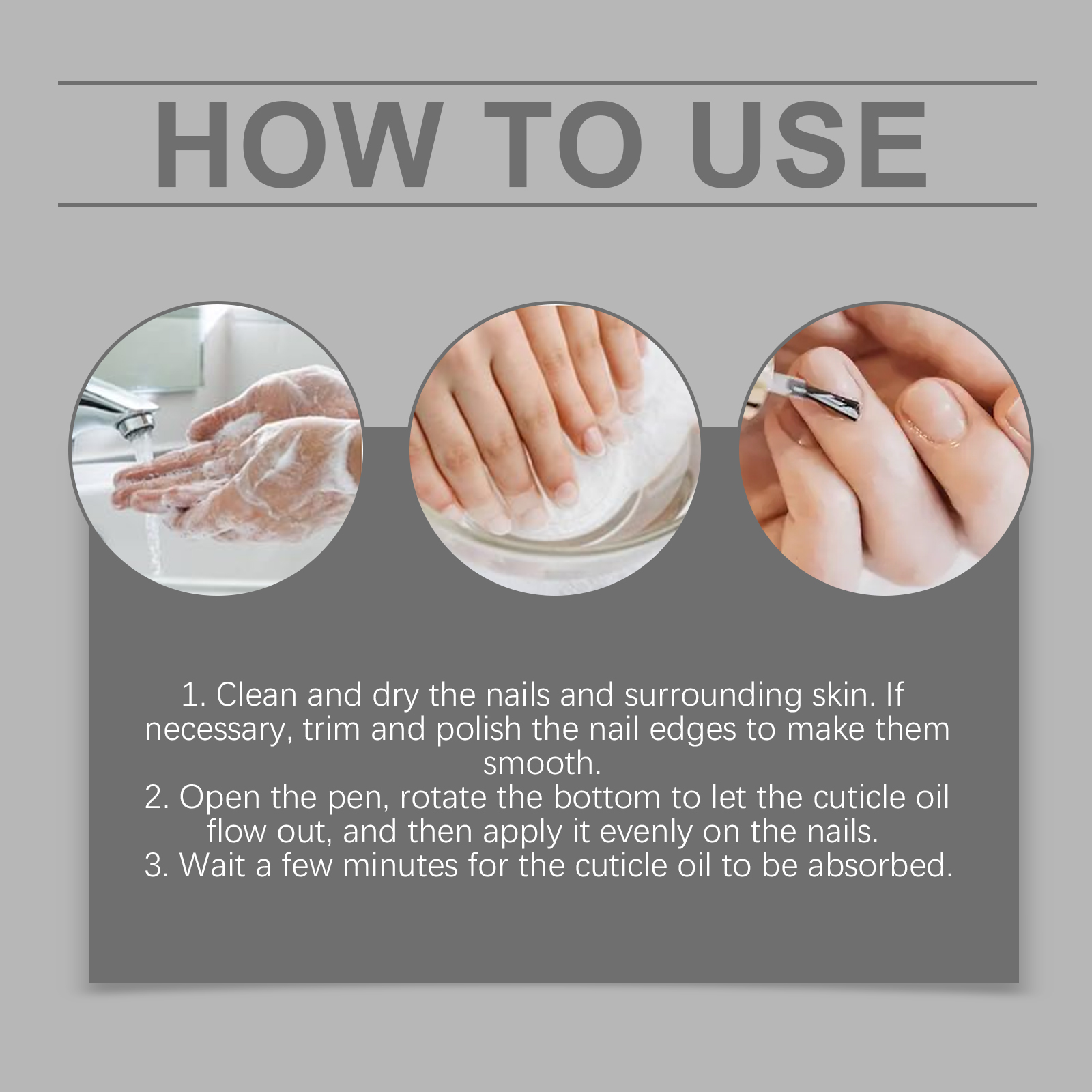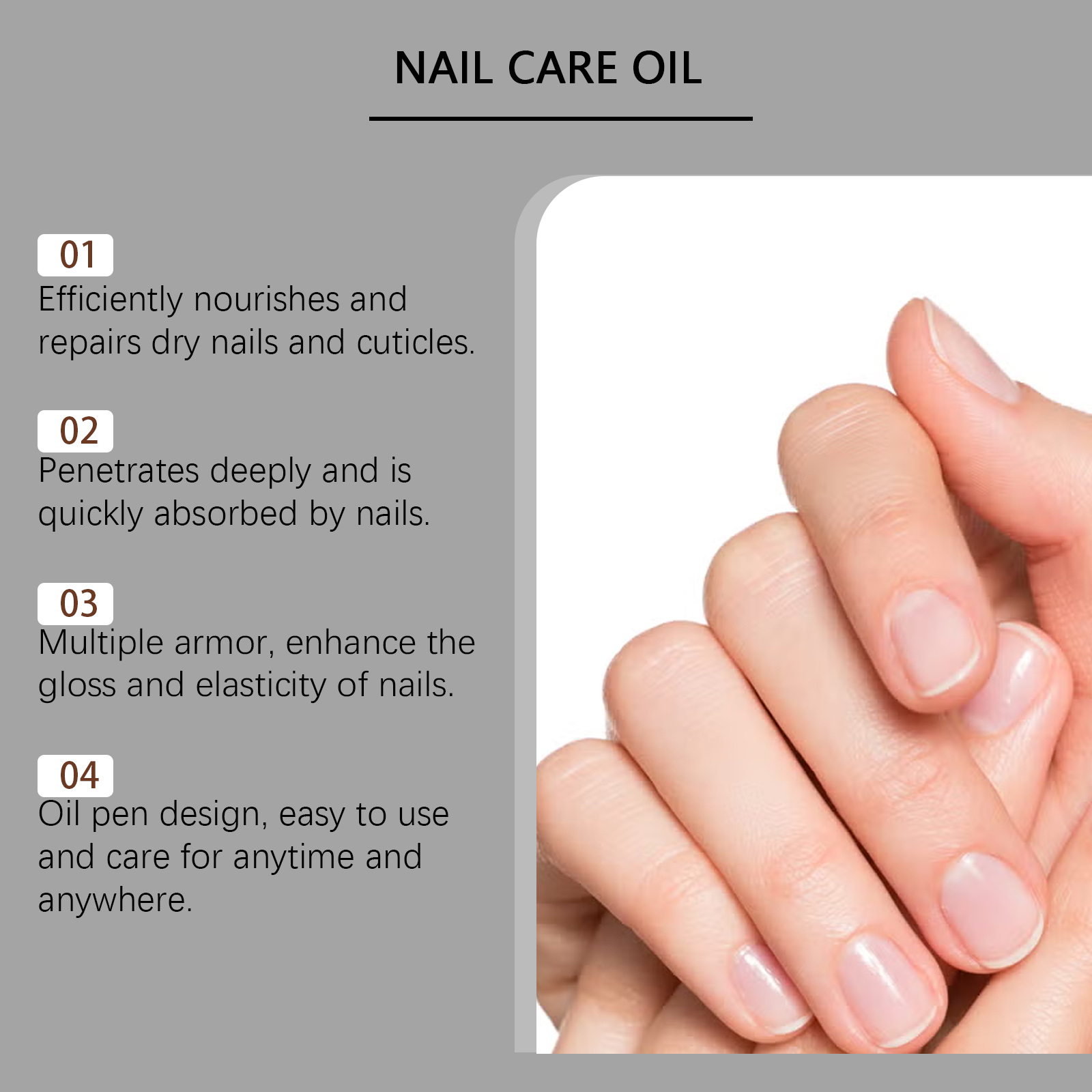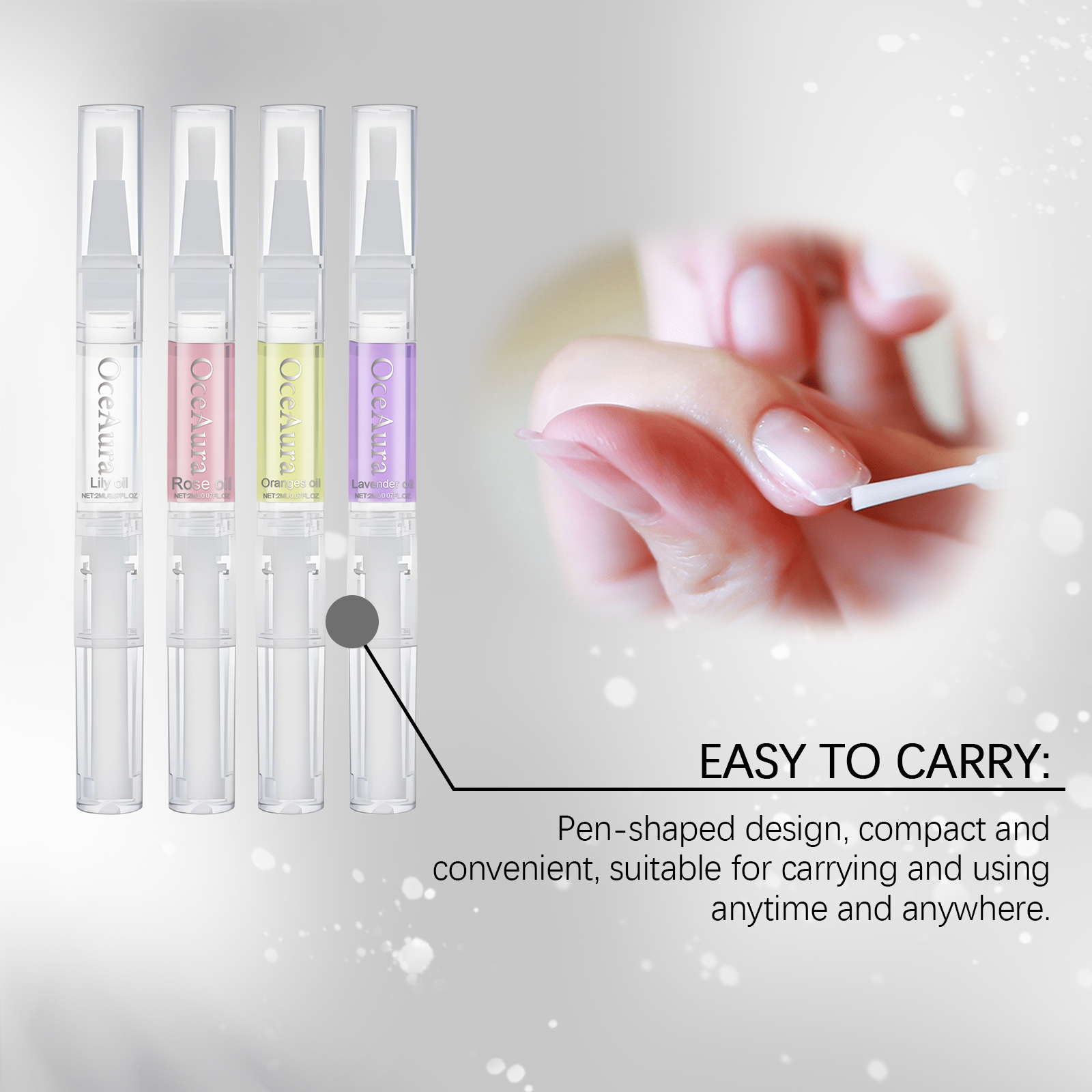 Our nail care nourishing oil pens contain glycerin and allantoin. It increases nail toughness and reduces breakage and delamination. Its use is simple: 1. Clean and dry the nails and the surrounding skin, trim and polish the edges of the nails if necessary to make them smooth, 2. Open the pen, rotate the bottom to let the cuticle oil flow out, then evenly apply to the nail, 3. Wait a few minutes for the cuticle oil to be absorbed. And it can repair the dry skin on the edge of the finger, keeping it smooth and tender.