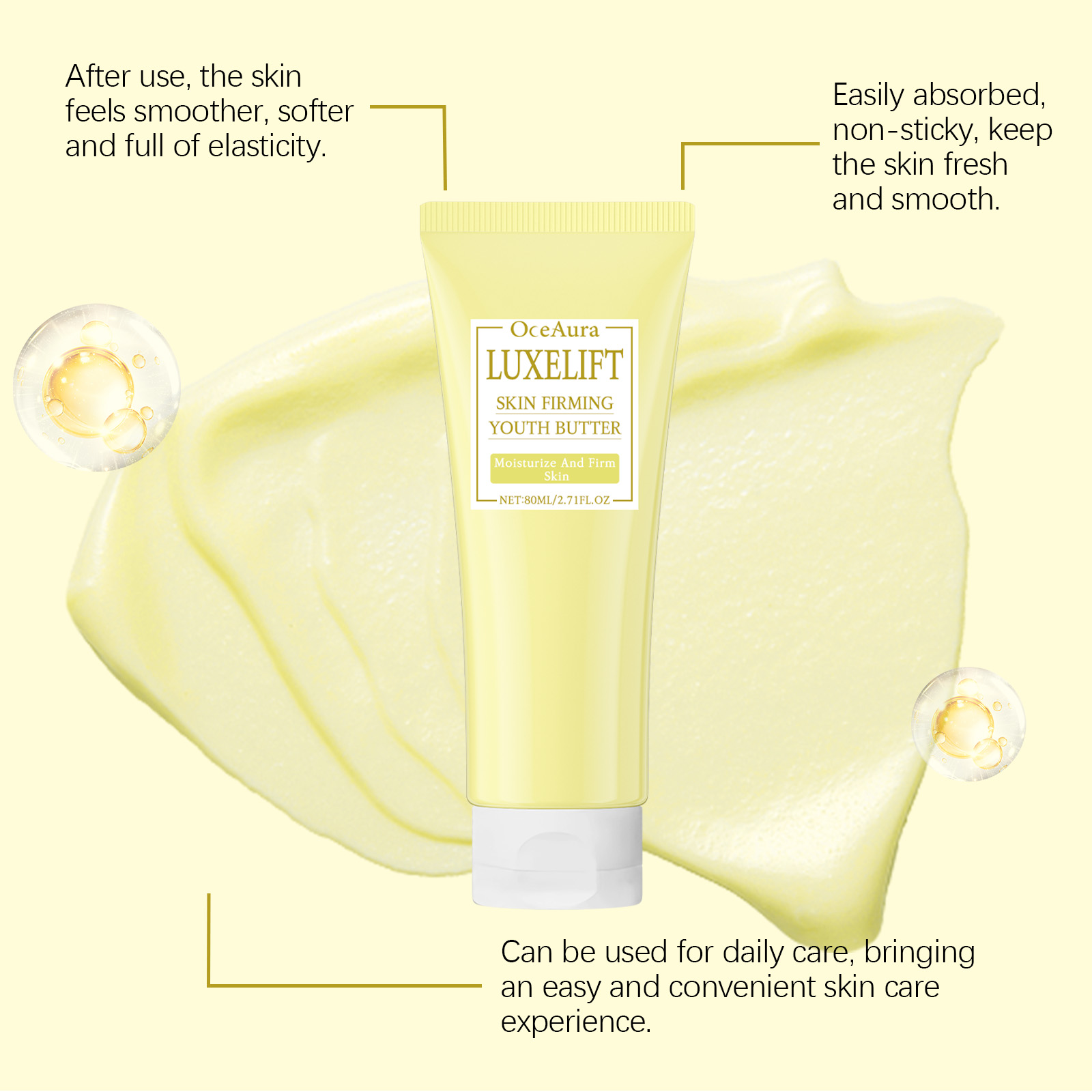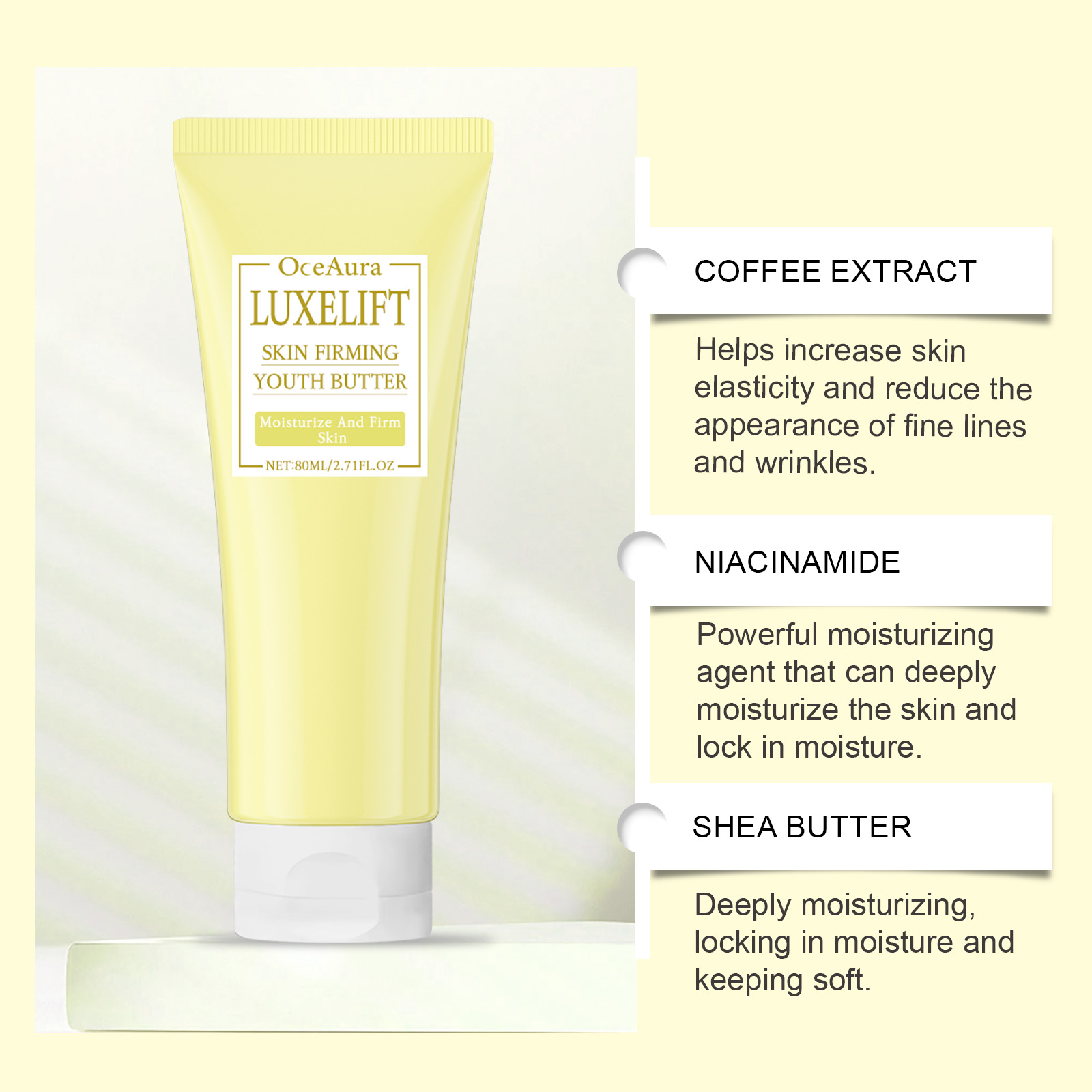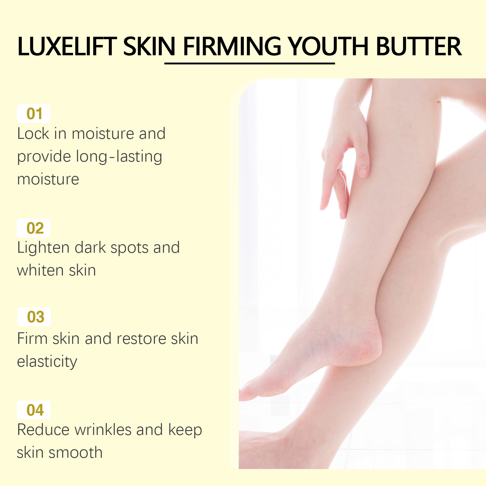 Our niacinamide firming body milk contains niacinamide, coffee extract, and hyaluronic acid. It can help the skin look firmer and more elastic, creating the perfect contour. Highly effective ingredients can lighten dark spots and age spots and whiten skin. Its application is simple: thoroughly clean the skin and dry it first. Apply appropriate amount of this product evenly on chest, buttocks, face and other parts and gently massage until completely absorbed. It also moisturizes effectively, helping the skin retain moisture for a long time and reducing dryness.