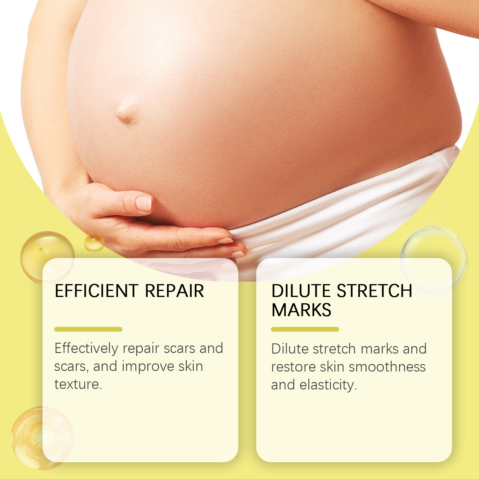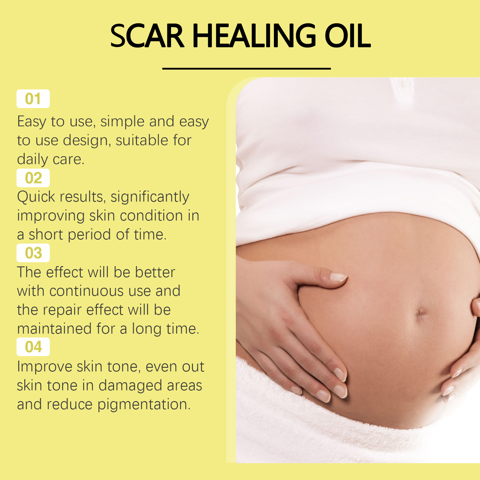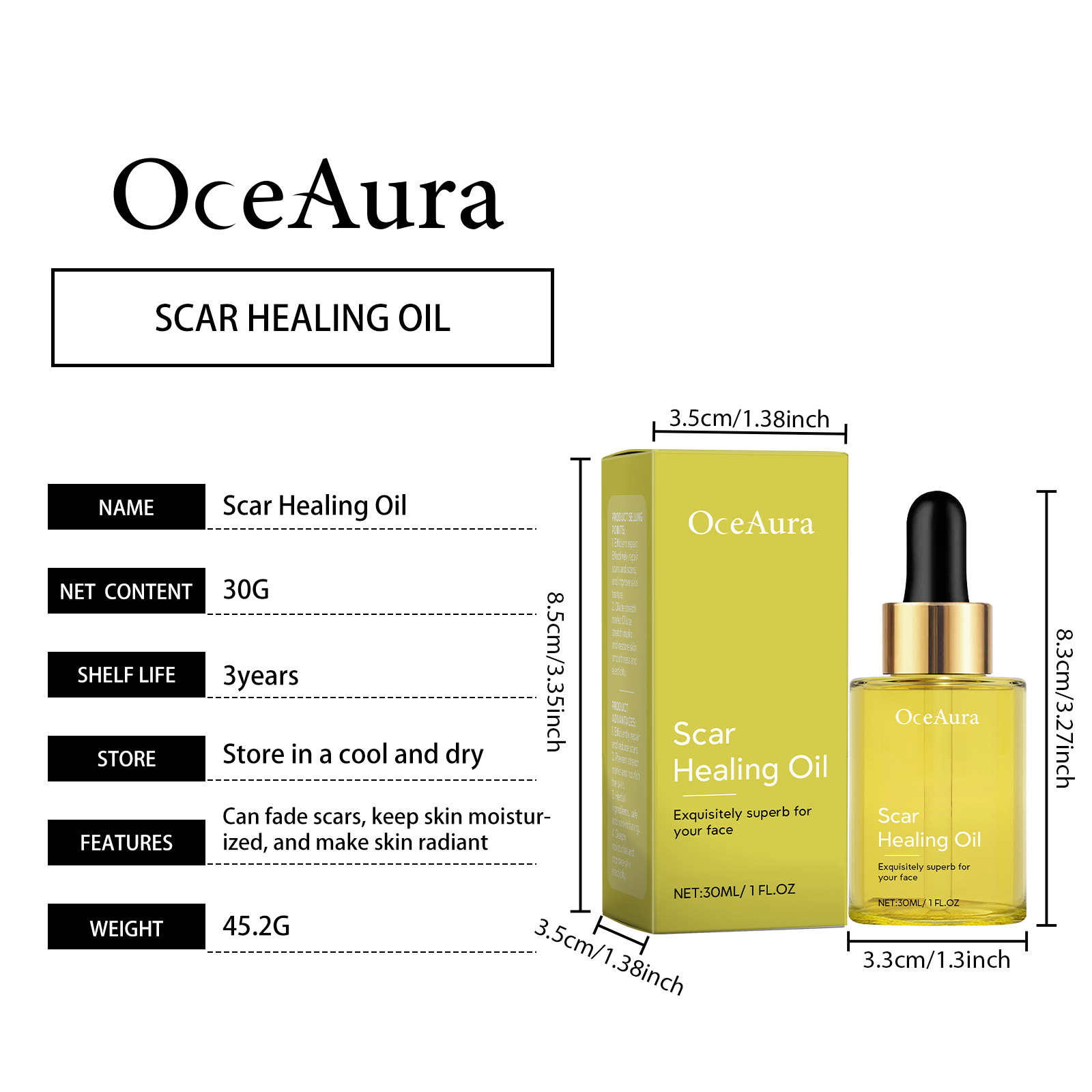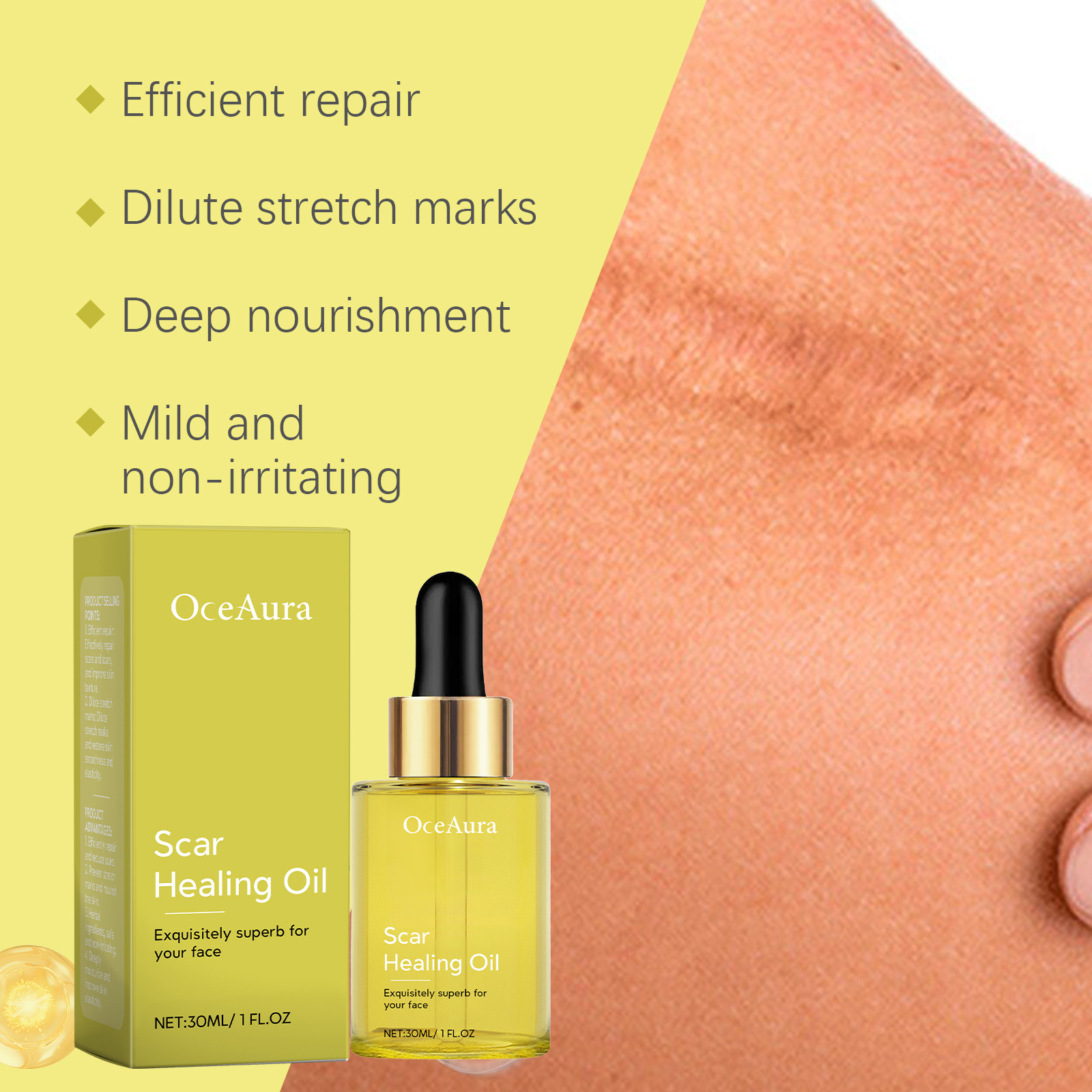 Our skin repair essential oil contains tocopherol (vitamin E), hyaluronic acid, and Asiaticum asiaticum extract. It can effectively repair scars and scars and improve skin texture. Fade stretch marks, keep skin smooth and elastic. Its use method is very simple: 1. First, clean the skin of the scar growth area; 2. Apply appropriate amount of the product evenly to the scar growth; 3. Gently massage until completely absorbed. Skin Repair essential oil is effective in repairing and reducing scars.