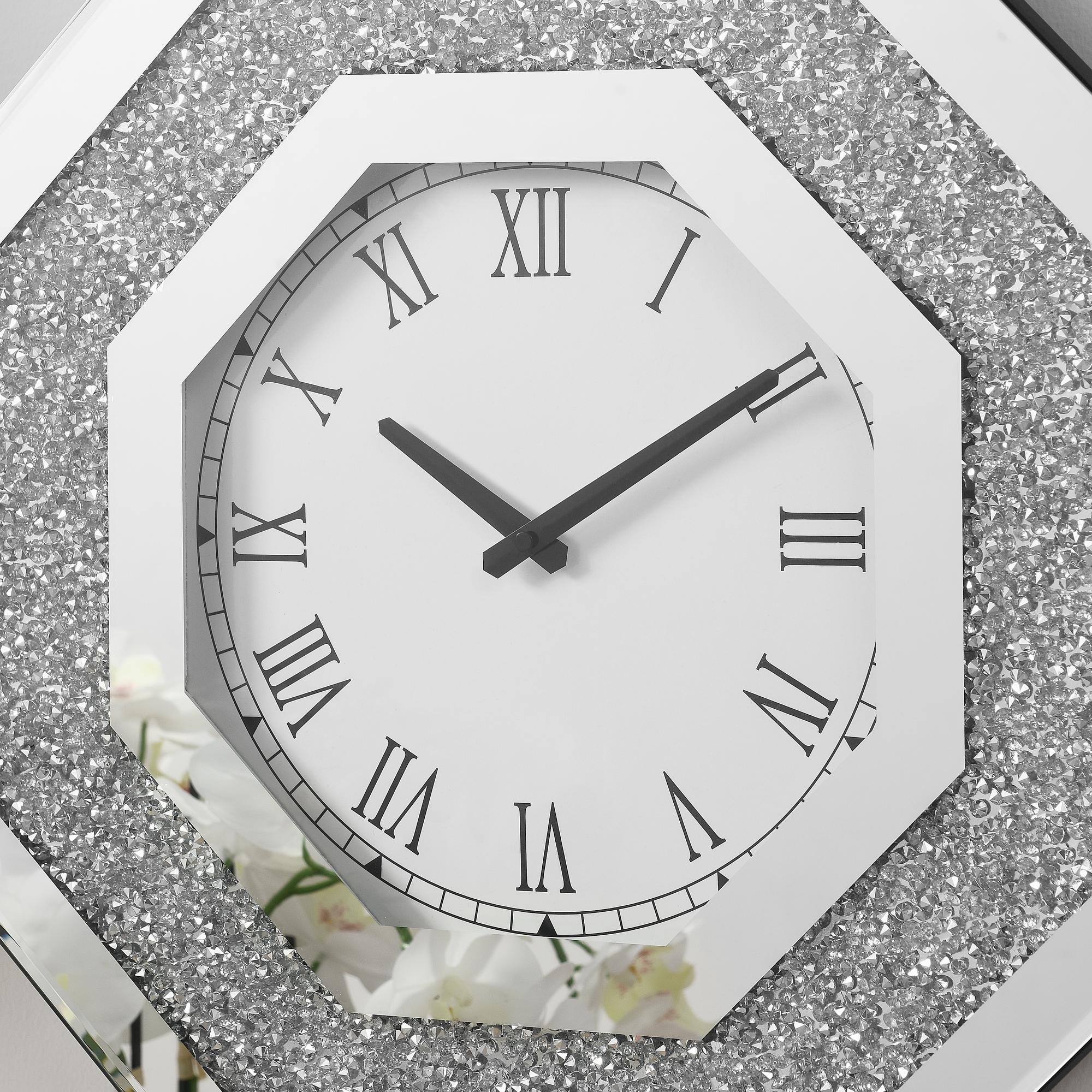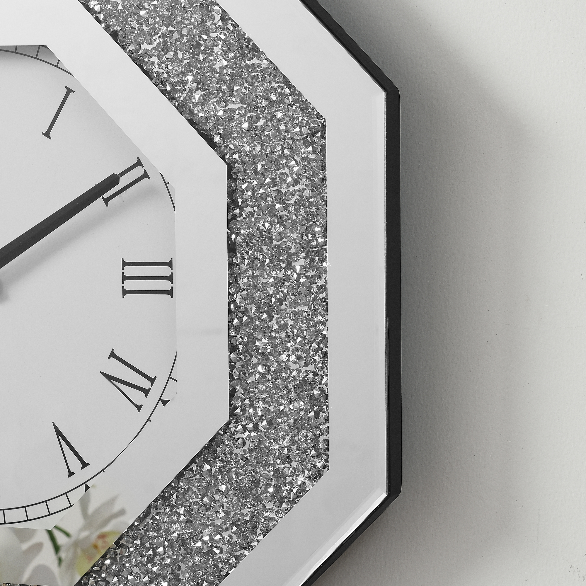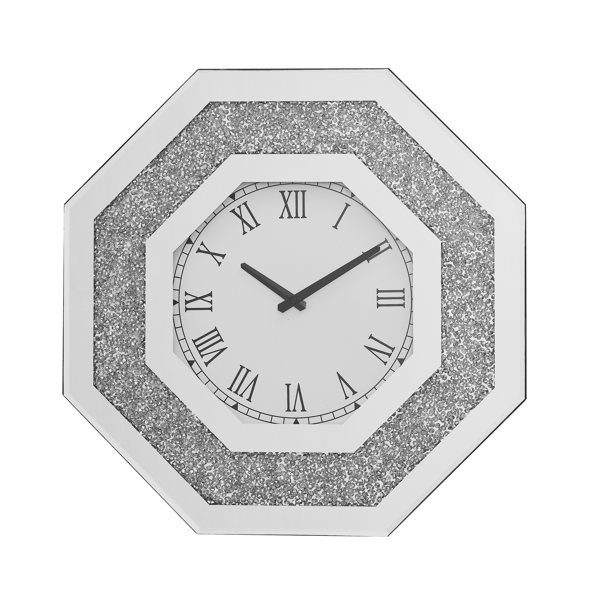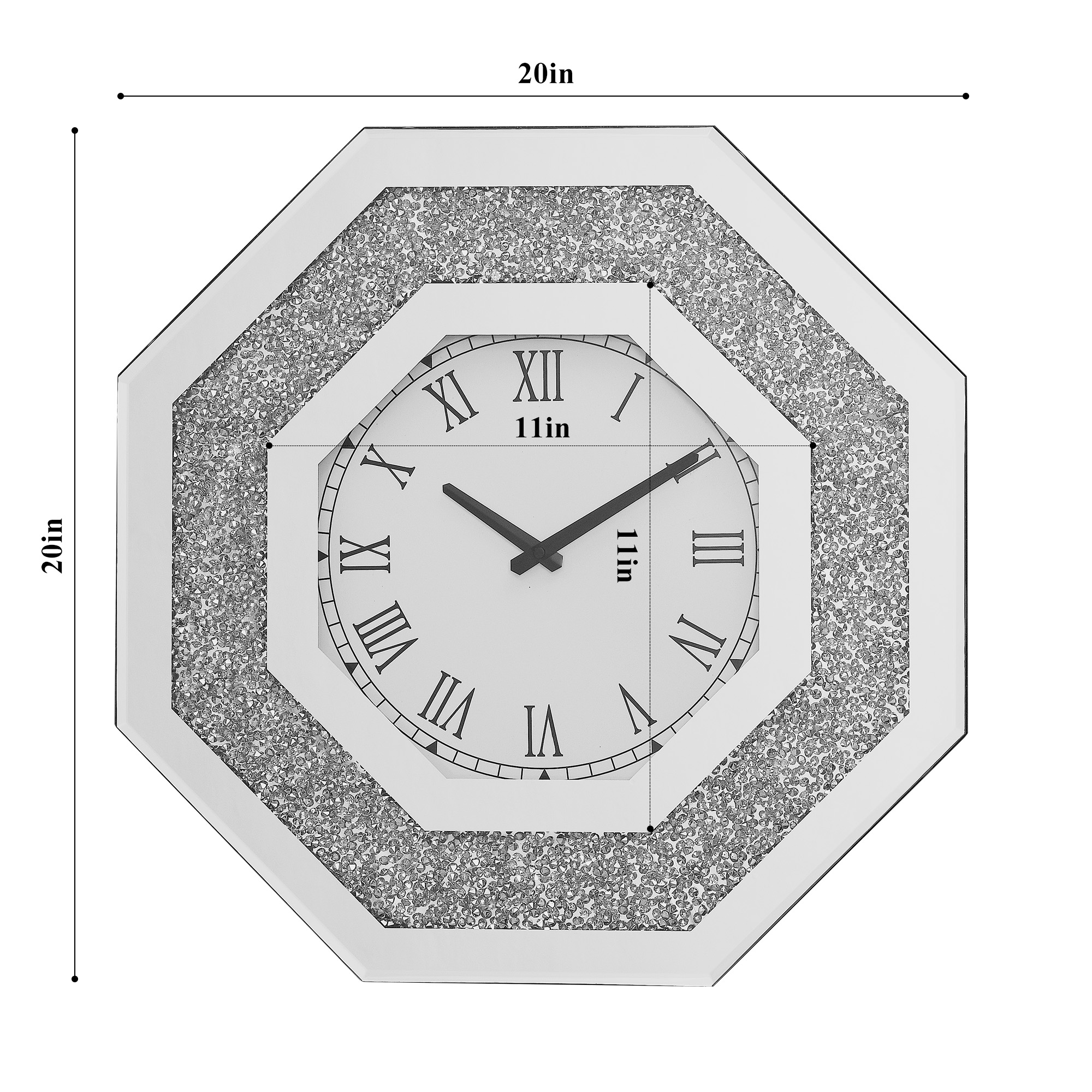 • Octagonal Wall Clock • Dial Numeral Type: Roman Numerals • Quartz Mechanism • Battery NOT Included (1Pc of AA 1.5V) • Back: Black Finish • (NO Sound/Chime)are Wall Clock • Mirror Trim, Beveled Edge, Clear Glass & Faux GemStones Inlay The octagonal floating sparkling crystal diamond wall clock is definitely the focus of any living room and room. This fashionable wall clock features an octagonal frame with black floating crystals set on a black background around the face. The clock face adopts Roman numerals, simple and modern.