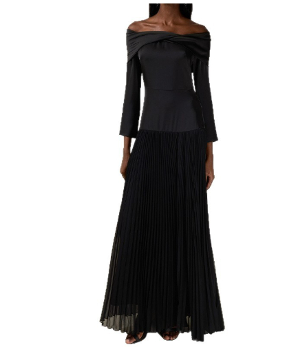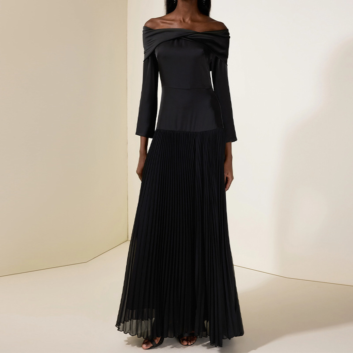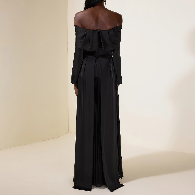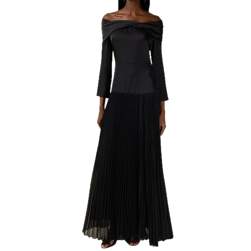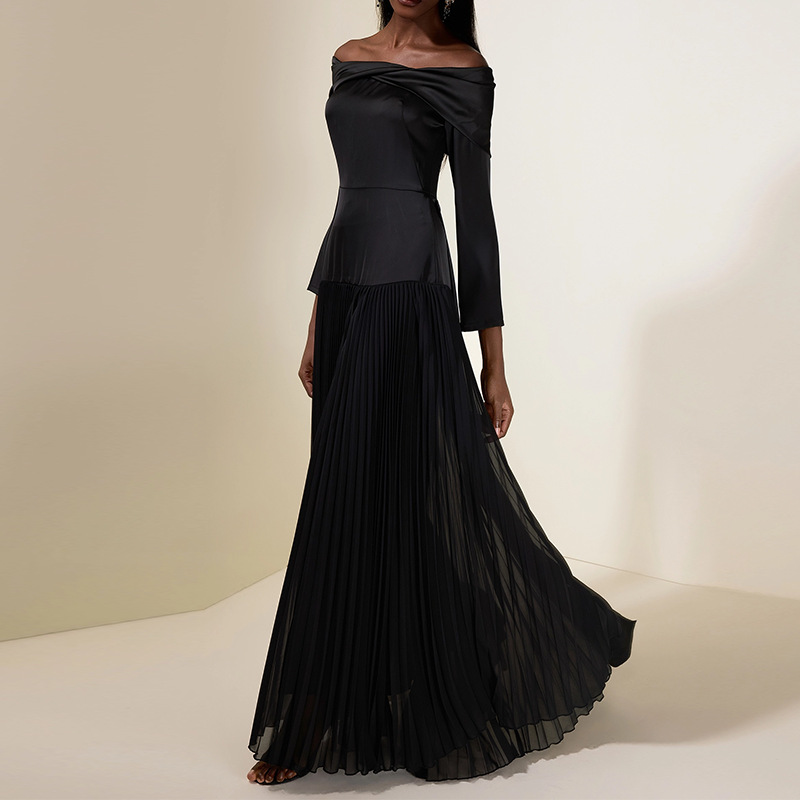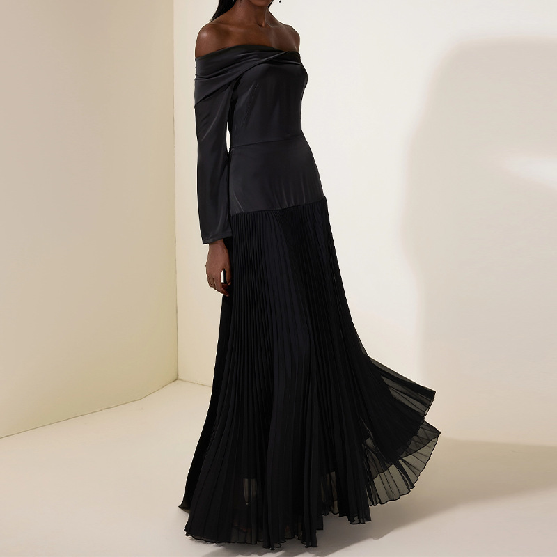 Off-shoulder Long-sleeve Slim-fit Black Patchwork Dress