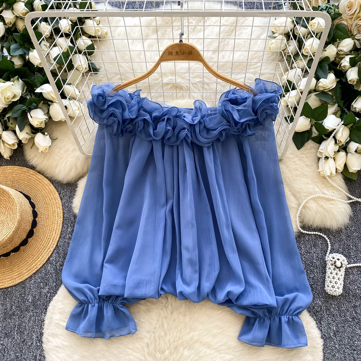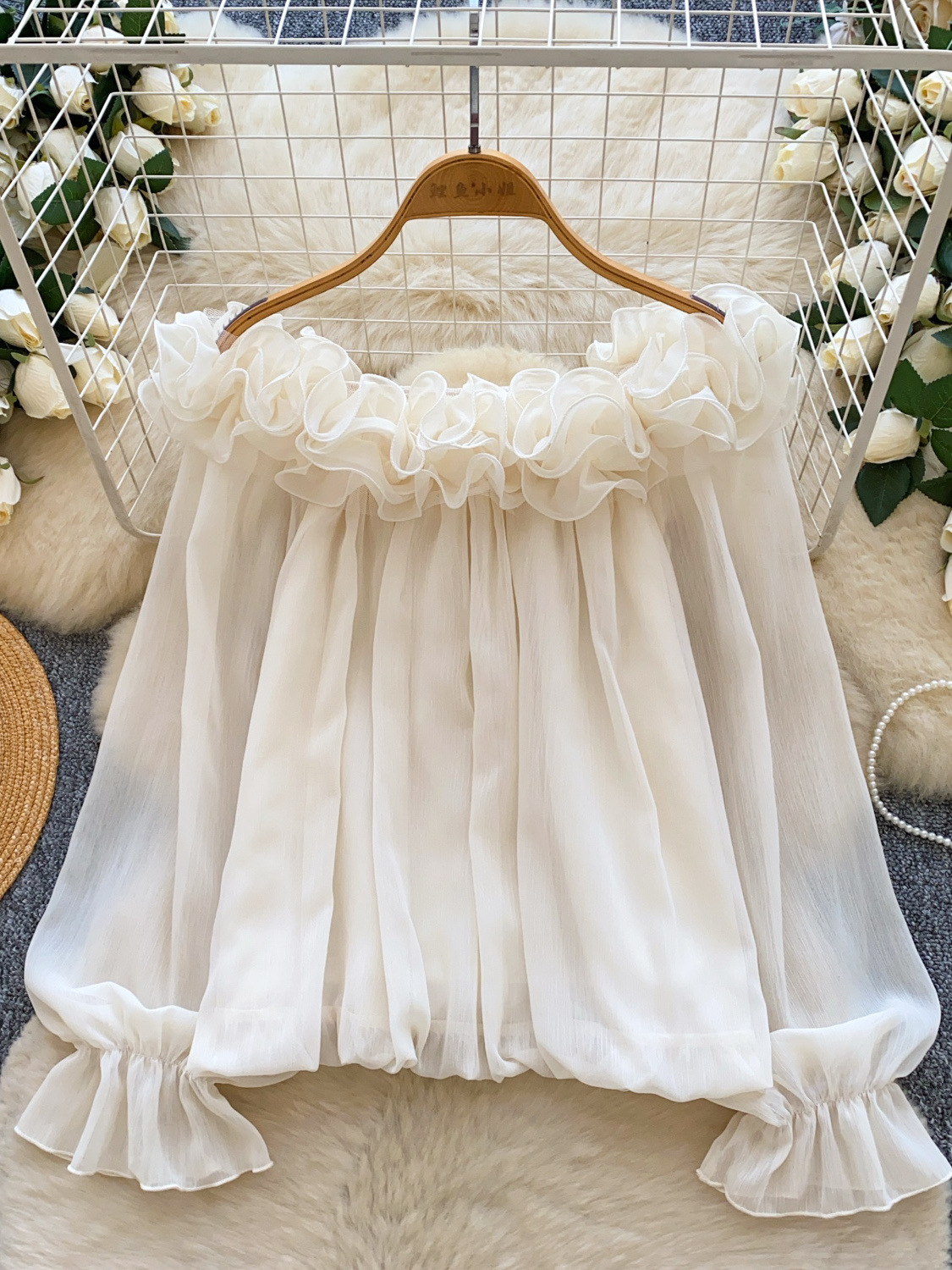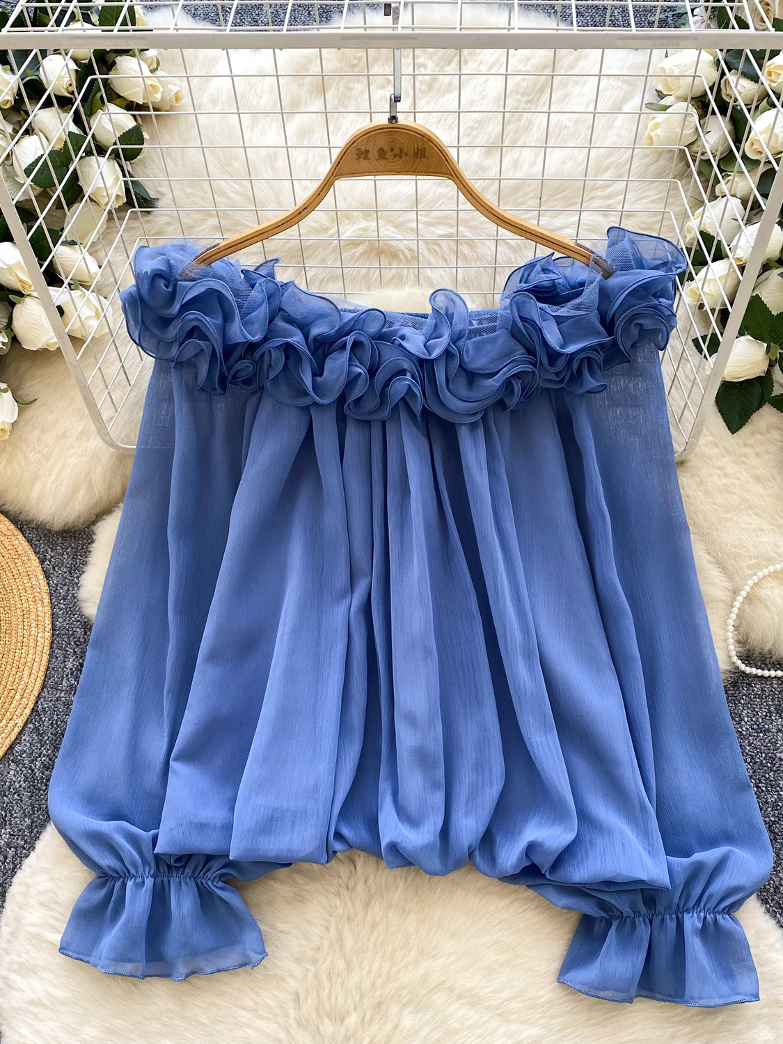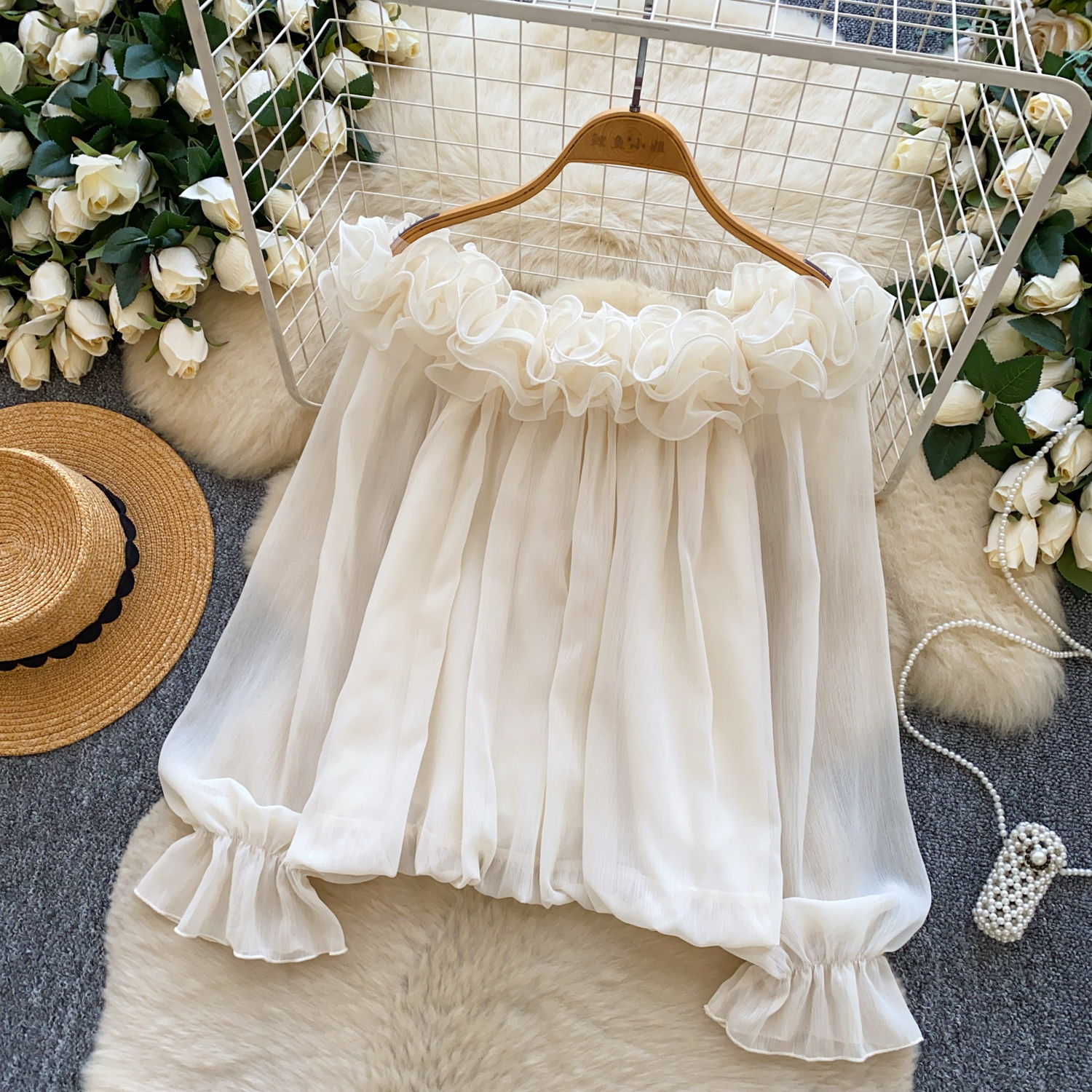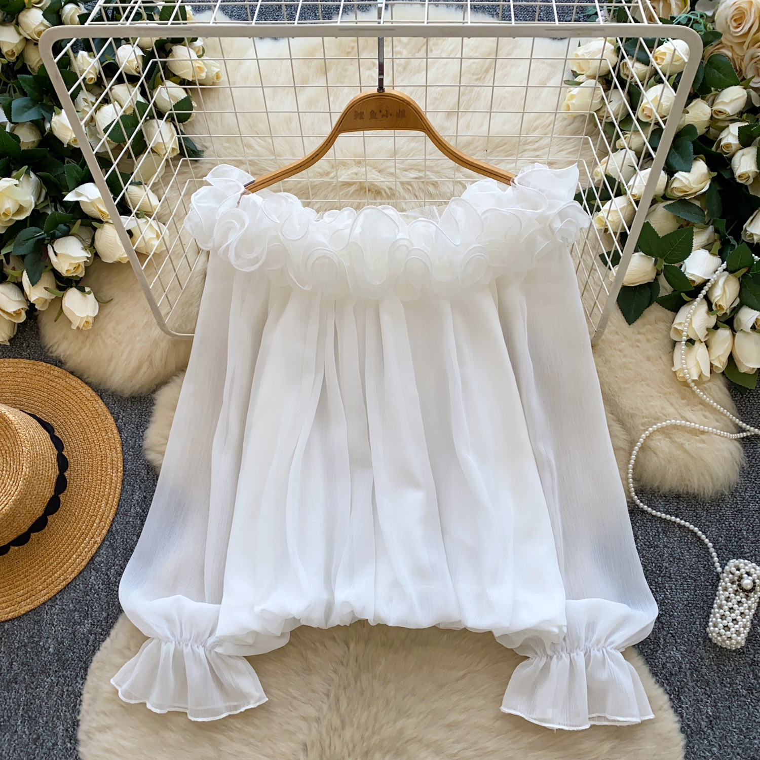 Off-Shoulder Ruffle-trimmed Panel Long-sleeve Chiffon Shirt For Women