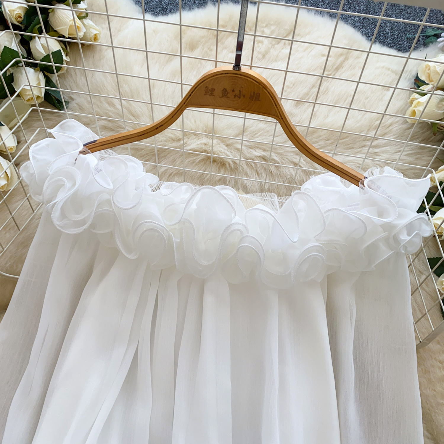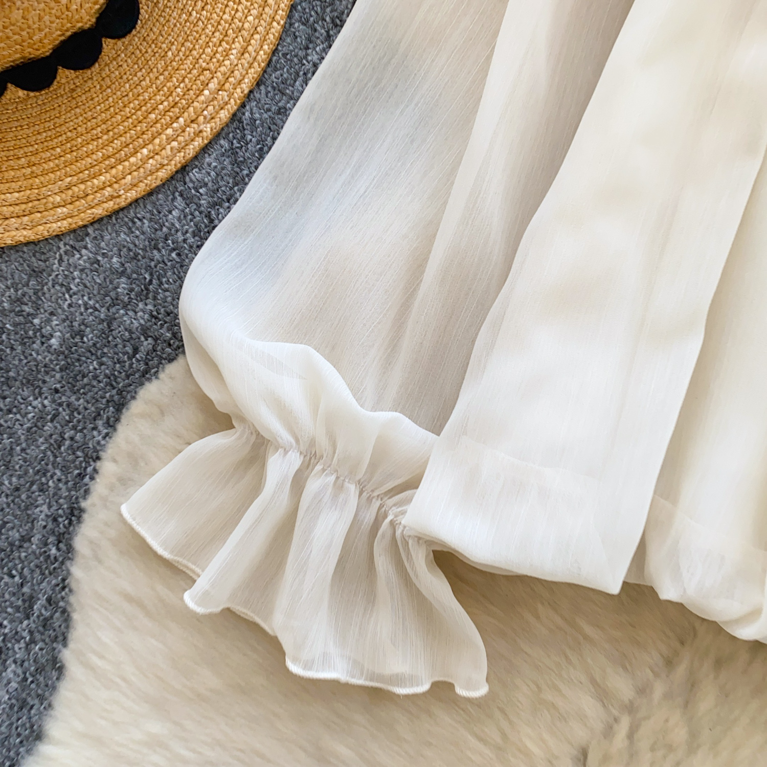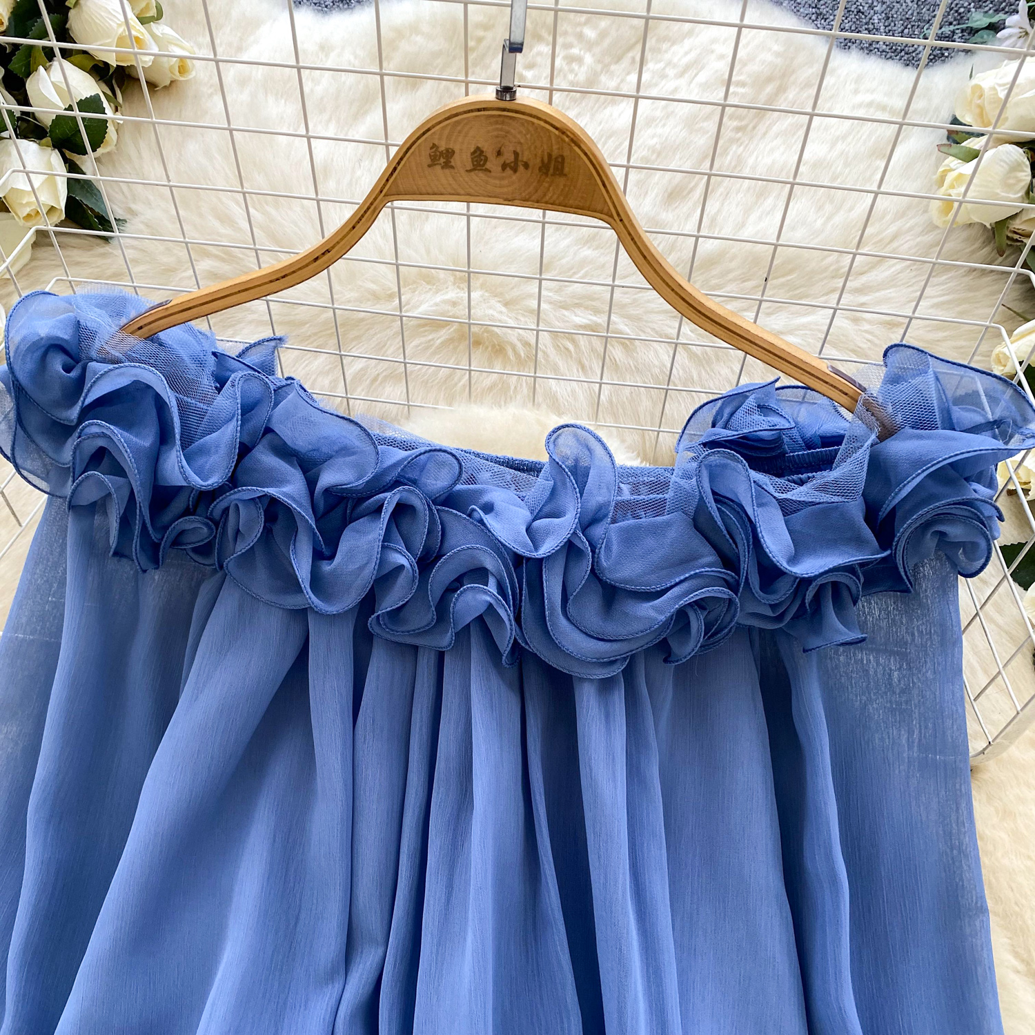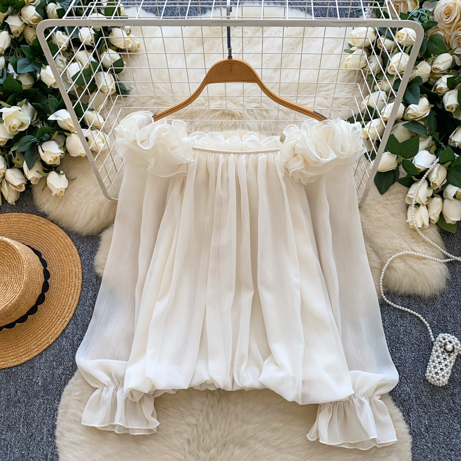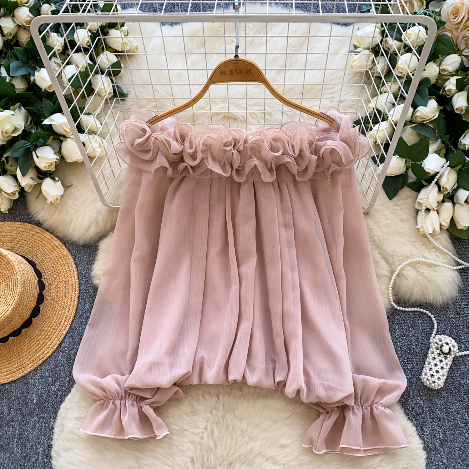 Off-Shoulder Ruffle-trimmed Panel Long-sleeve Chiffon Shirt For Women