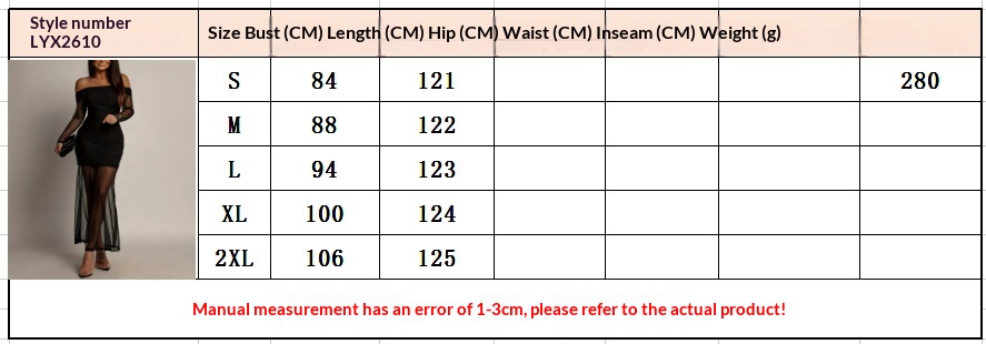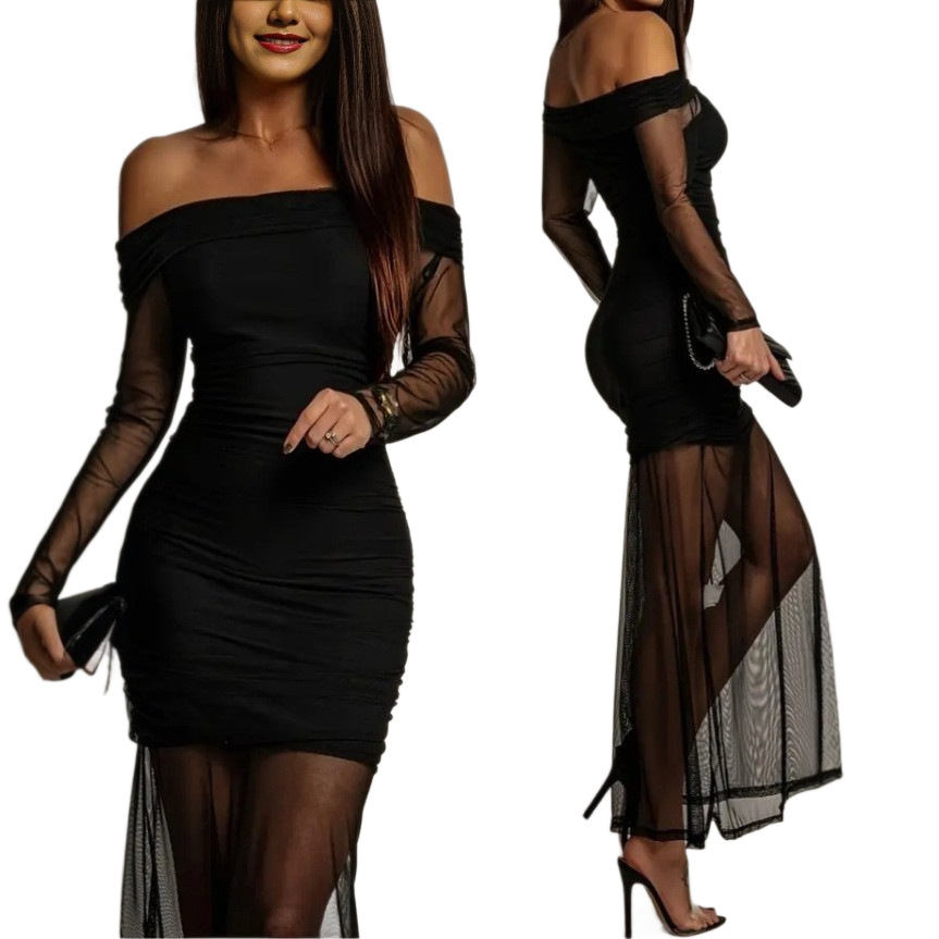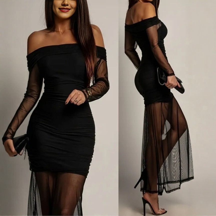 Fashion elements: Sheer fabric, off-the-shoulder design