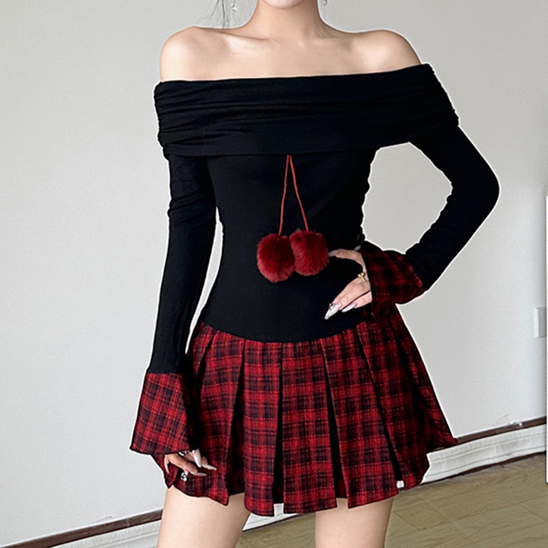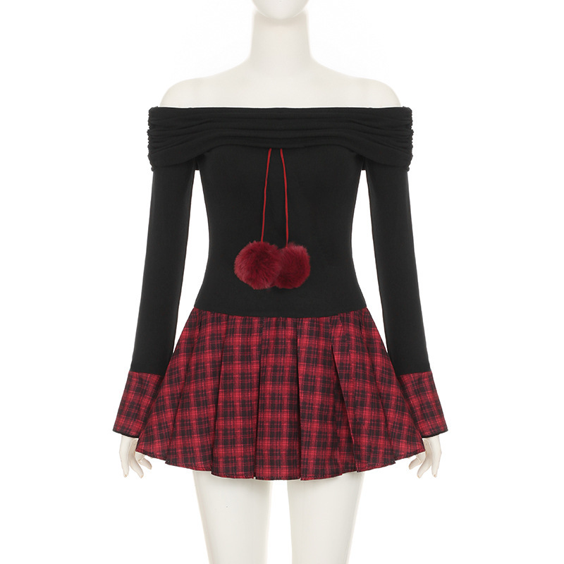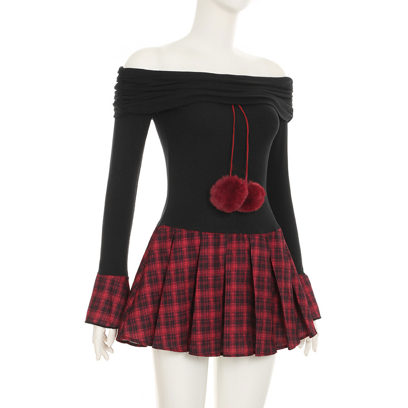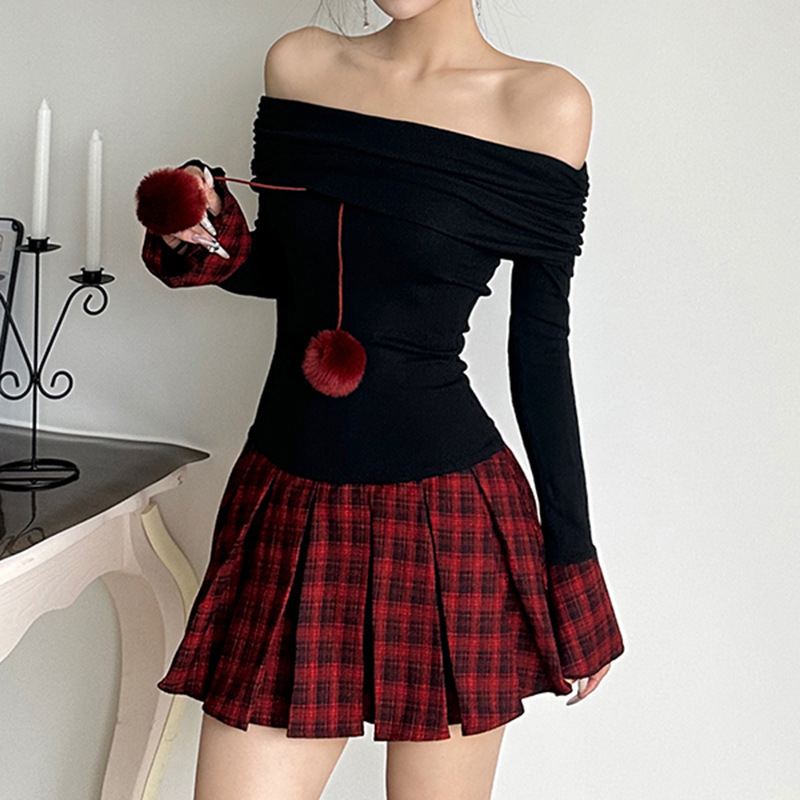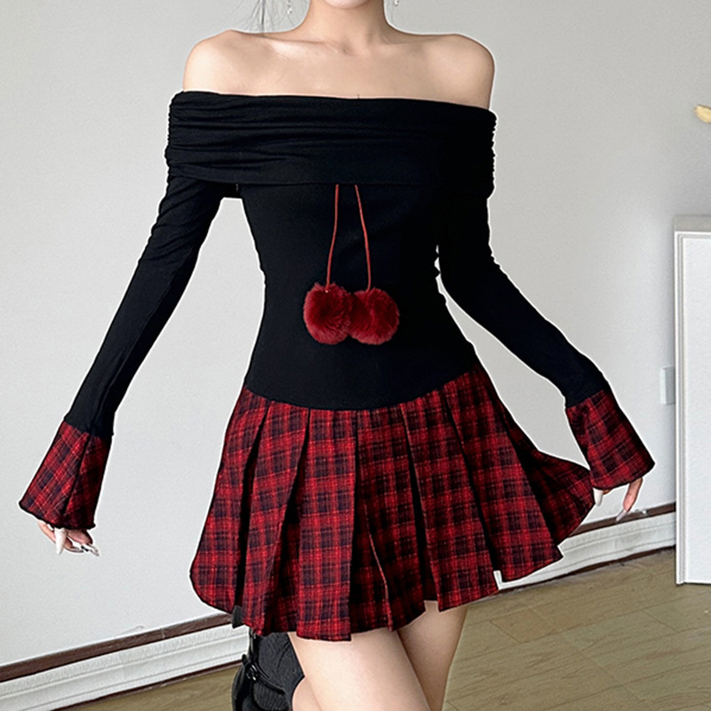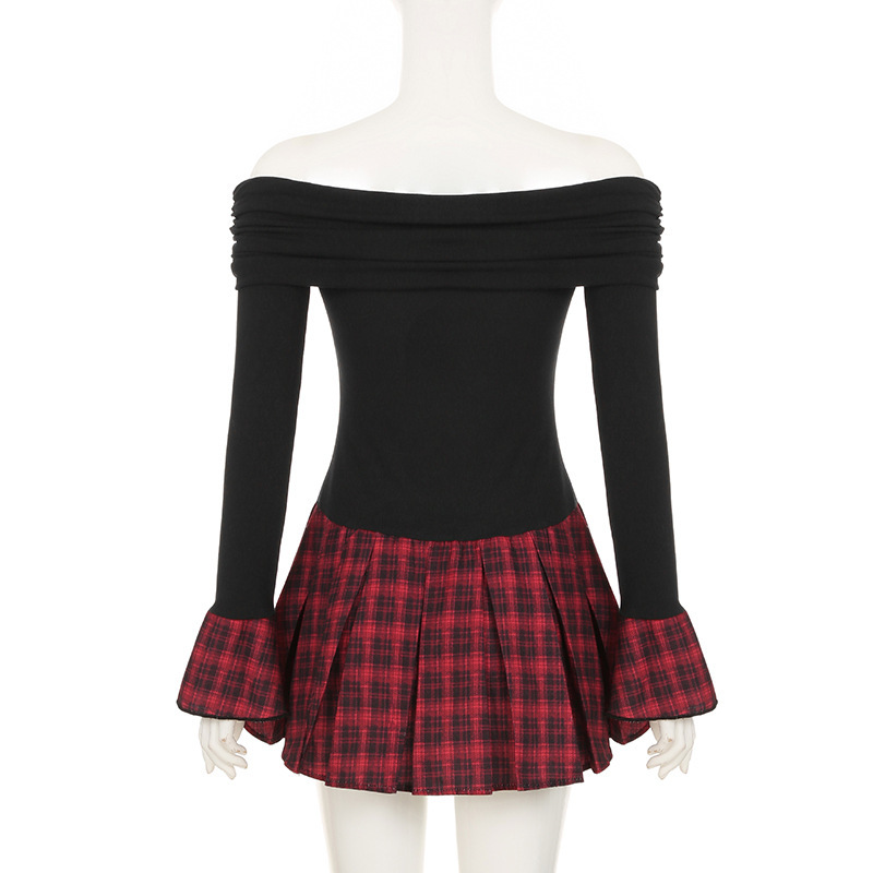 Off-the-shoulder Waist-cinched Figure-flattering Knitted Plaid Pleated Sexy Dress