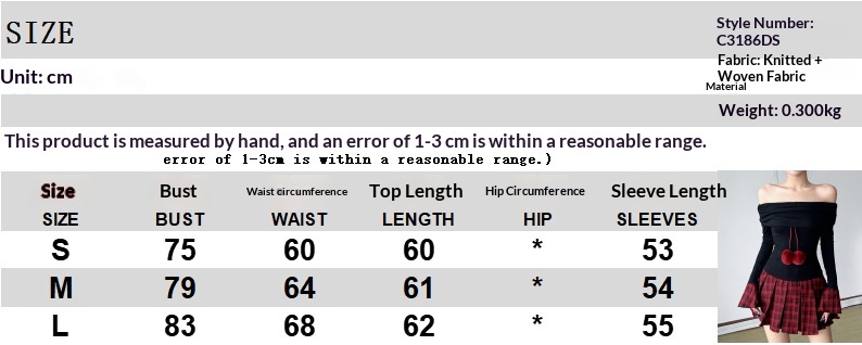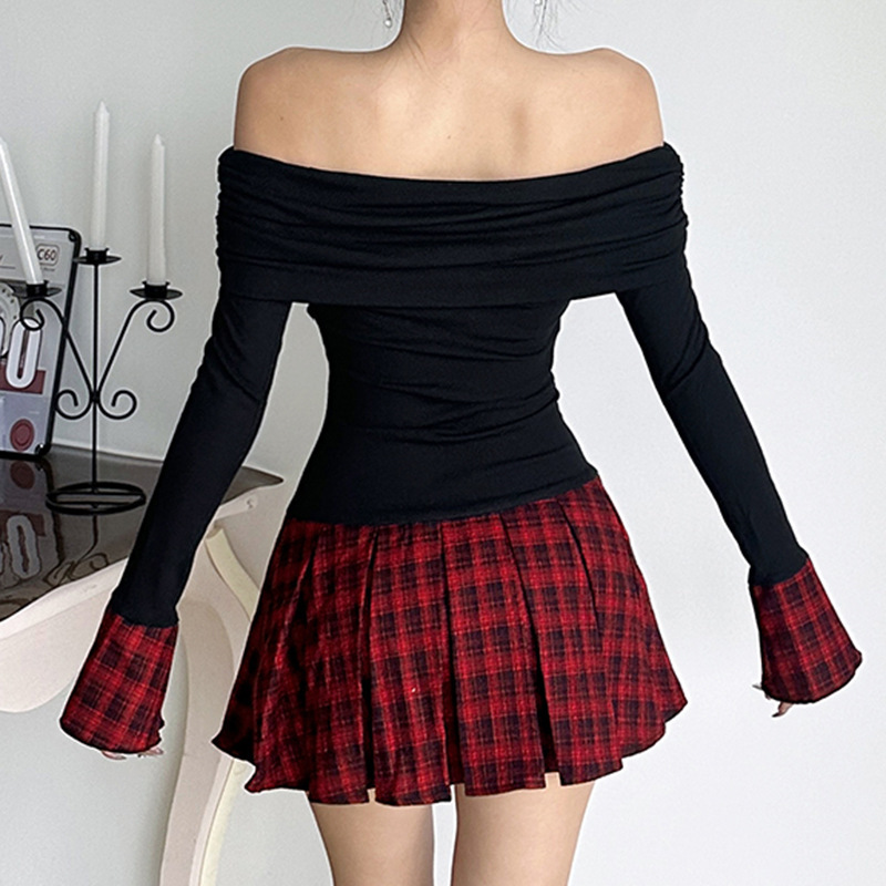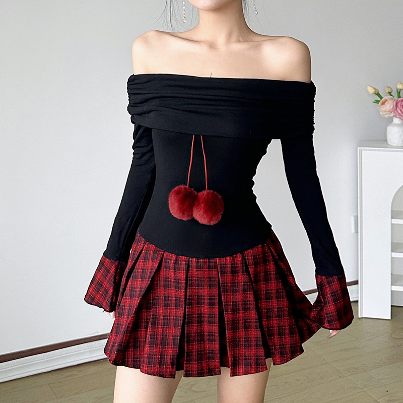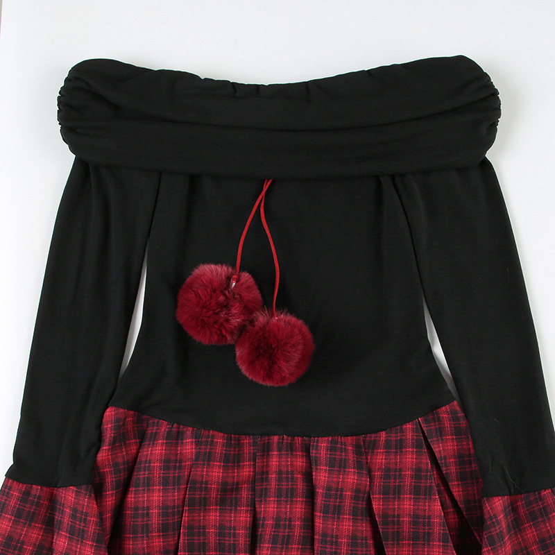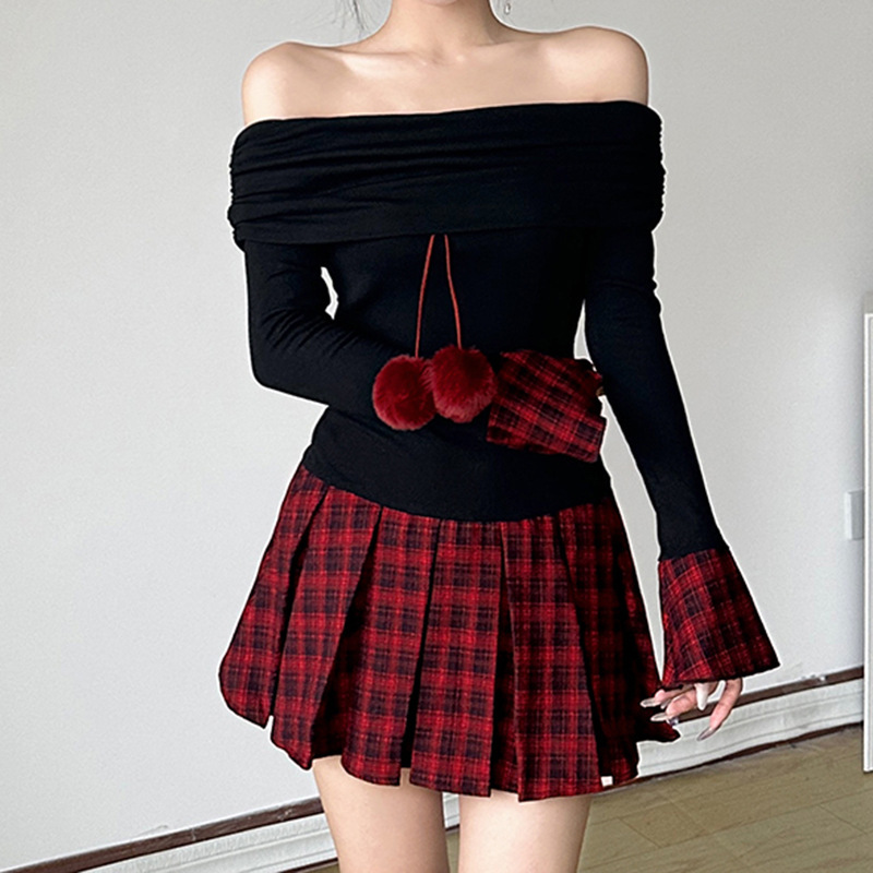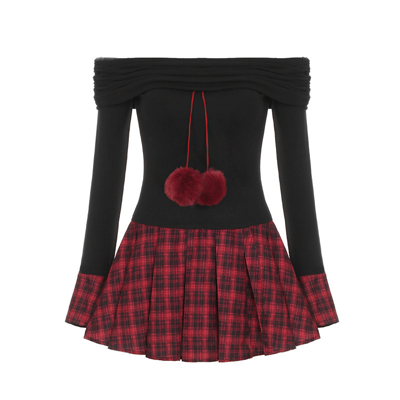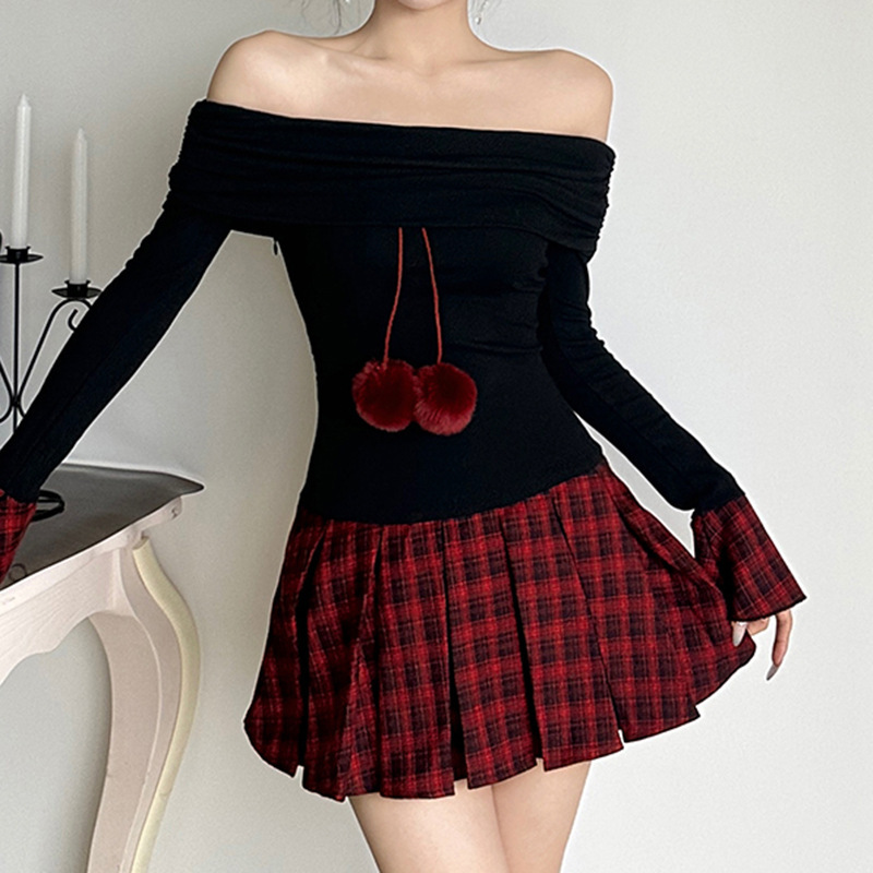 Off-the-shoulder Waist-cinched Figure-flattering Knitted Plaid Pleated Sexy Dress